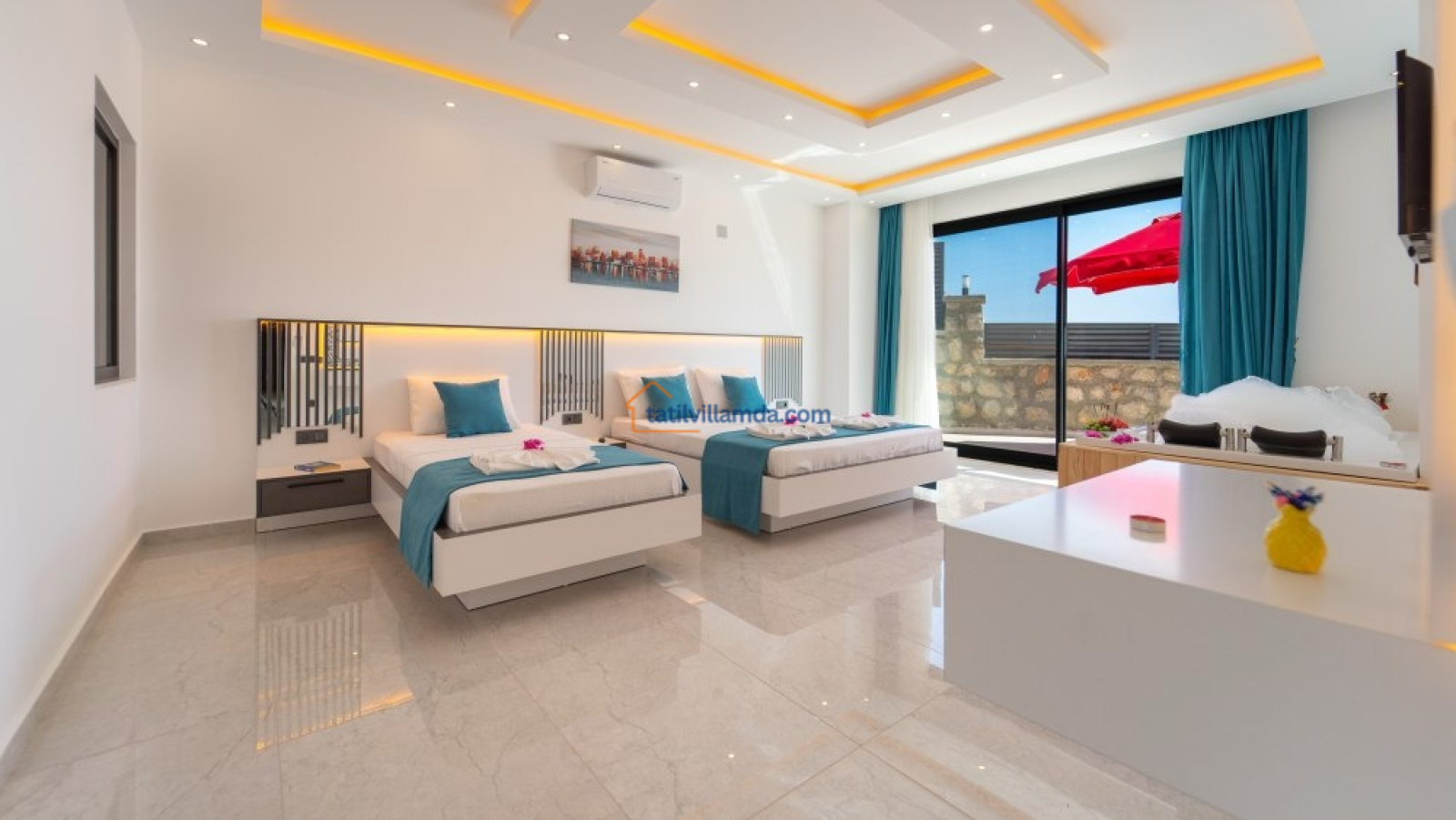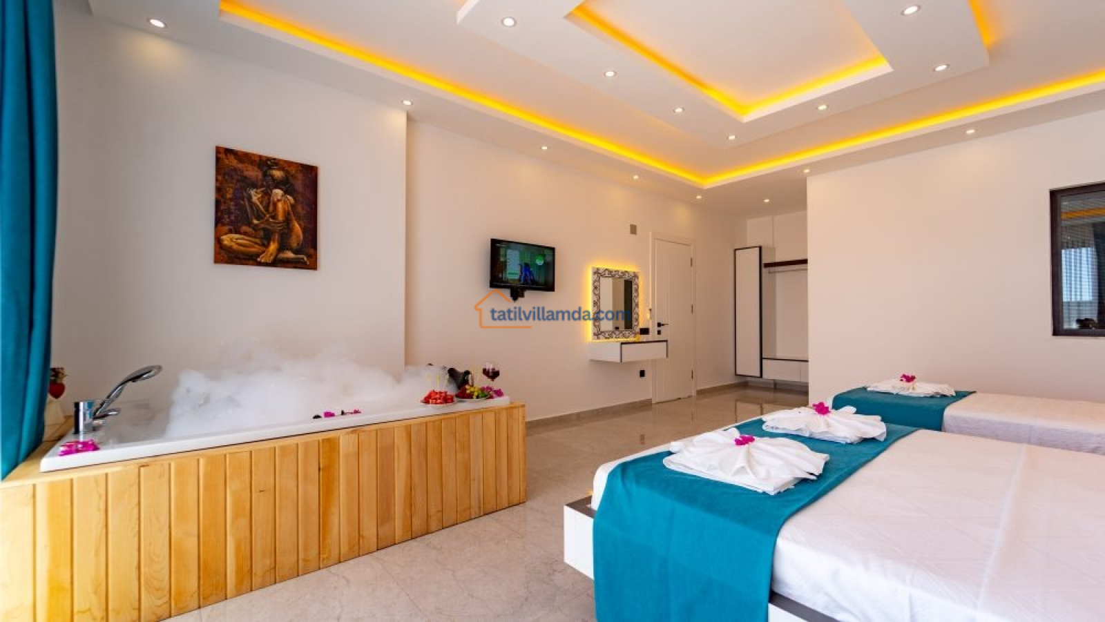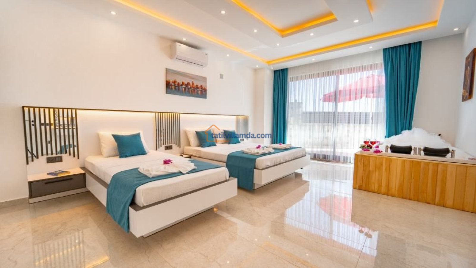 Villada 2 yatak odası bulunmakta olup, her iki odada da jakuzi mevcuttur. Yatak odalarında 2 çift kişilik yatak ve 1 tek kişilik yatak yer alır. Bu sayede hem aileler hem de arkadaş grupları için rahat bir konaklama alanı sunar.