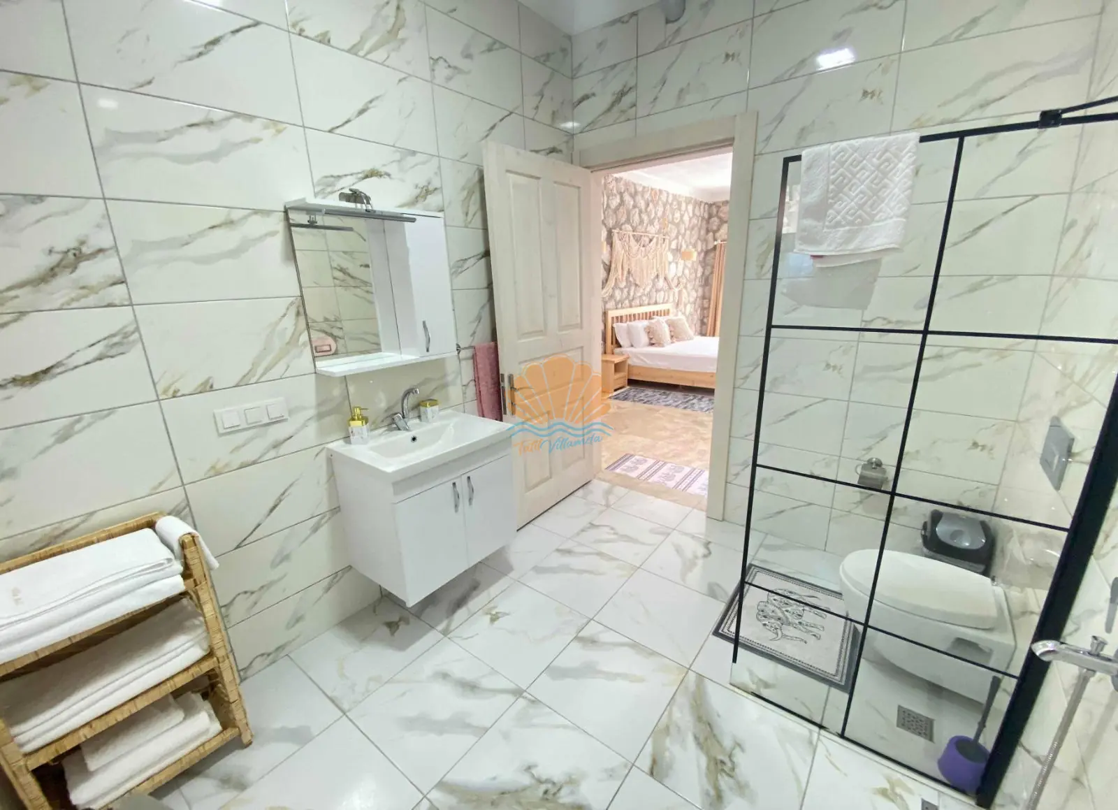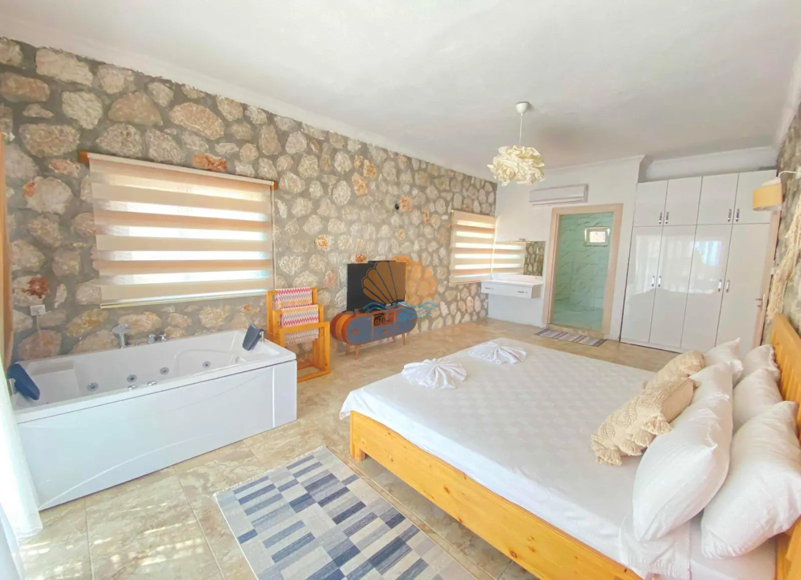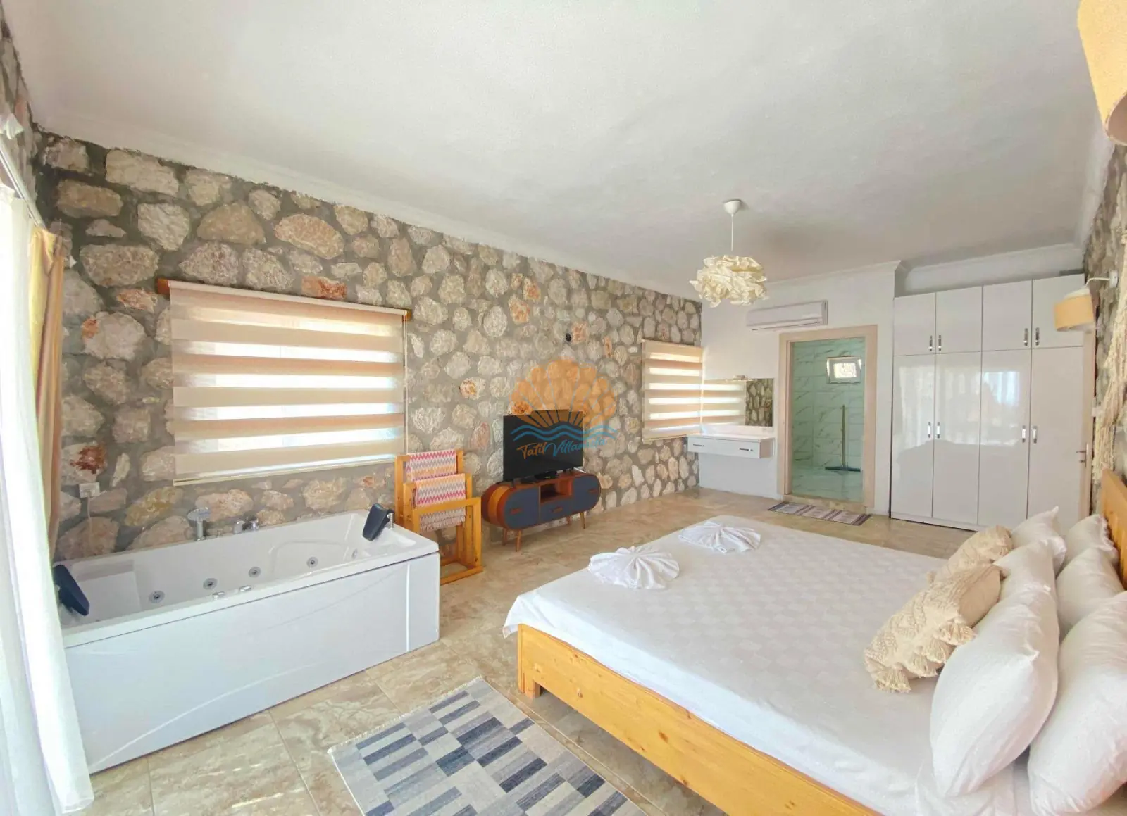 İç mekânda modern ve konforlu bir şekilde dekore edilmiş yatak odasında jakuzi yer almakta olup, romantik anlarınıza eşlik edecek şekilde tasarlanmıştır. Villa içerisinde ihtiyacınız olan tüm temel eşyalar düşünülmüş olup, konforlu bir konaklama sunar.