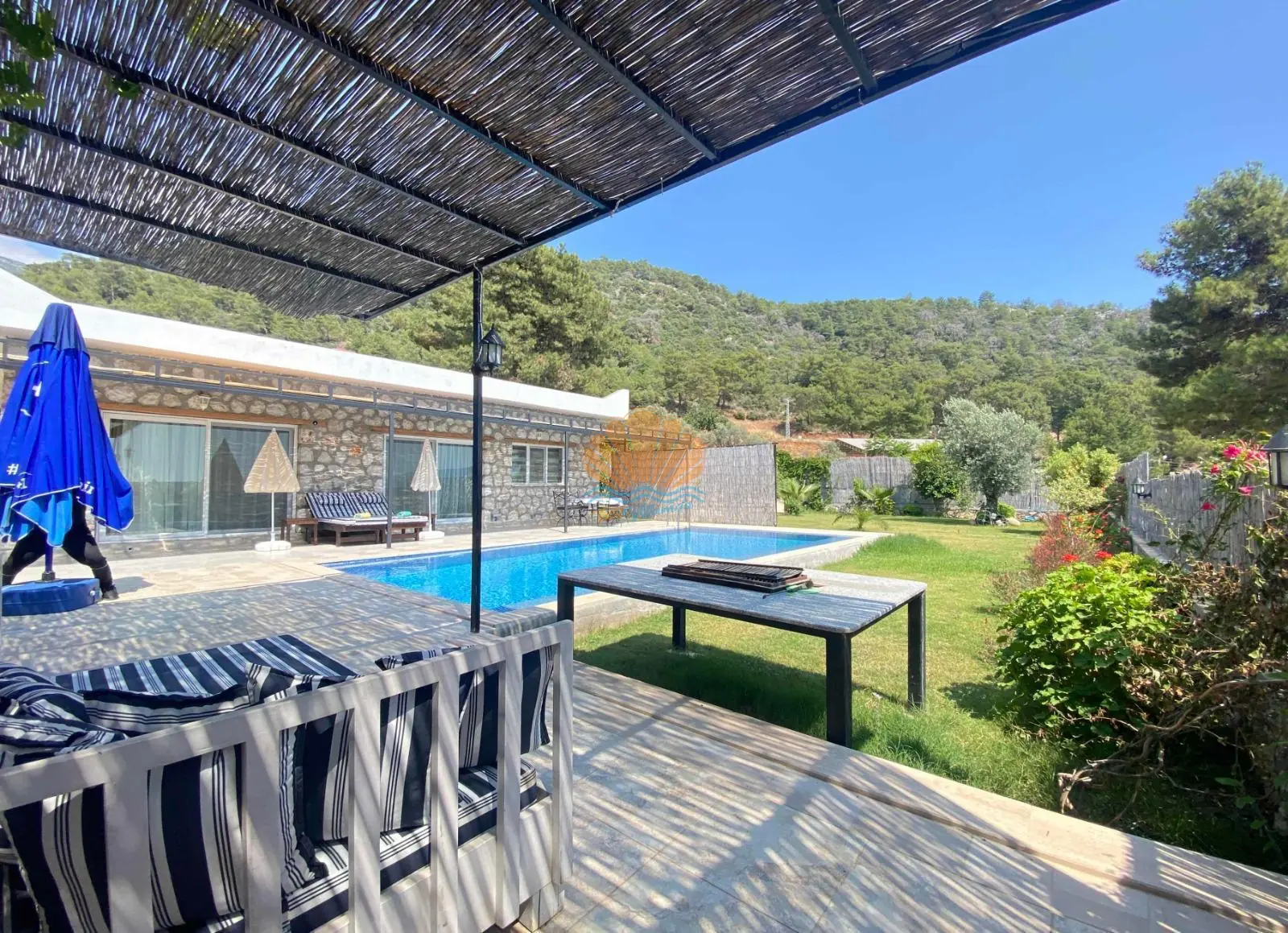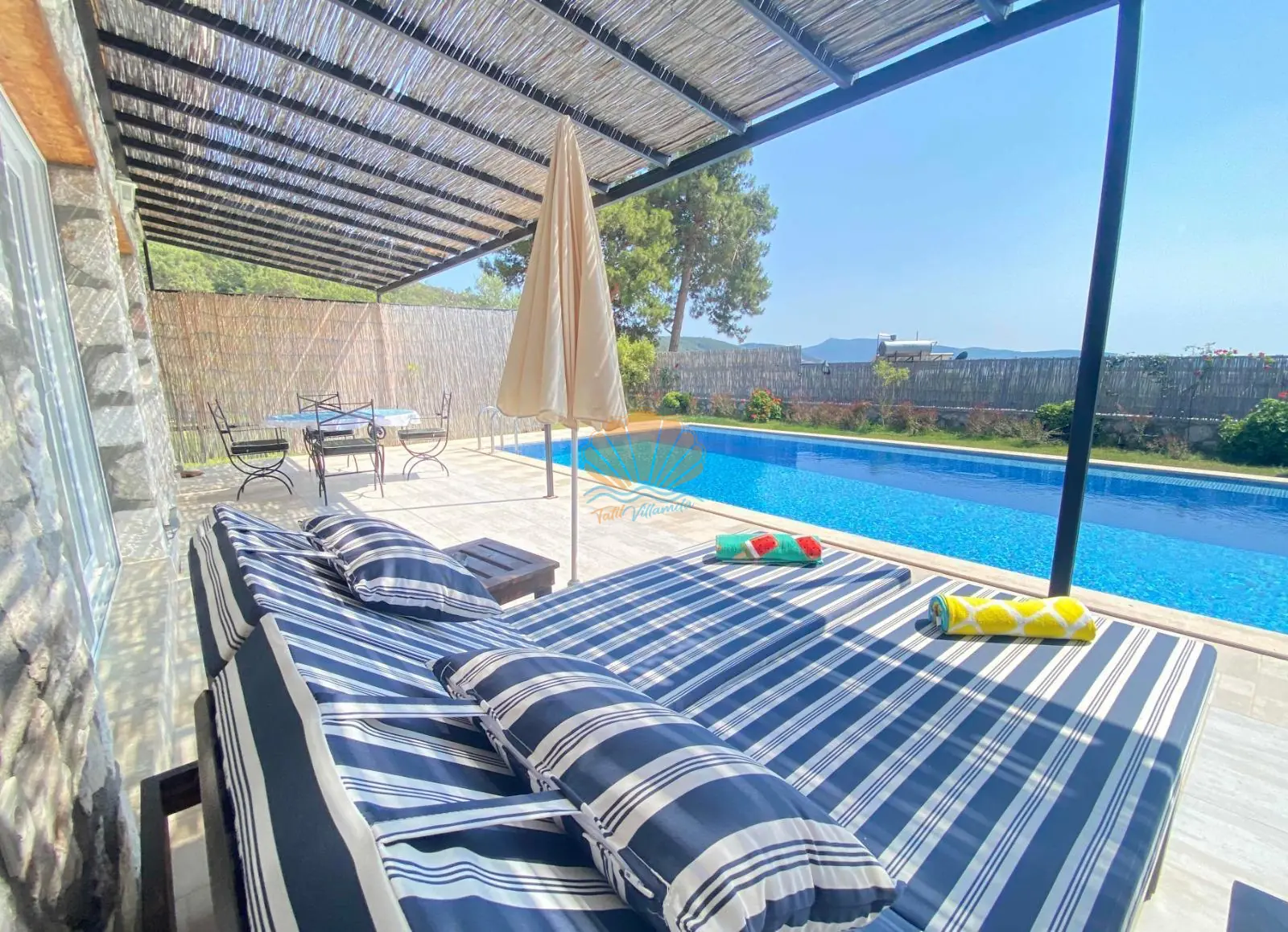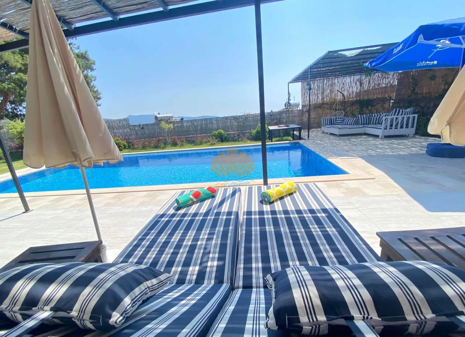 Villanın en dikkat çekici özelliklerinden biri tamamen korunaklı ve geniş özel havuzudur. Dışarıdan görünmeyen yapısı sayesinde gözlerden uzak, rahat bir tatil deneyimi sunar. Havuz başında şezlonglar, şemsiye, çardak ve keyifle vakit geçirebileceğiniz bahçe oturma köşesi bulunmaktadır. Geniş bahçesi, doğa ile baş başa huzurlu anlar yaşamak isteyen misafirler için ideal bir ortam oluşturur.