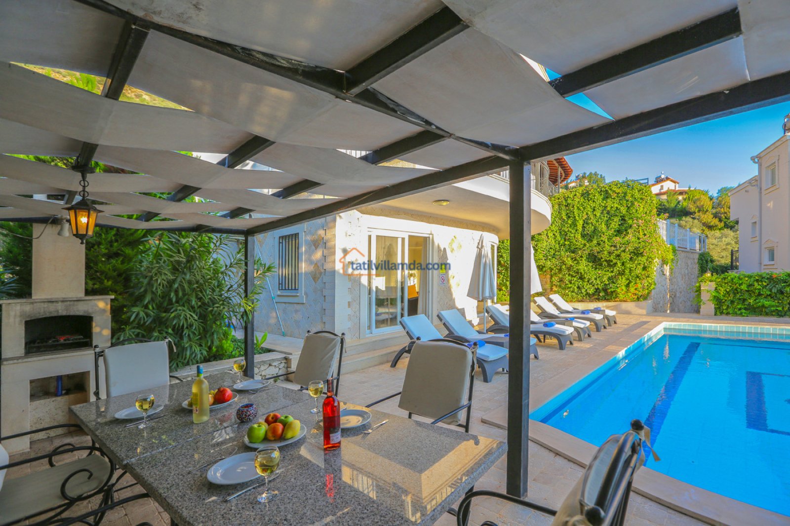 Havuz başında şezlong, şemsiye, masa takımı ve barbekü alanı yer almaktadır. Misafirler gün boyu güneşlenebilir, havuz keyfi yapabilir veya akşam saatlerinde barbekü eşliğinde manzaralı keyifli bir akşam geçirebilir. Doğa ve deniz manzarasına karşı huzurlu bir tatil deneyimi sunan Villa Sarnıç, Kalkan’da keyifli bir konaklama arayan herkes için ideal bir tercihtir.
