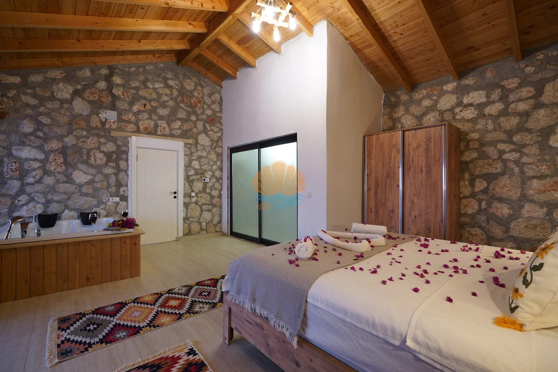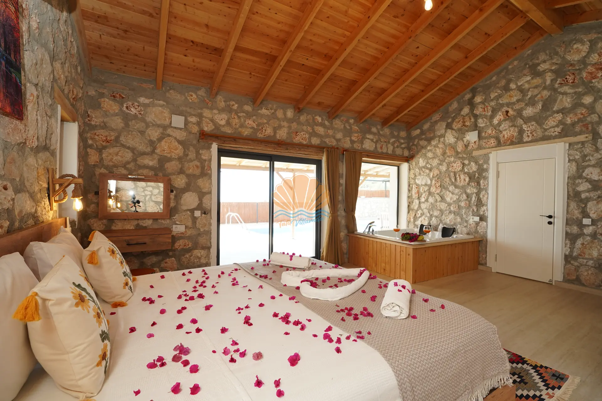 2 yatak odasına sahip olan villa, toplamda 4 kişilik konaklama kapasitesine sahiptir. Odaların tamamı ebeveyn banyolu olup misafirlere maksimum konfor ve mahremiyet sunar. Ayrıca villada yer alan jakuzi, günün yorgunluğunu atmak ve rahatlamak isteyen misafirler için keyifli bir ayrıcalık sağlamaktadır. İç dekorasyonda modern ve şık detaylar tercih edilmiş olup, ihtiyaç duyulabilecek tüm ekipmanlar eksiksiz şekilde sunulmuştur.