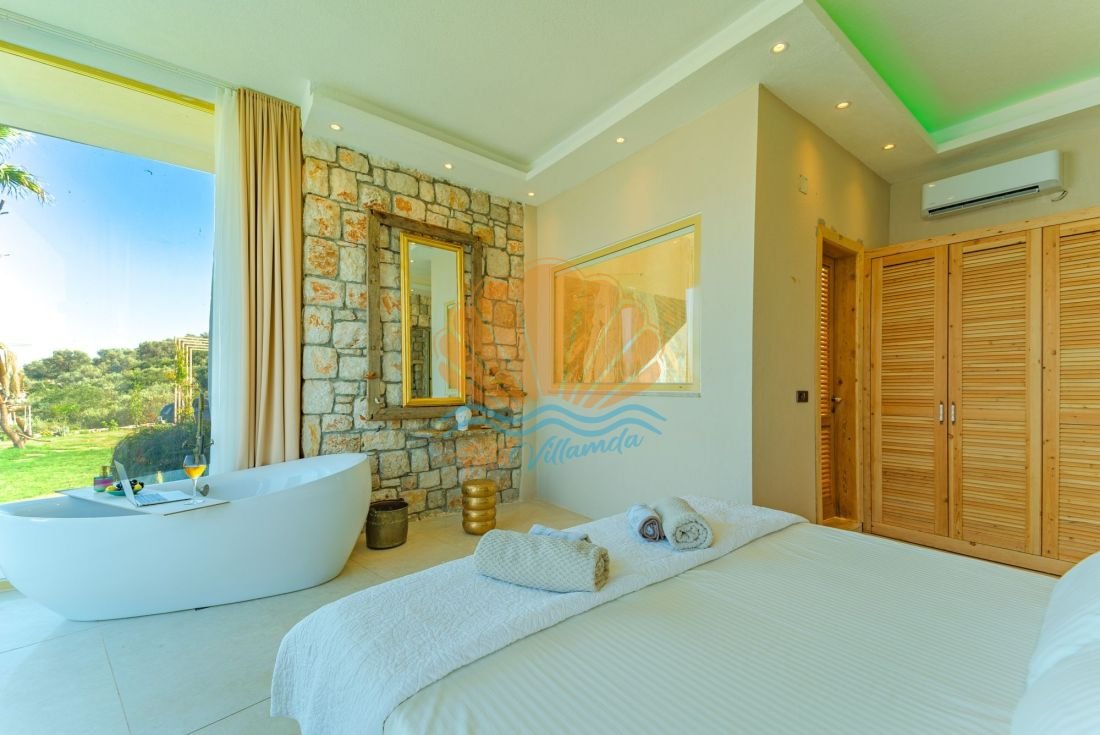 Villa ana bölümde 2 yatak odası ile toplam 4 kişilik konaklama kapasitesine sahiptir. Odalar konforlu, ferah ve manzaraya yönlenmiş yapıdadır. Salon ve mutfak alanı açık planlı olup hem manzaraya hem de havuz terasına direkt bağlantılıdır. Geniş cam açıklıklar sayesinde gün boyu doğal ışık içeri dolarken, gün batımı saatleri villanın en etkileyici anlarını oluşturur.