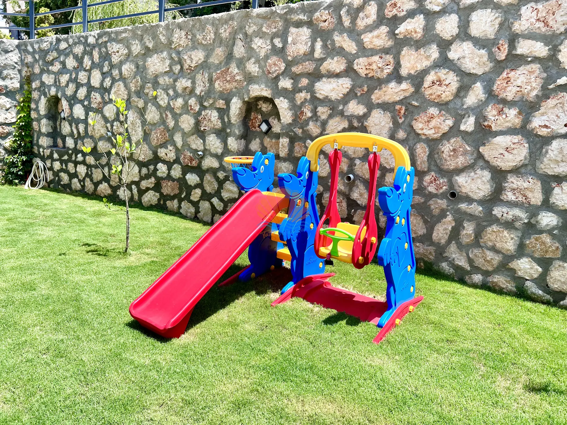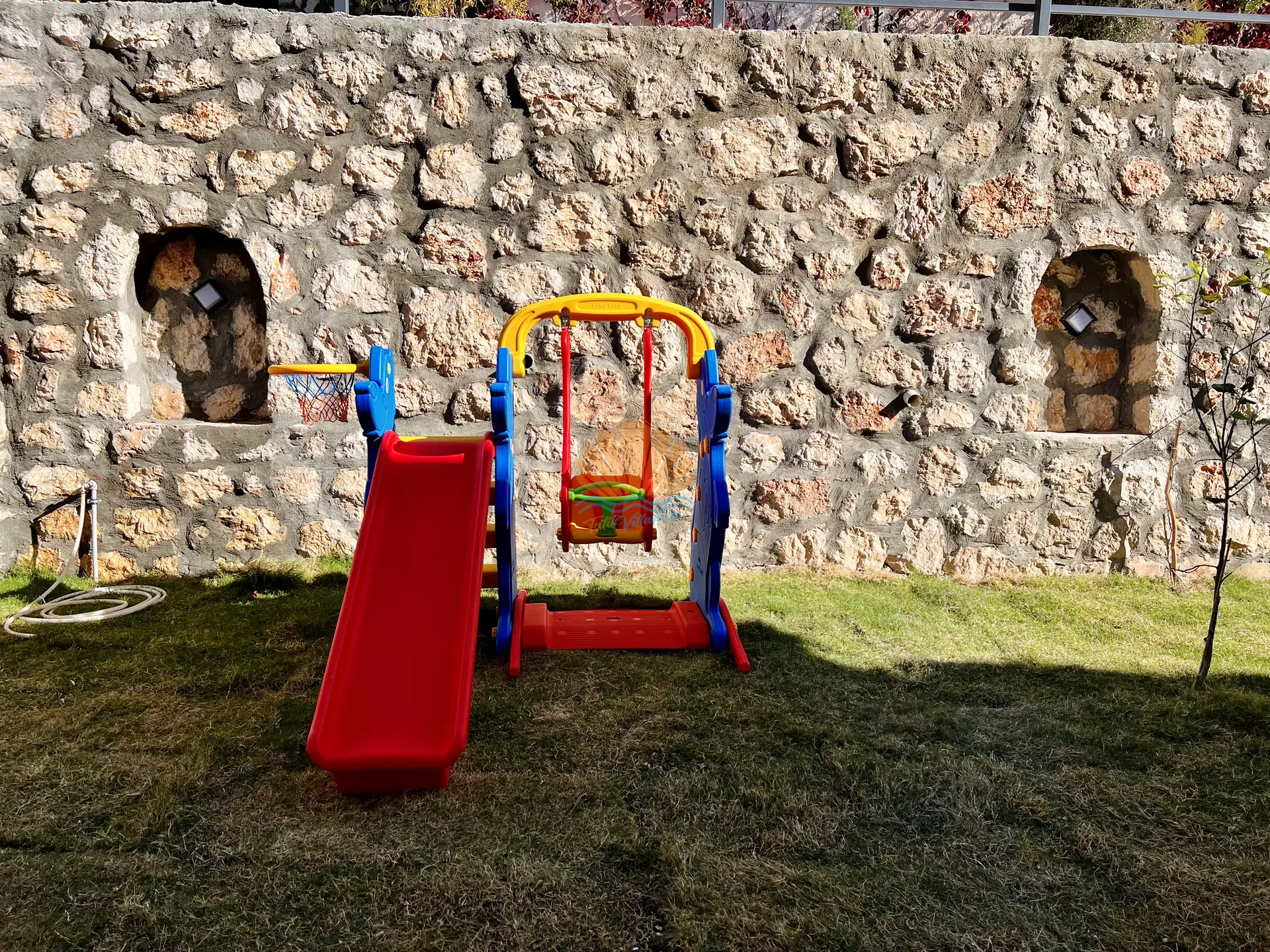 Geniş ve korunaklı dış havuz alanında şezlonglar, şemsiyeler ve keyifli vakit geçirebileceğiniz bir bahçe oturma grubu yer almaktadır. Salıncak ve barbekü alanı sayesinde sevdiklerinizle birlikte hoş akşamlar geçirebilirsiniz. Çocuklu aileler de düşünülerek tasarlanan villada çocuk havuzu, mini çocuk oyun parkı ve langırt gibi eğlenceli detaylar bulunmaktadır.