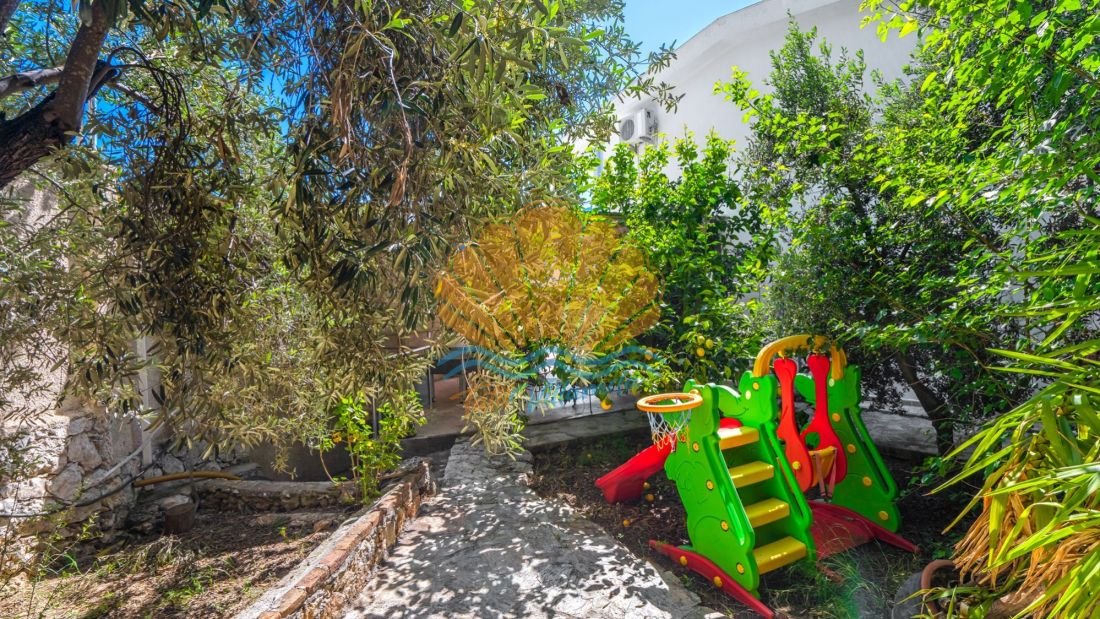 Bahçe alanı da oldukça zengin donanıma sahiptir. Masa takımı, bahçe oturma grubu ve barbekü sayesinde sevdiklerinizle keyifli akşam yemekleri organize edebilirsiniz. Eğlenceli vakit geçirmek isteyenler için langırt bulunurken, çocuklu aileler için düşünülmüş mini oyun parkı da mevcuttur.