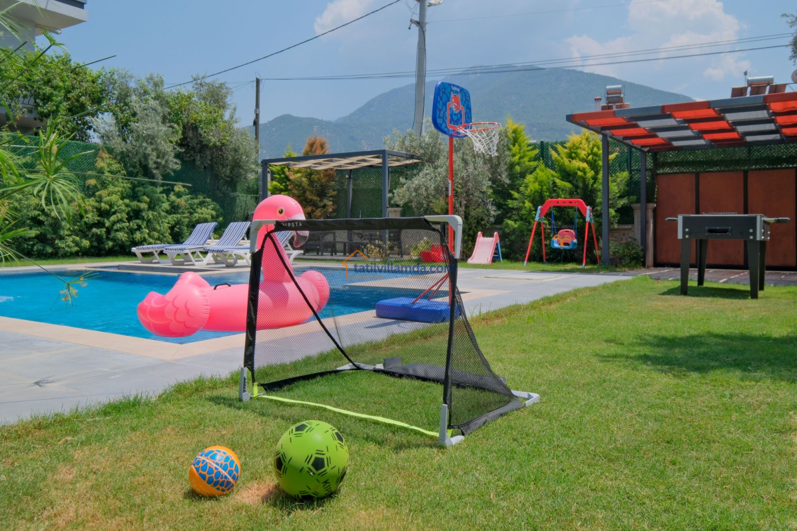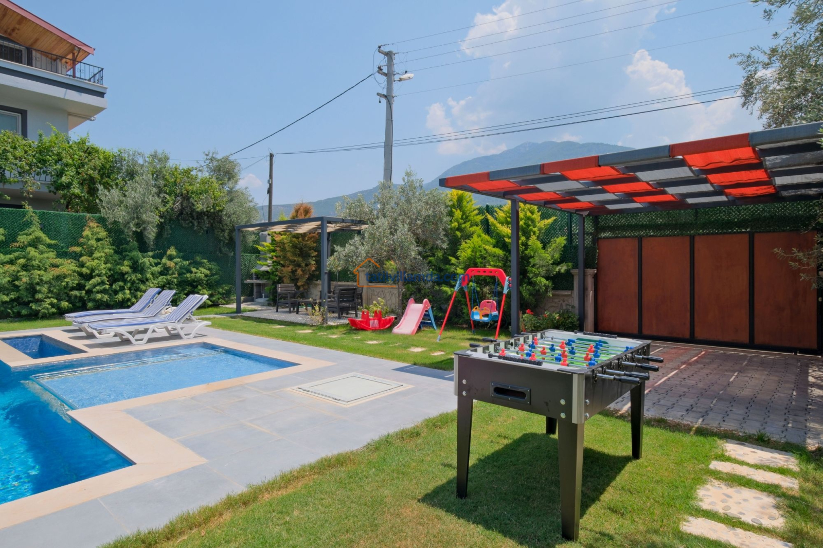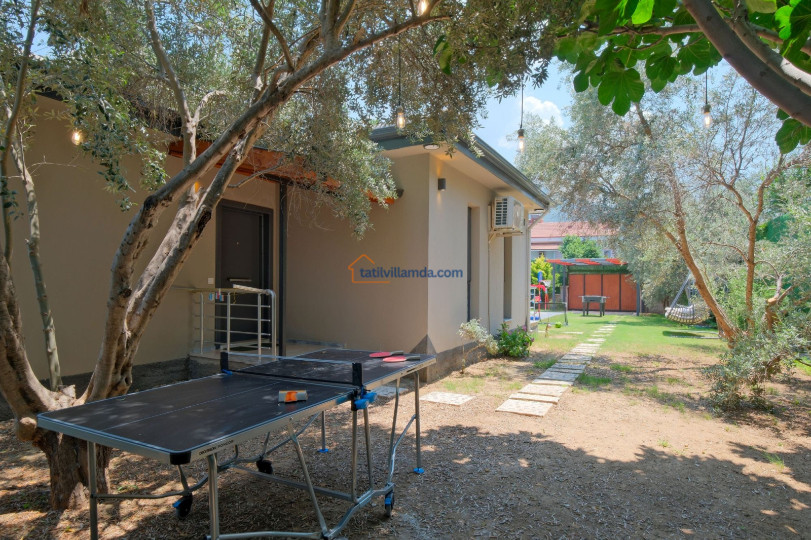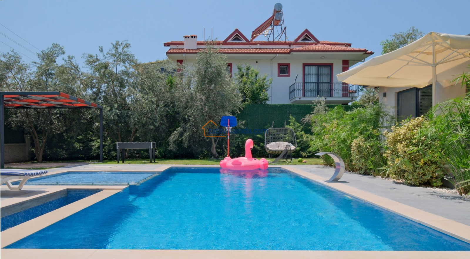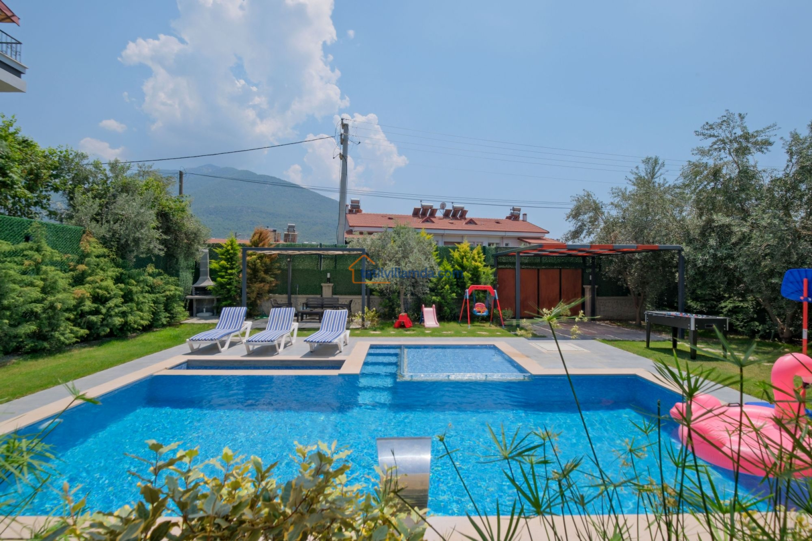 Dış mekanda geniş bir yüzme havuzu ve çocuk havuzu yer alır. Ayrıca çocuklar için özel oyun parkı bulunmakta, böylece ailecek eğlenceli vakit geçirme imkânı sunulmaktadır. Bahçede langırt, masa tenisi, tavla ve air hokey gibi çeşitli oyun alternatifleriyle tatilinize renk katabilirsiniz. Geniş bahçe alanında barbekü yaparak sevdiklerinizle keyifli akşam yemekleri düzenleyebilirsiniz. Şezlong, oturma grubu ve yemek alanı da mevcuttur.