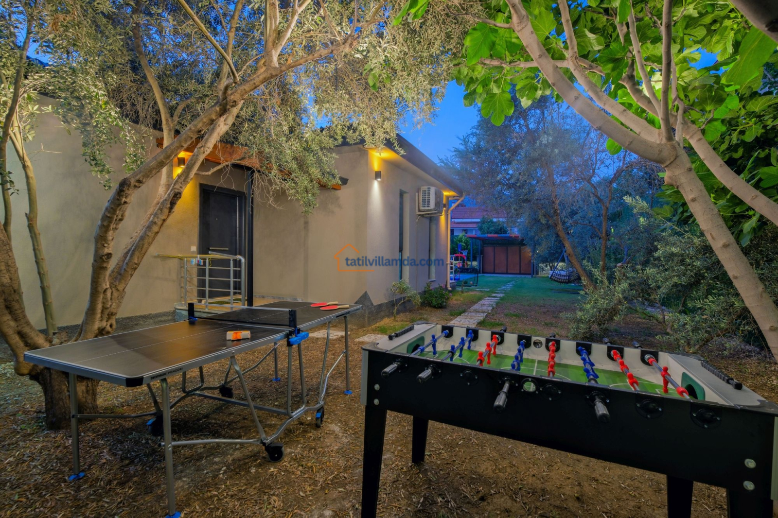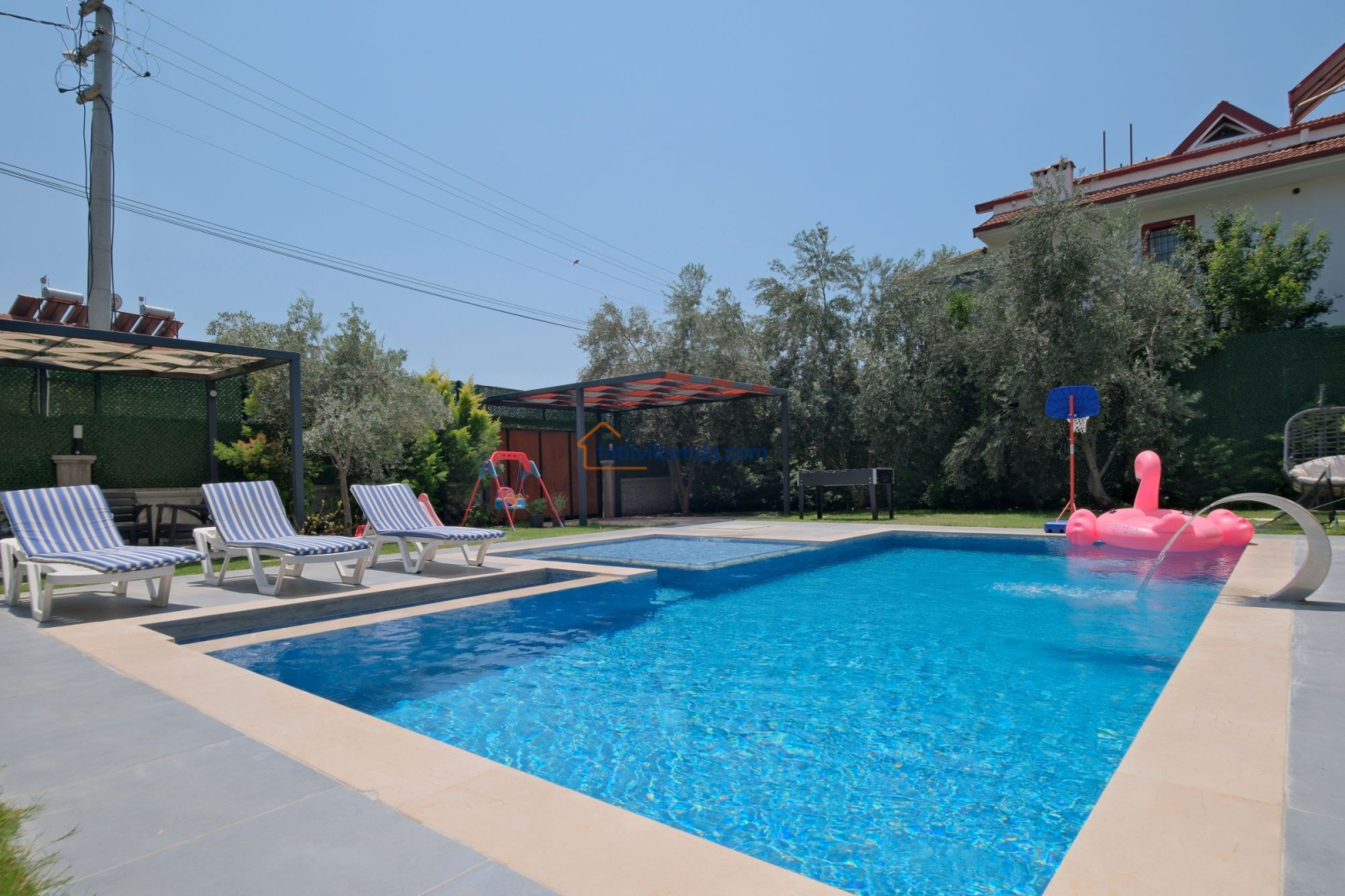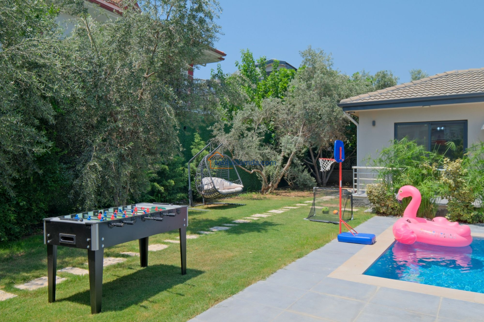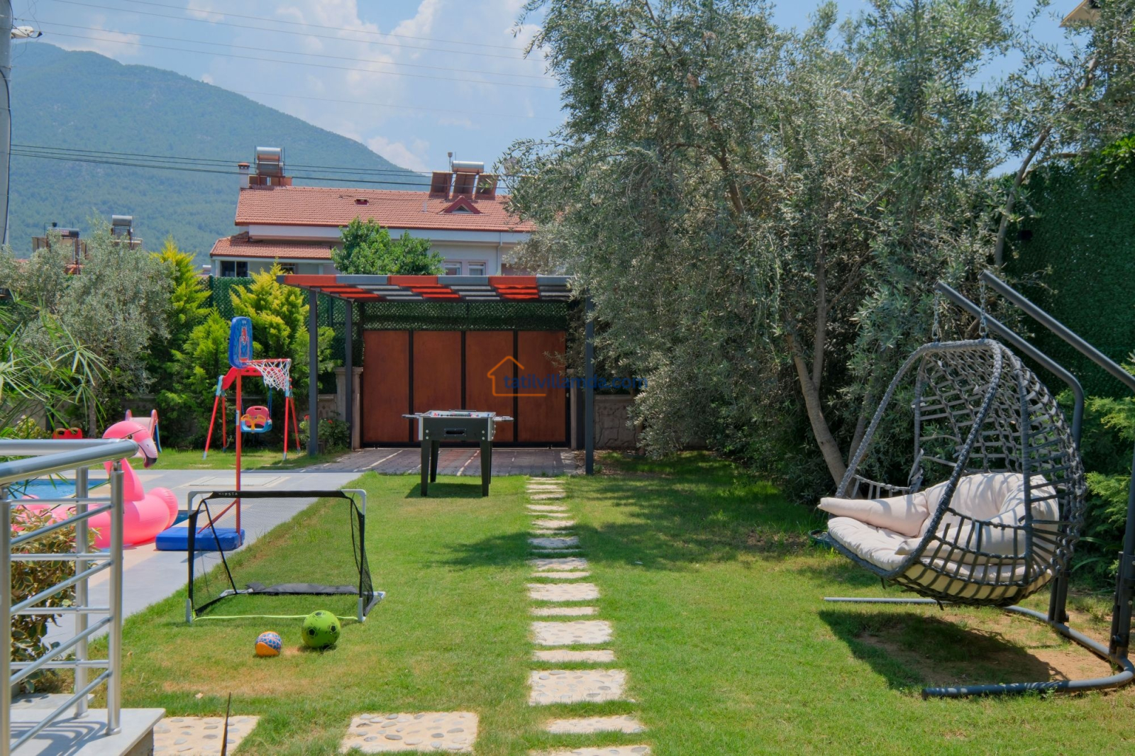 Dış mekanda geniş bir yüzme havuzu ve çocuk havuzu yer alır. Ayrıca çocuklar için özel oyun parkı bulunmakta, böylece ailecek eğlenceli vakit geçirme imkânı sunulmaktadır. Bahçede langırt, masa tenisi, tavla ve air hokey gibi çeşitli oyun alternatifleriyle tatilinize renk katabilirsiniz. Geniş bahçe alanında barbekü yaparak sevdiklerinizle keyifli akşam yemekleri düzenleyebilirsiniz. Şezlong, oturma grubu ve yemek alanı da mevcuttur.