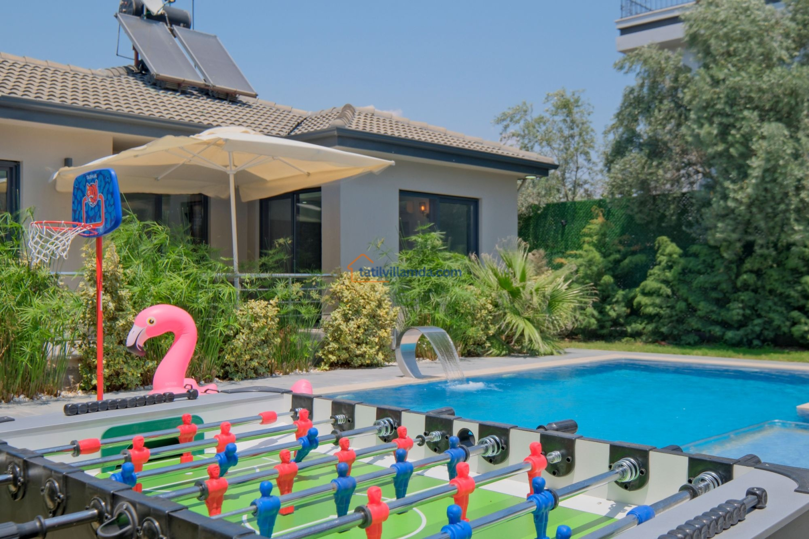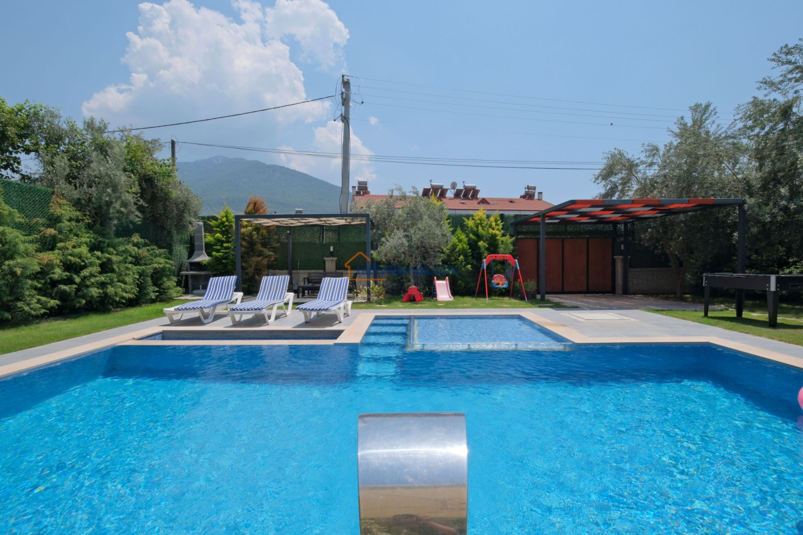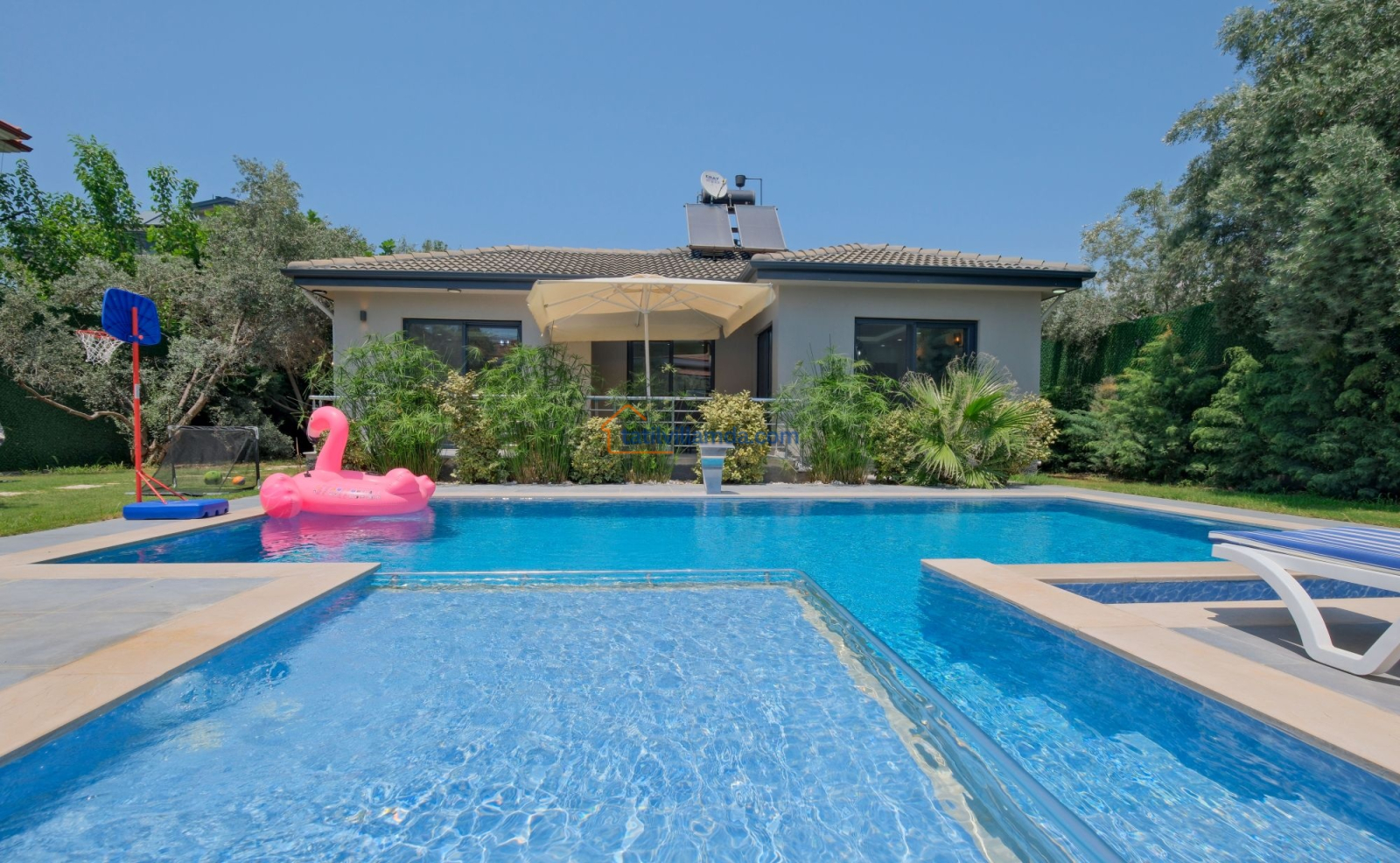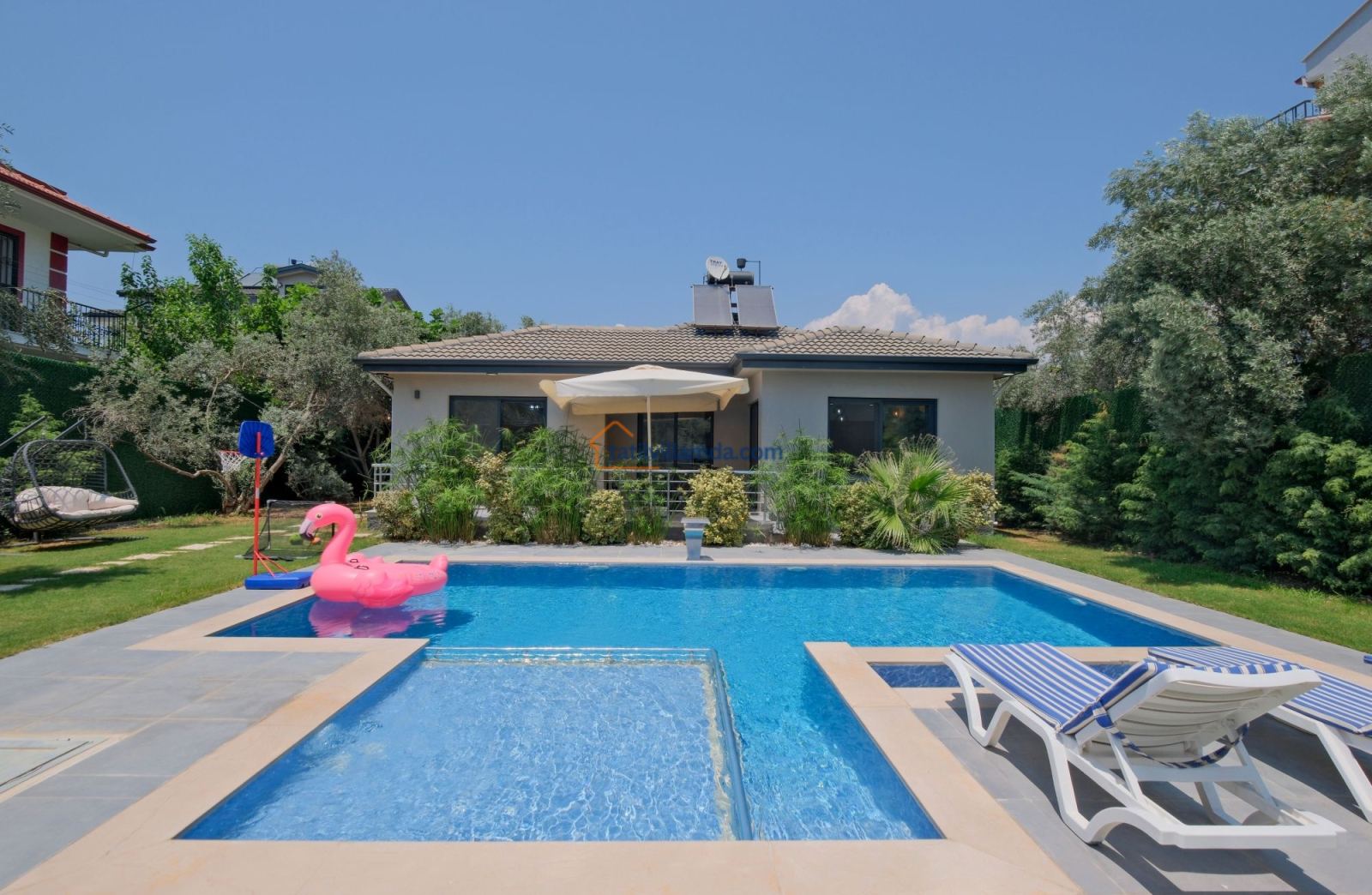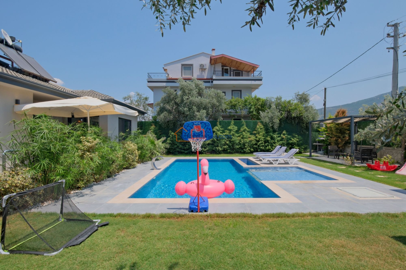 Dış mekanda geniş bir yüzme havuzu ve çocuk havuzu yer alır. Ayrıca çocuklar için özel oyun parkı bulunmakta, böylece ailecek eğlenceli vakit geçirme imkânı sunulmaktadır. Bahçede langırt, masa tenisi, tavla ve air hokey gibi çeşitli oyun alternatifleriyle tatilinize renk katabilirsiniz. Geniş bahçe alanında barbekü yaparak sevdiklerinizle keyifli akşam yemekleri düzenleyebilirsiniz. Şezlong, oturma grubu ve yemek alanı da mevcuttur.