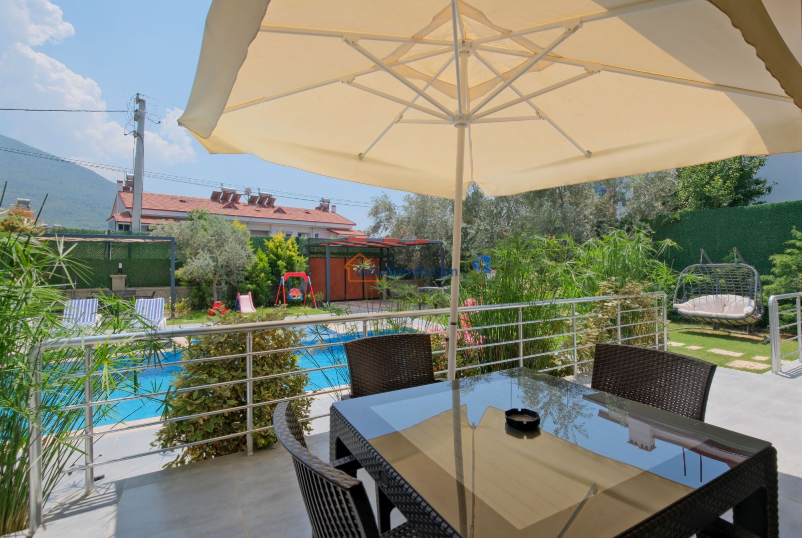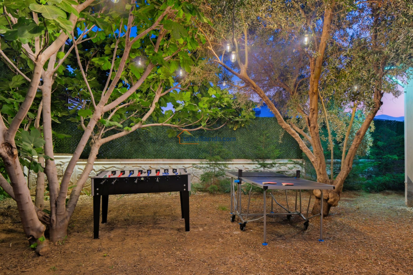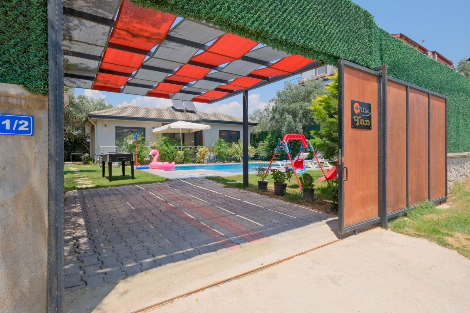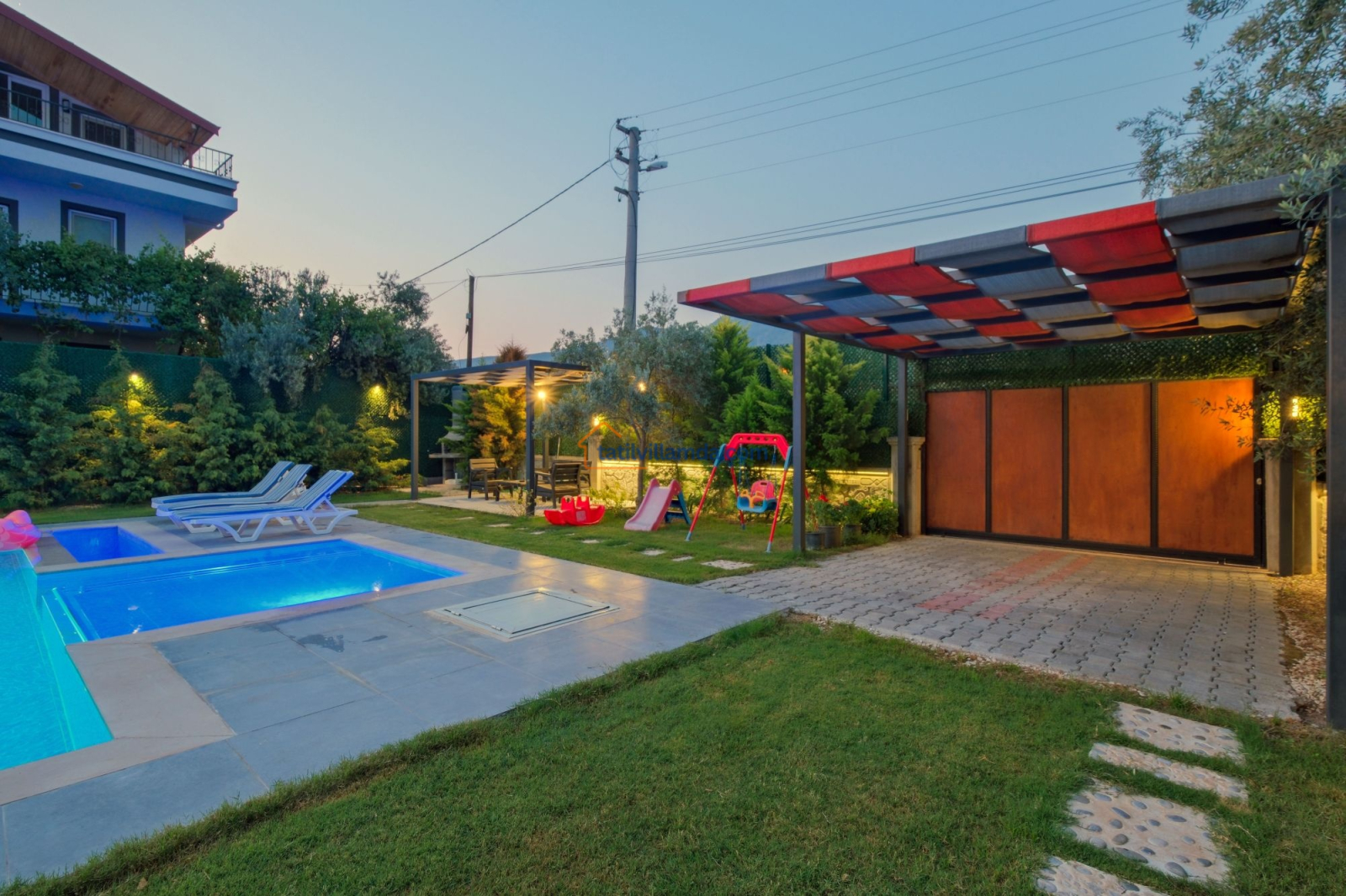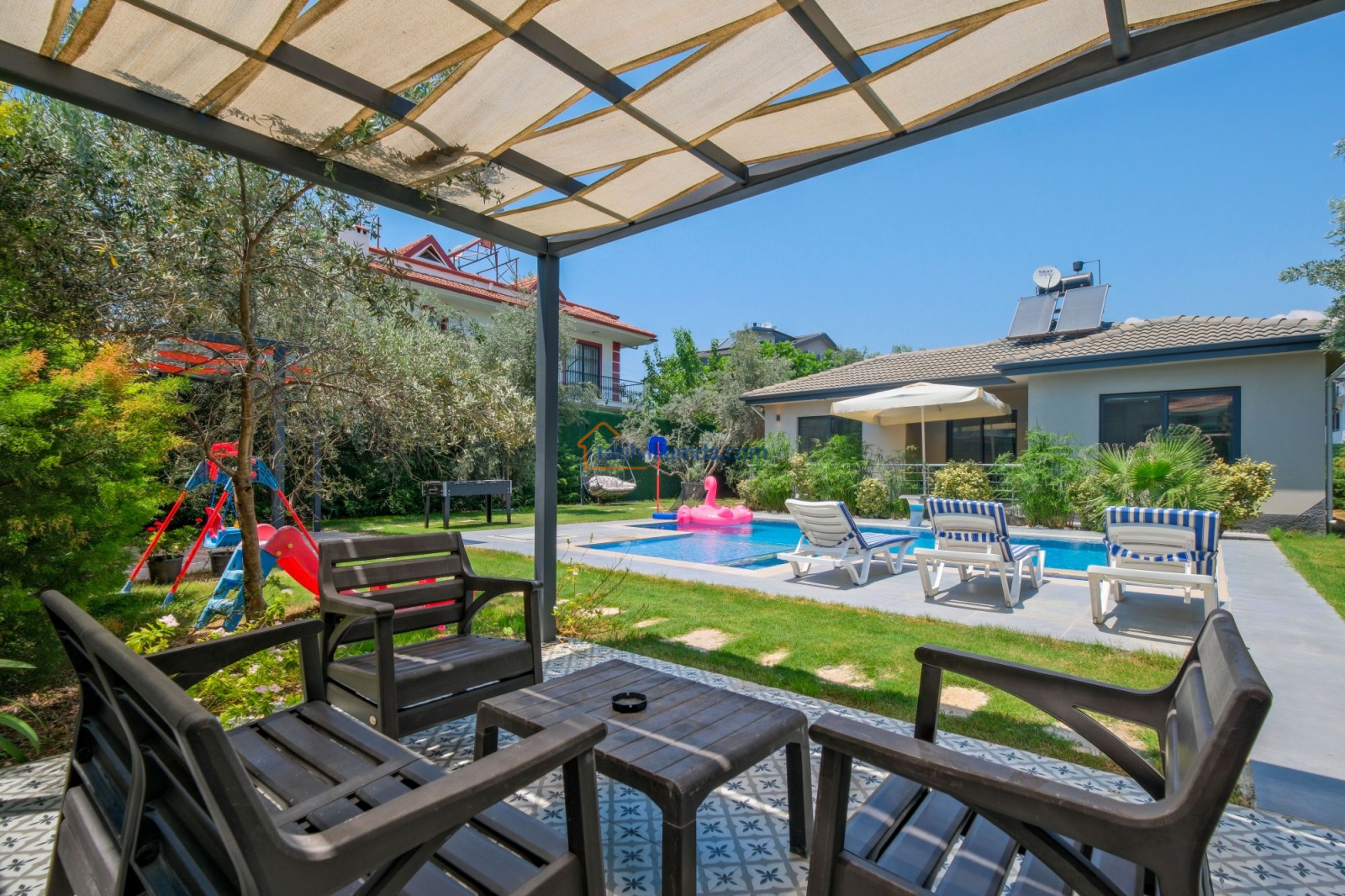 Dış mekanda geniş bir yüzme havuzu ve çocuk havuzu yer alır. Ayrıca çocuklar için özel oyun parkı bulunmakta, böylece ailecek eğlenceli vakit geçirme imkânı sunulmaktadır. Bahçede langırt, masa tenisi, tavla ve air hokey gibi çeşitli oyun alternatifleriyle tatilinize renk katabilirsiniz. Geniş bahçe alanında barbekü yaparak sevdiklerinizle keyifli akşam yemekleri düzenleyebilirsiniz. Şezlong, oturma grubu ve yemek alanı da mevcuttur.