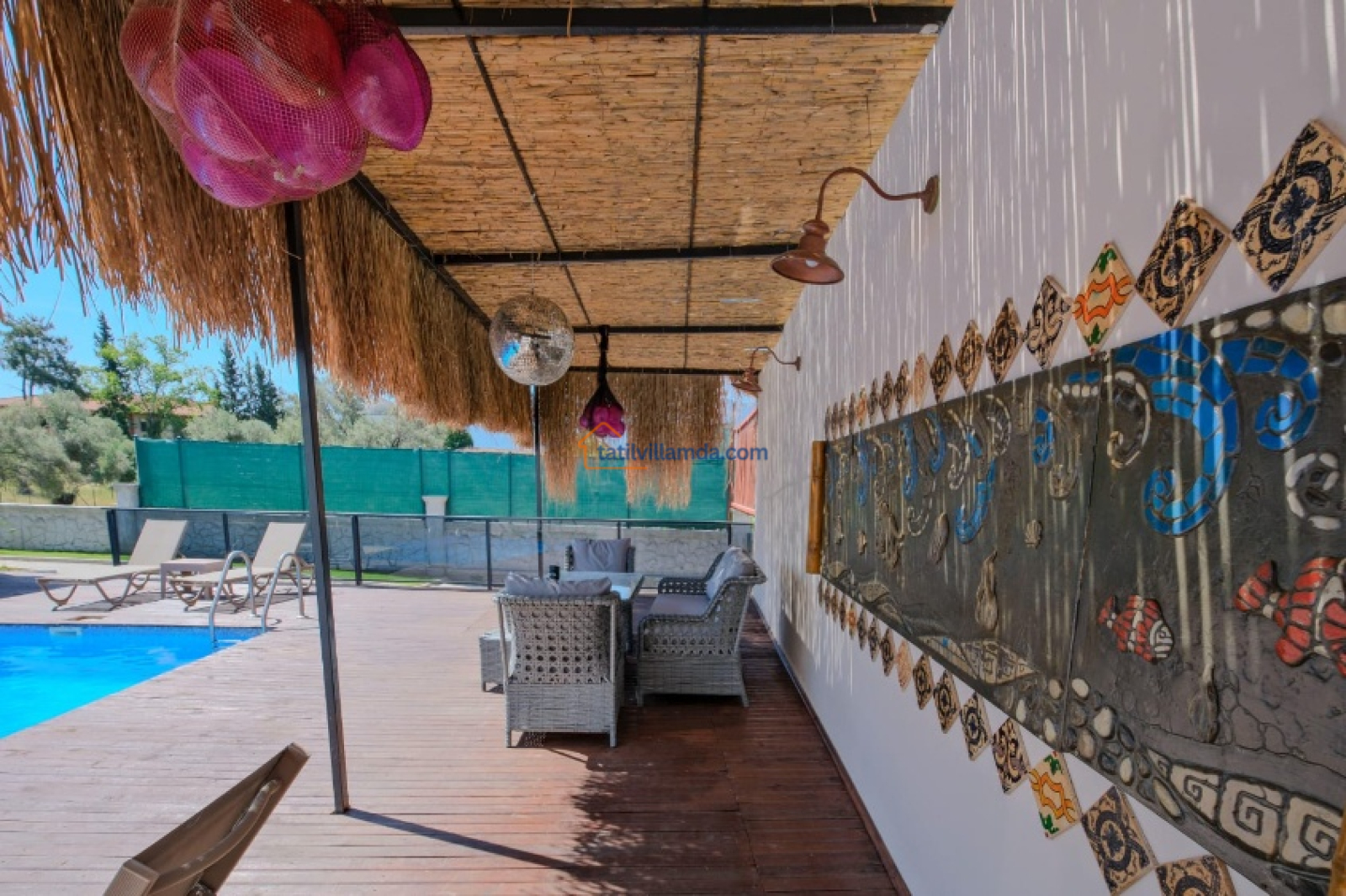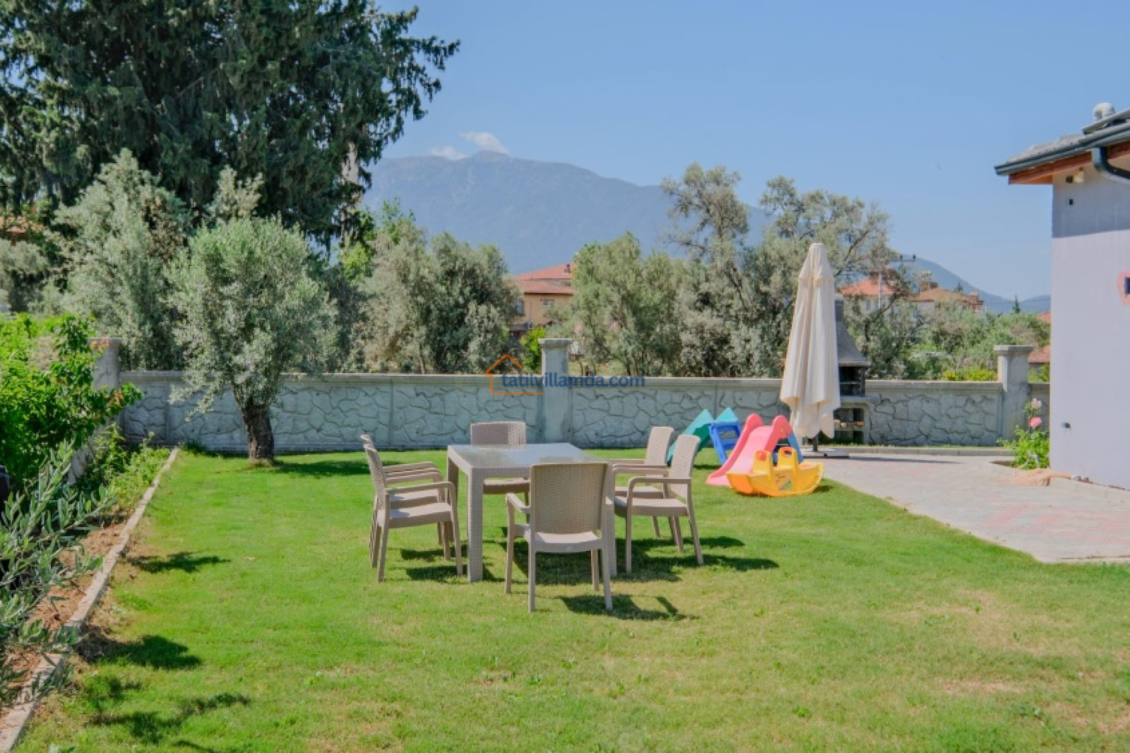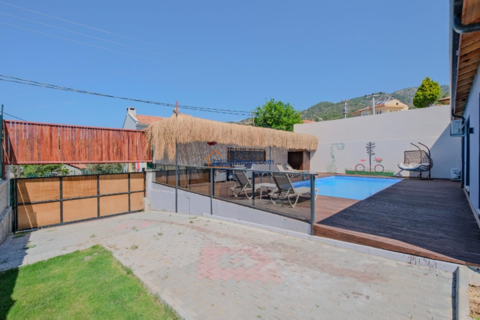 Villa Tayfun Umay, geniş bir korunaklı havuza sahip olup, mahremiyetinizi koruyarak keyifli bir yüzme deneyimi yaşamanıza olanak tanır. Özellikle geniş aileler ve arkadaş grupları için rahat bir tatil imkanı sunan villa, aynı zamanda çevresindeki doğanın sunduğu huzurlu atmosfer ile de dinlendiricidir. Çalış Plajı’na sadece 10 dk lık mesafede bulunan villa, deniz keyfi yapmak isteyen misafirler için kolay erişim sağlar.