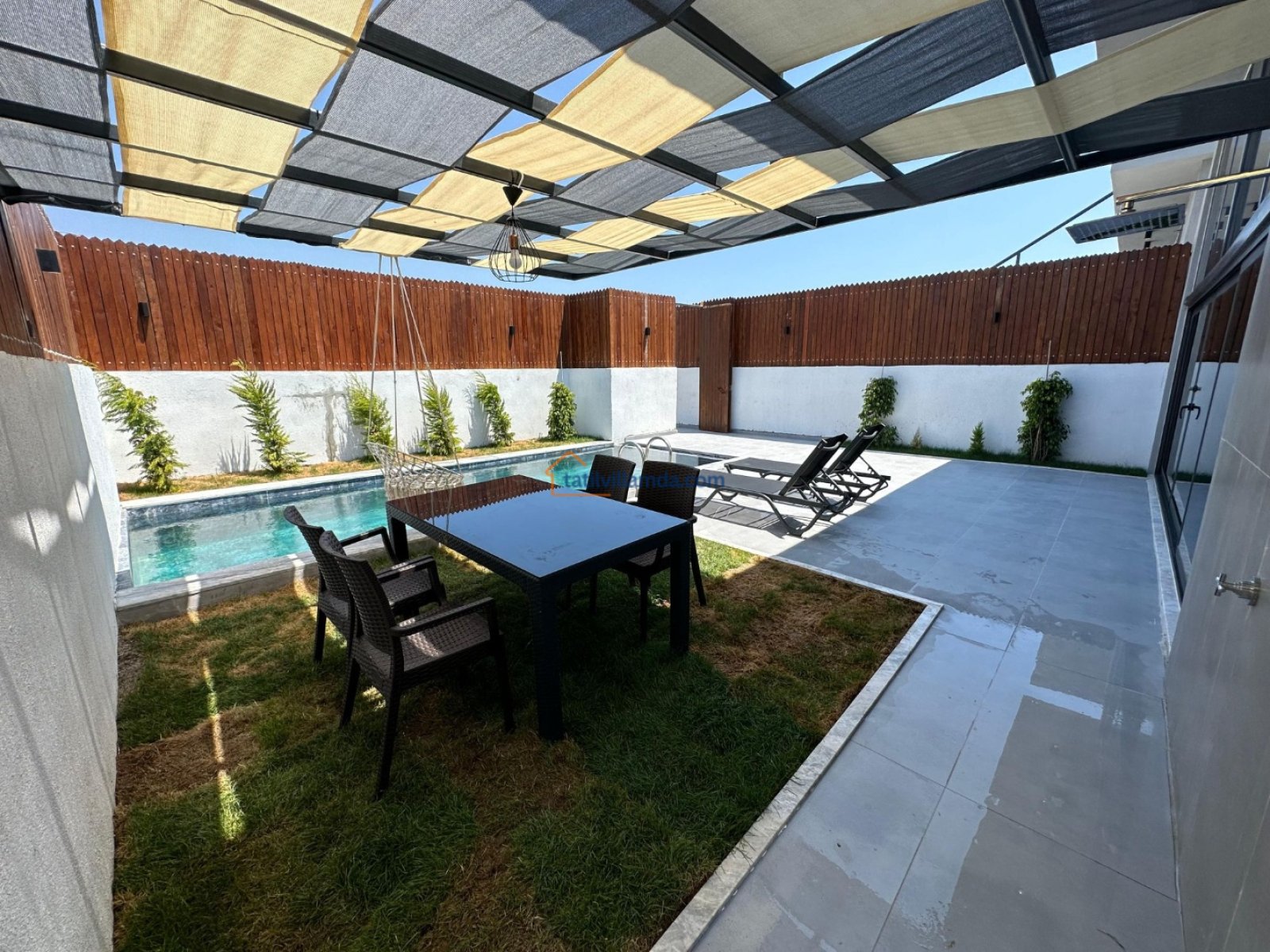 Modern ve şık bir mimariye sahip olan villada, tatil boyunca ihtiyaç duyabileceğiniz tüm detaylar düşünülmüştür. Havuz başında yer alan şezlonglar, keyifli vakit geçirebileceğiniz masa takımı, rahatlatıcı salıncak, lezzetli akşam yemekleri hazırlayabileceğiniz barbekü alanı ve ferah veranda, günün her saatinde konforlu bir kullanım sunar. Doğanın sessizliği ve kuş sesleri eşliğinde havuz keyfi yapabilir, jakuzide günün yorgunluğunu atabilirsiniz.