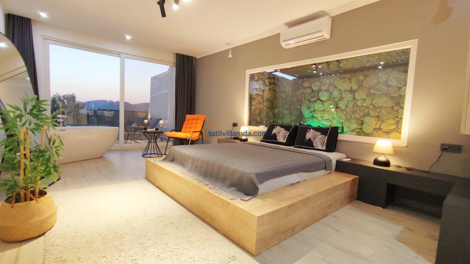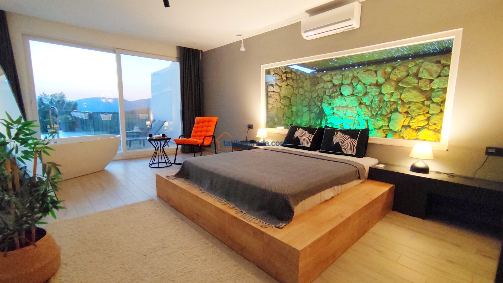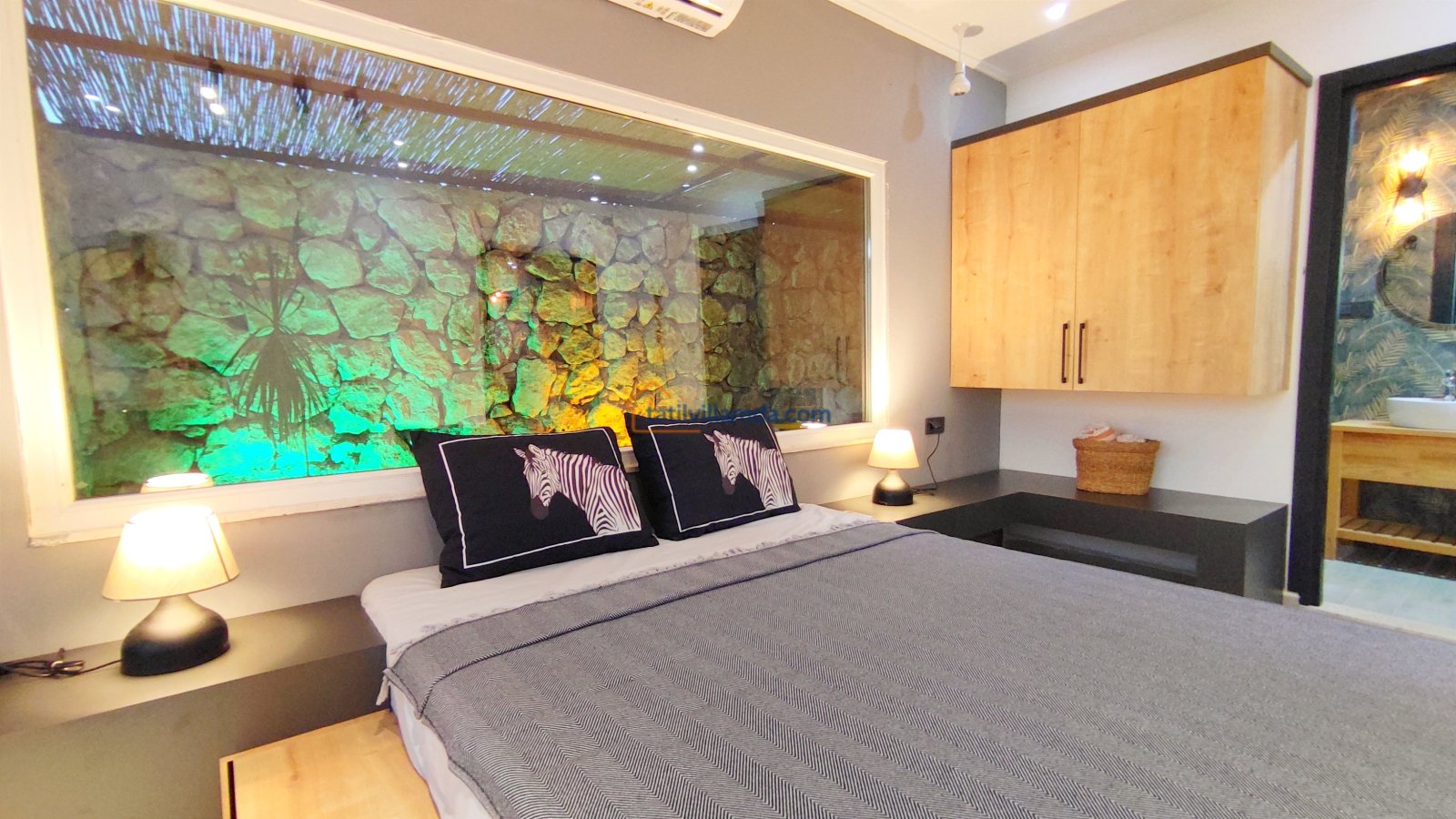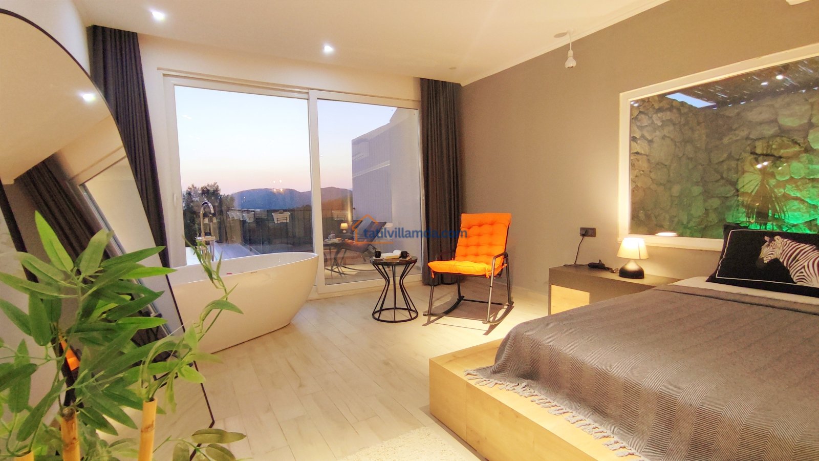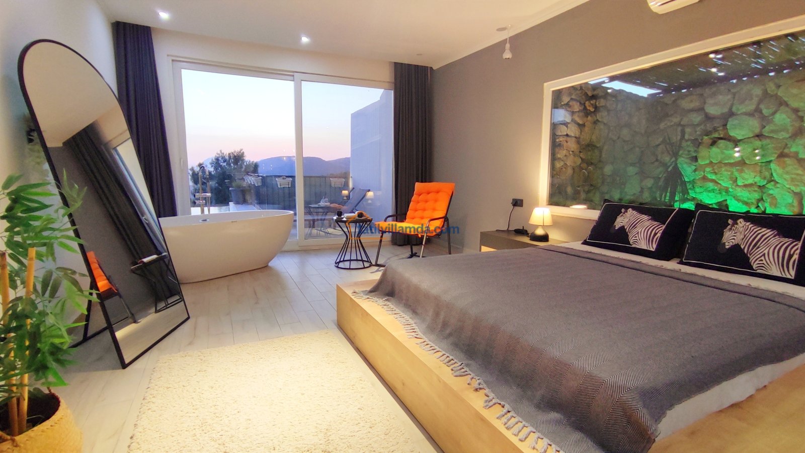 Ebeveyn yatak odasindaki, yatak arkasi camdır ve arkadaki, o oda için özel insaa edilmiş, tropikal bahçeyi görür. Banyo kısmında çift tarafli sevgili duşu ve oradan bu özel bahçeye çıkış vardir. Bahcede çay, kahve keyfi yapilabilir 2 kisilik, küçük fransiz cafe masa ve sandalyeleri bulunur. Ayrica odada bağımsız jakuzi vardir. Jakuzi keyfi yaparken yine yüzme havuzu ve patara manzarasi kesintisiz izlenebilir. İkinci odada, özel yaptirilmis ahsap yatak, birleştirilip ister büyük boy yatak, istenirsede tek kisilik çift yatak haline getirilebilir.
