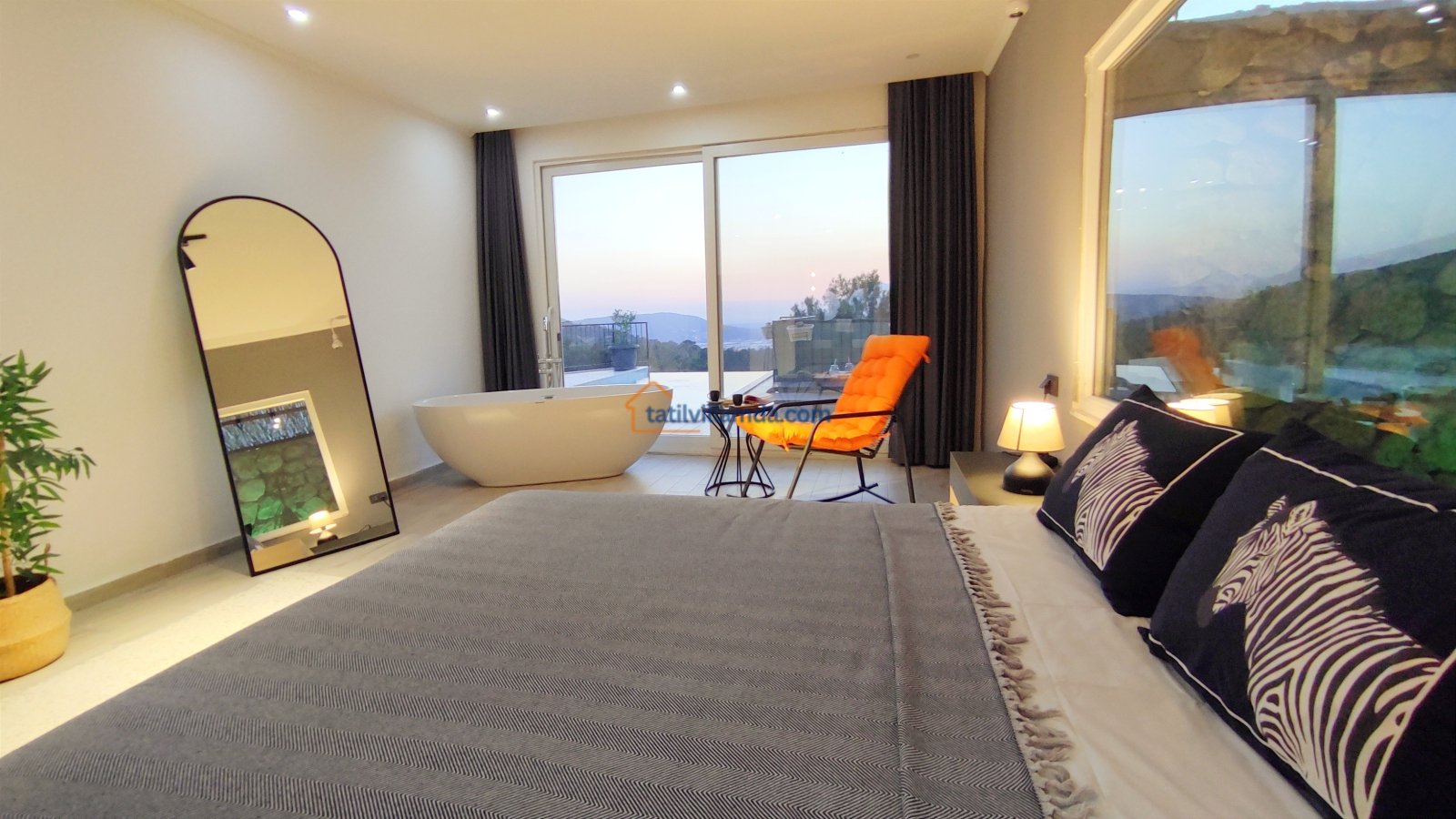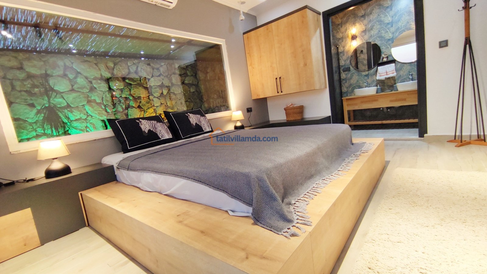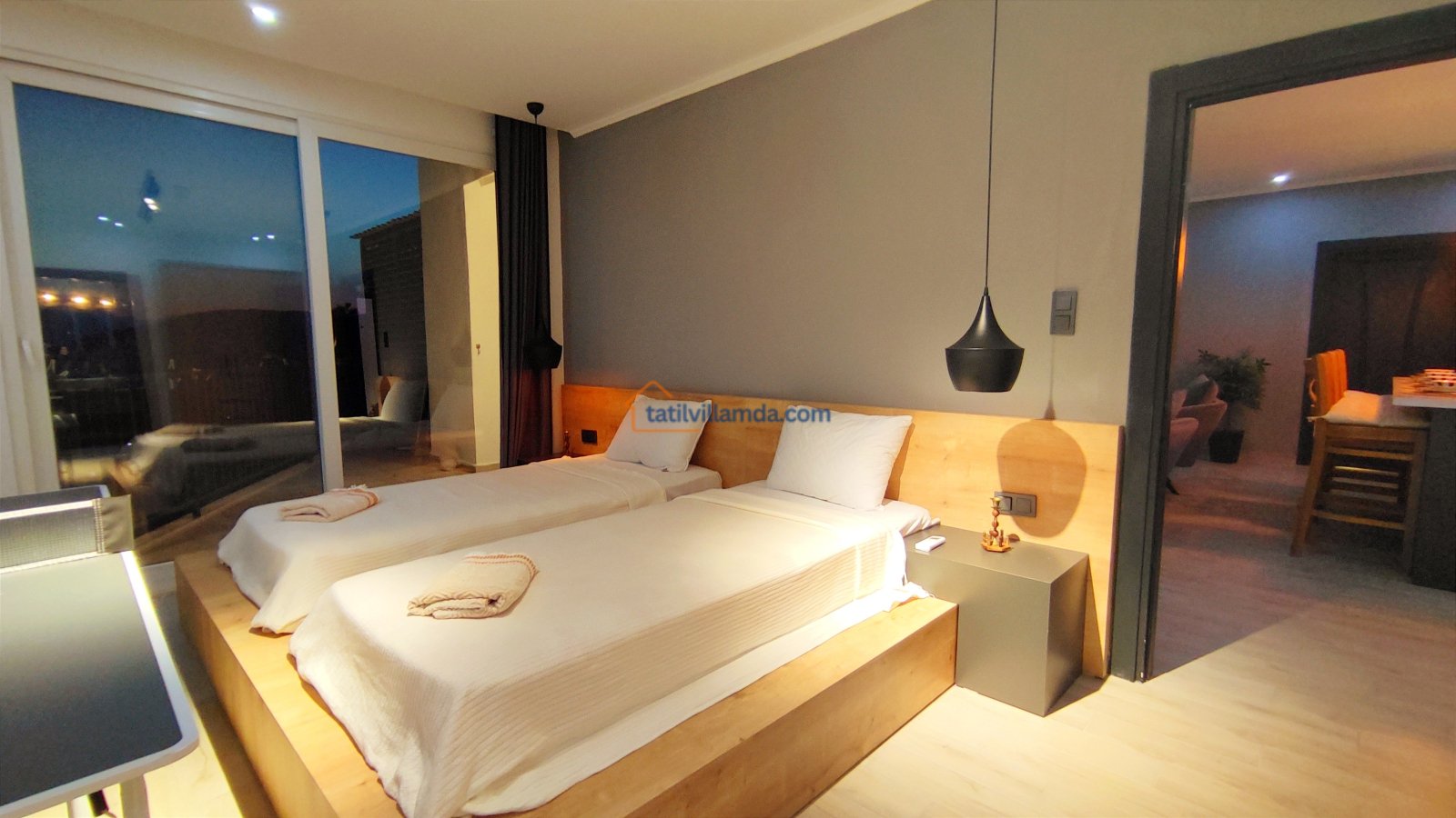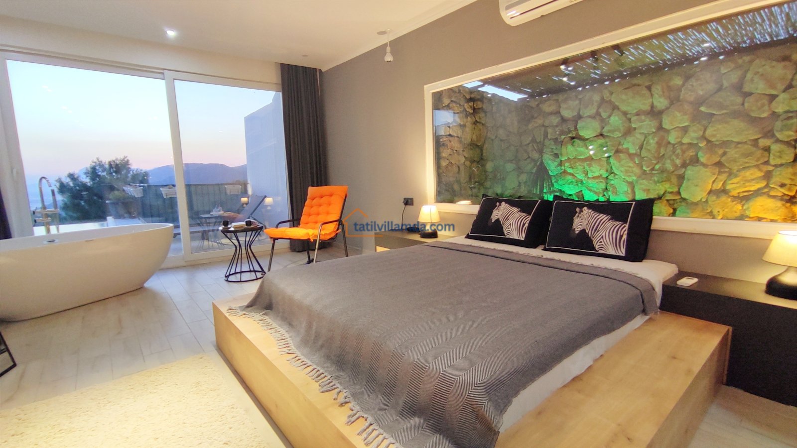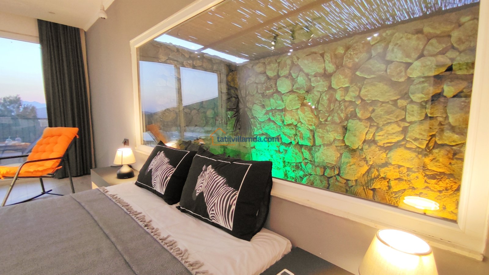 Ebeveyn yatak odasindaki, yatak arkasi camdır ve arkadaki, o oda için özel insaa edilmiş, tropikal bahçeyi görür. Banyo kısmında çift tarafli sevgili duşu ve oradan bu özel bahçeye çıkış vardir. Bahcede çay, kahve keyfi yapilabilir 2 kisilik, küçük fransiz cafe masa ve sandalyeleri bulunur. Ayrica odada bağımsız jakuzi vardir. Jakuzi keyfi yaparken yine yüzme havuzu ve patara manzarasi kesintisiz izlenebilir. İkinci odada, özel yaptirilmis ahsap yatak, birleştirilip ister büyük boy yatak, istenirsede tek kisilik çift yatak haline getirilebilir.