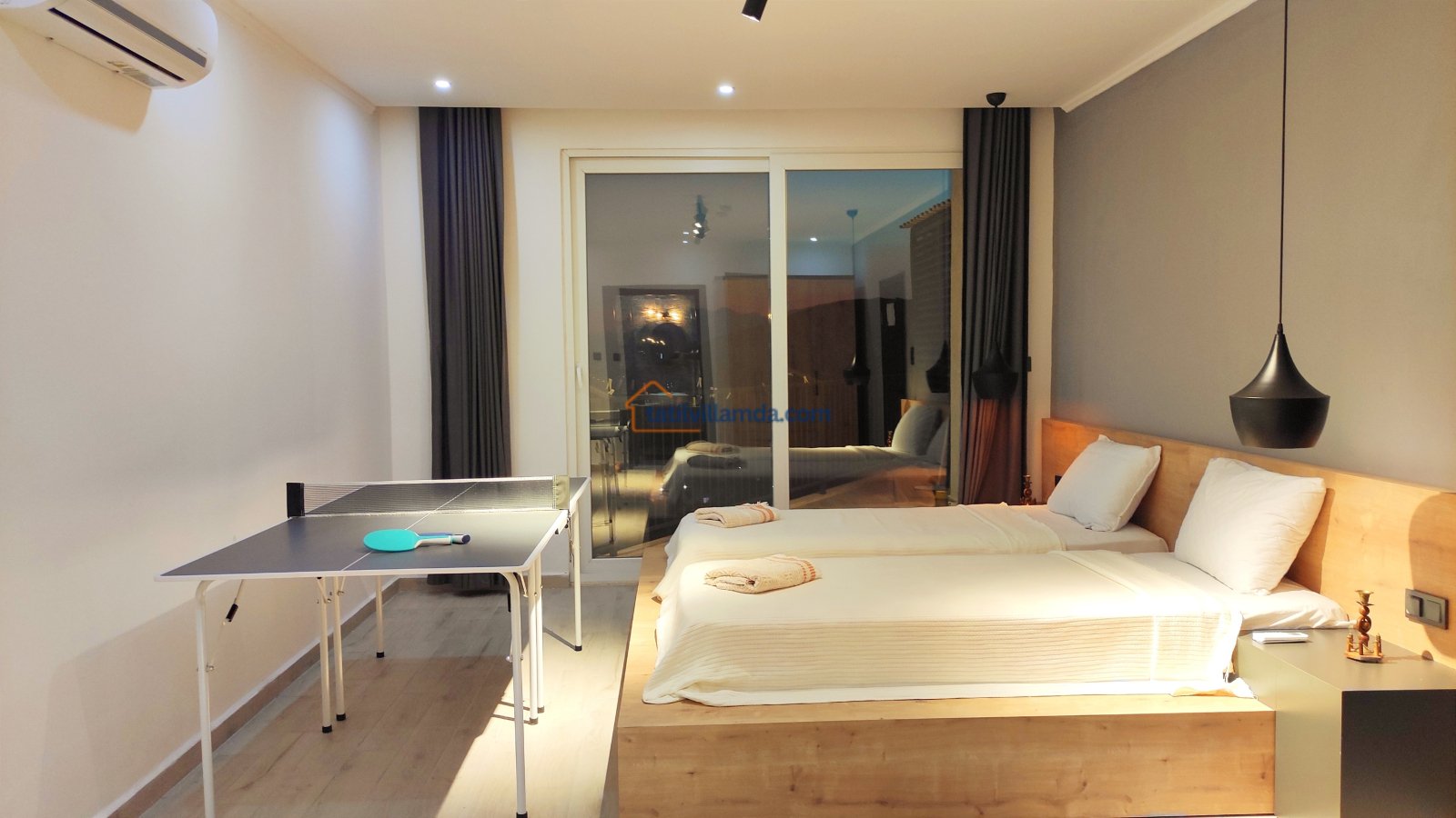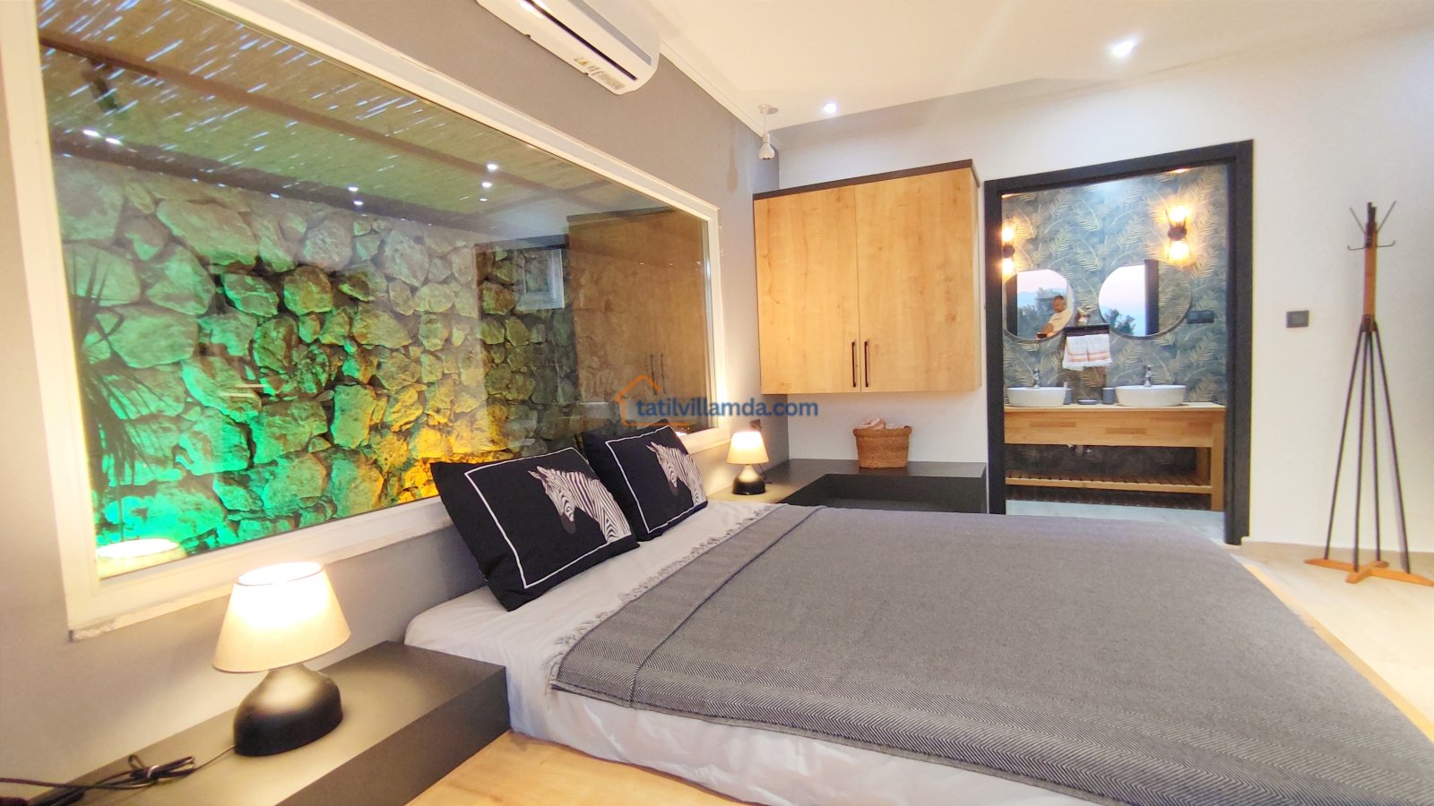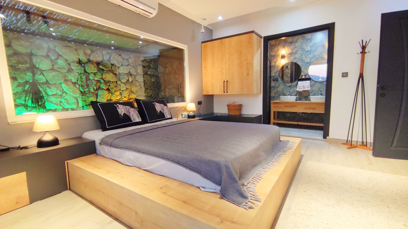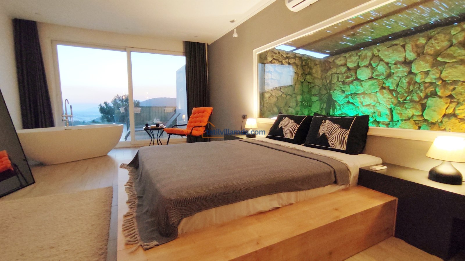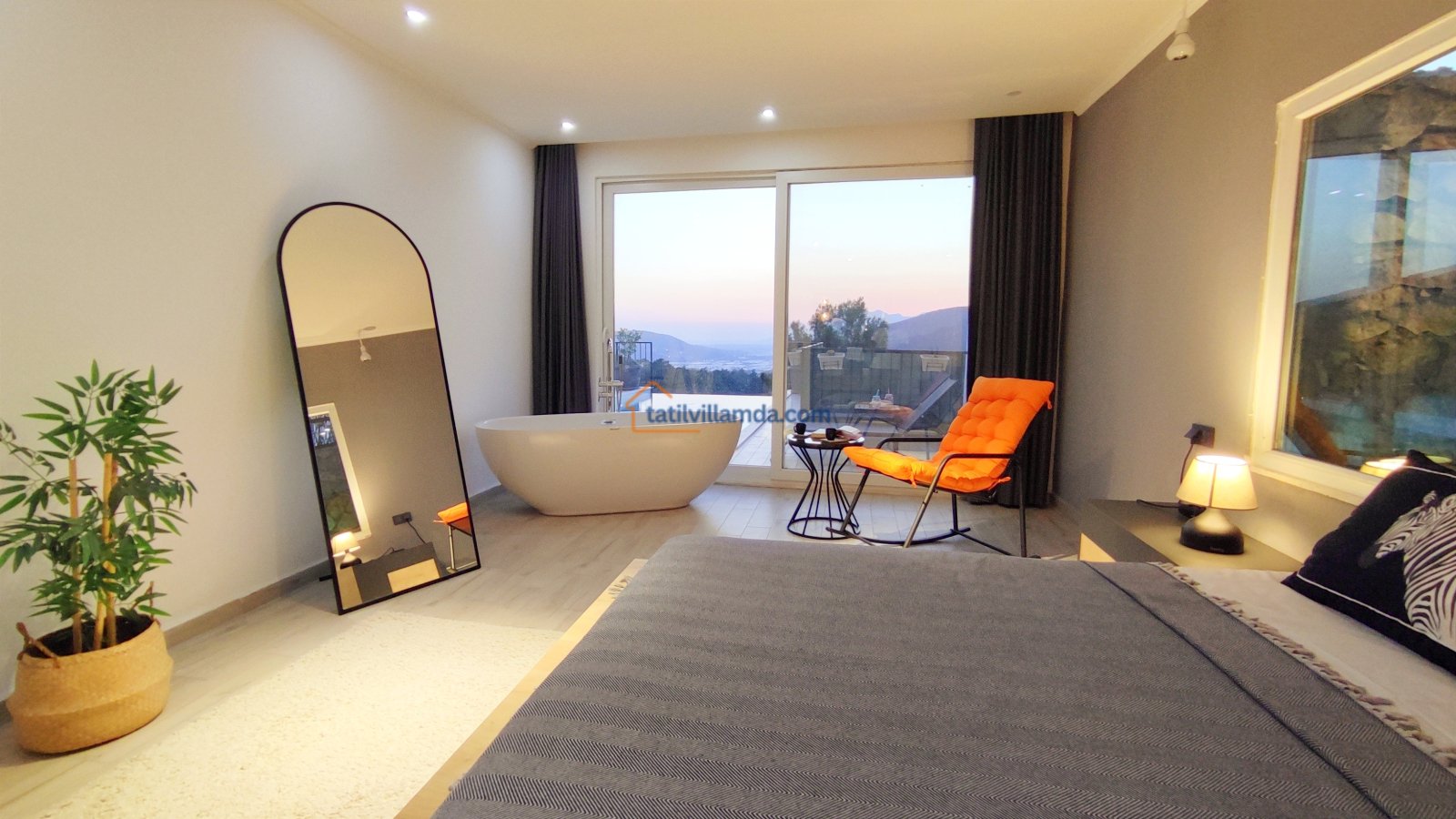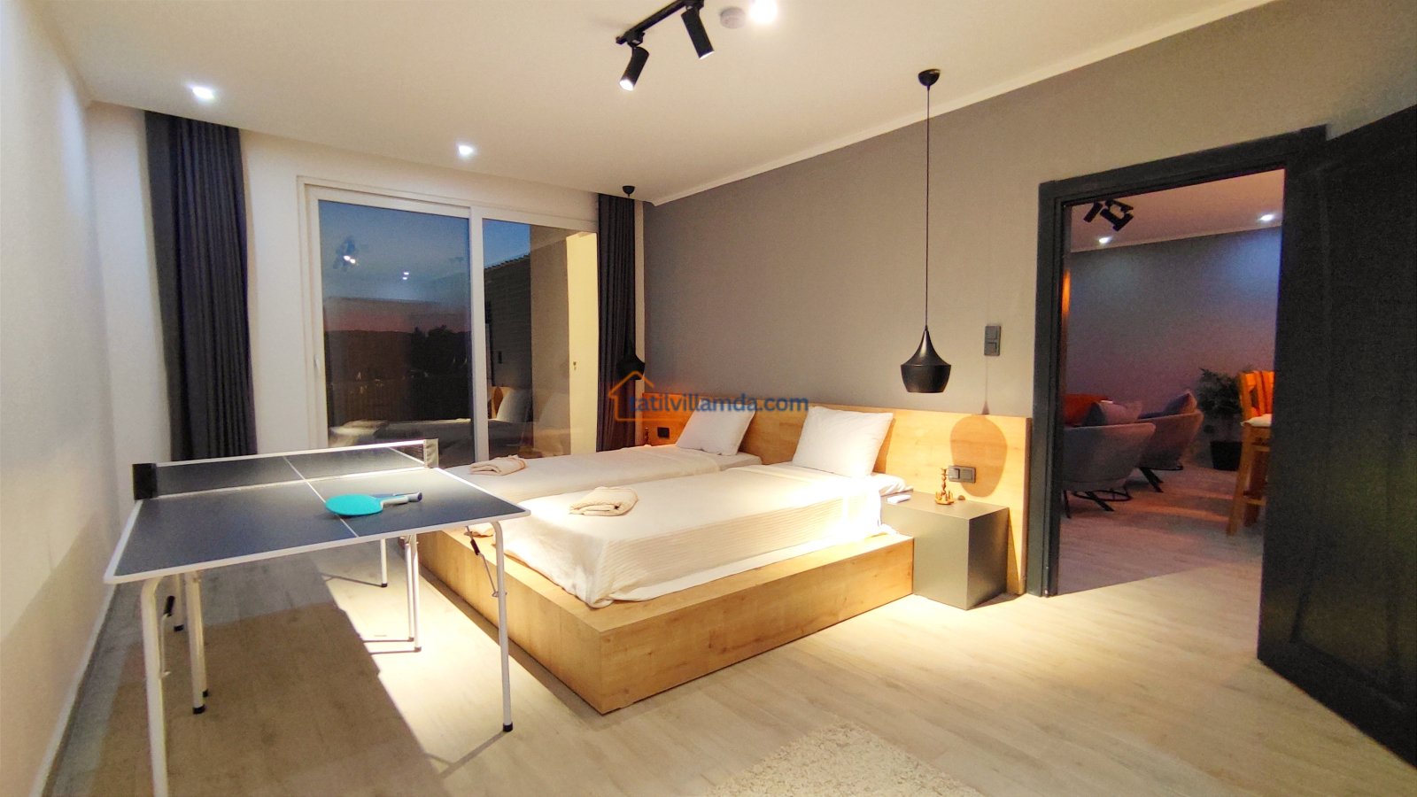 Ebeveyn yatak odasindaki, yatak arkasi camdır ve arkadaki, o oda için özel insaa edilmiş, tropikal bahçeyi görür. Banyo kısmında çift tarafli sevgili duşu ve oradan bu özel bahçeye çıkış vardir. Bahcede çay, kahve keyfi yapilabilir 2 kisilik, küçük fransiz cafe masa ve sandalyeleri bulunur. Ayrica odada bağımsız jakuzi vardir. Jakuzi keyfi yaparken yine yüzme havuzu ve patara manzarasi kesintisiz izlenebilir. İkinci odada, özel yaptirilmis ahsap yatak, birleştirilip ister büyük boy yatak, istenirsede tek kisilik çift yatak haline getirilebilir.