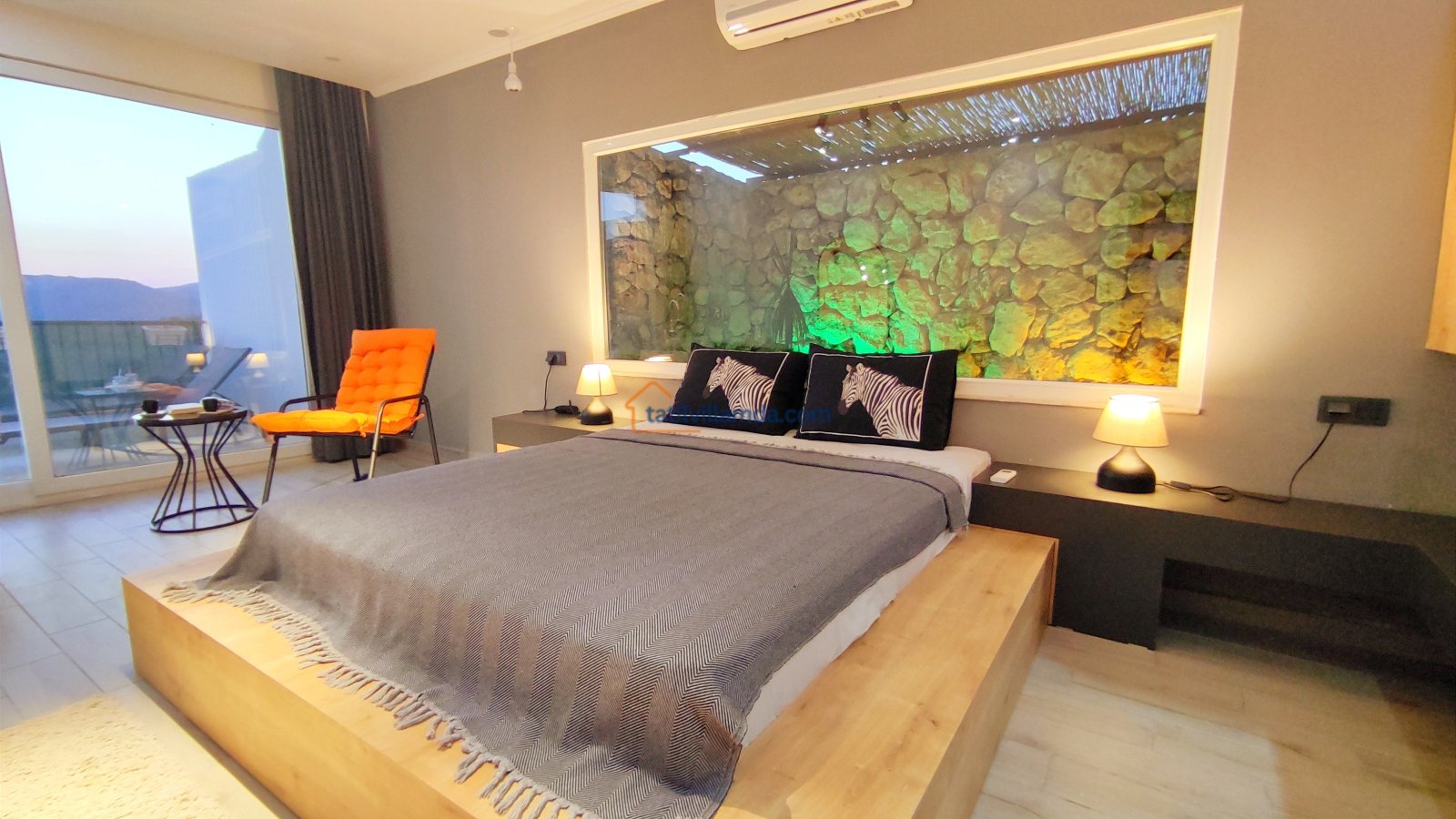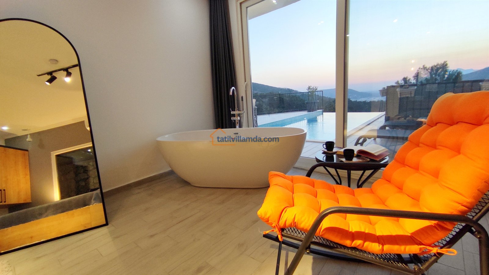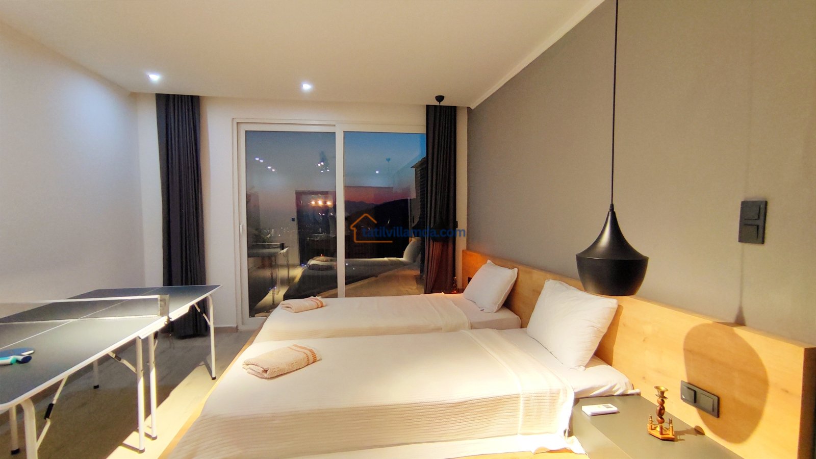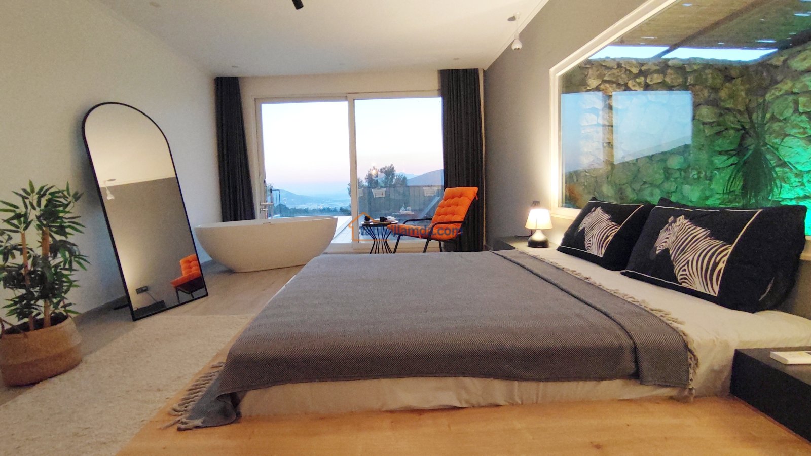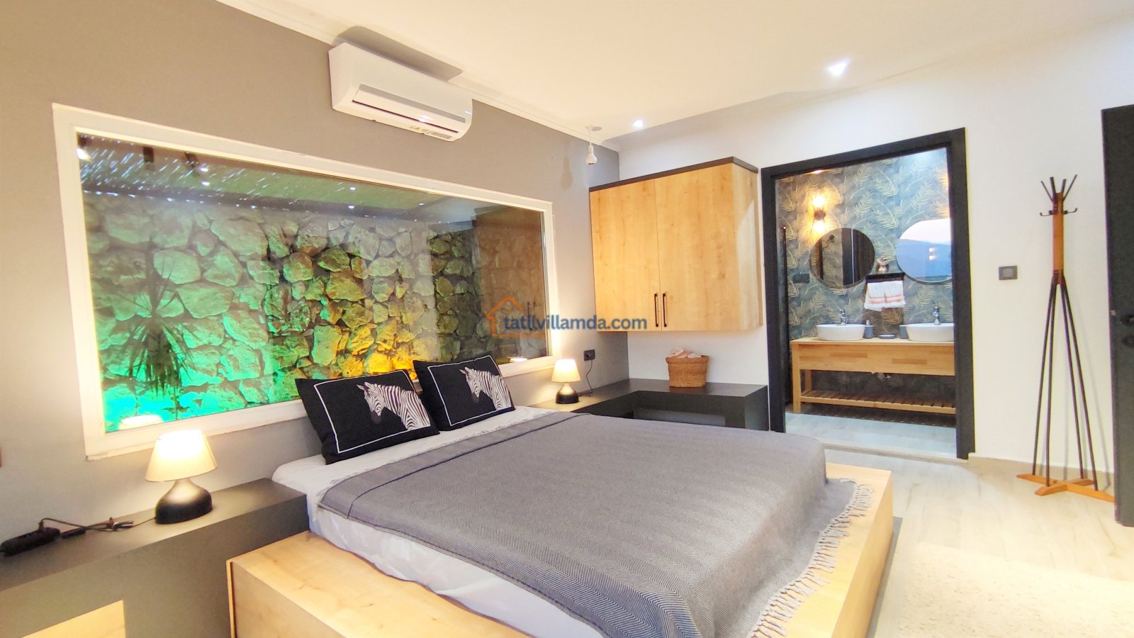 Ebeveyn yatak odasindaki, yatak arkasi camdır ve arkadaki, o oda için özel insaa edilmiş, tropikal bahçeyi görür. Banyo kısmında çift tarafli sevgili duşu ve oradan bu özel bahçeye çıkış vardir. Bahcede çay, kahve keyfi yapilabilir 2 kisilik, küçük fransiz cafe masa ve sandalyeleri bulunur. Ayrica odada bağımsız jakuzi vardir. Jakuzi keyfi yaparken yine yüzme havuzu ve patara manzarasi kesintisiz izlenebilir. İkinci odada, özel yaptirilmis ahsap yatak, birleştirilip ister büyük boy yatak, istenirsede tek kisilik çift yatak haline getirilebilir.
