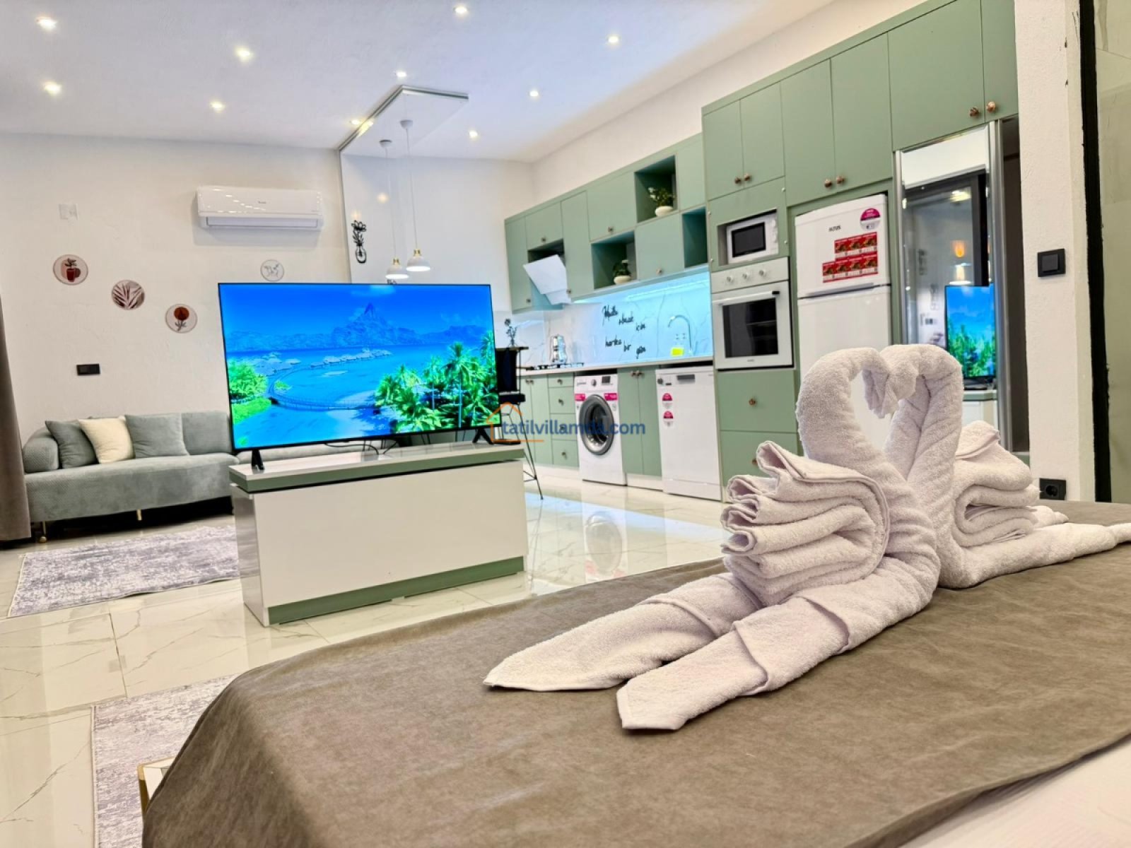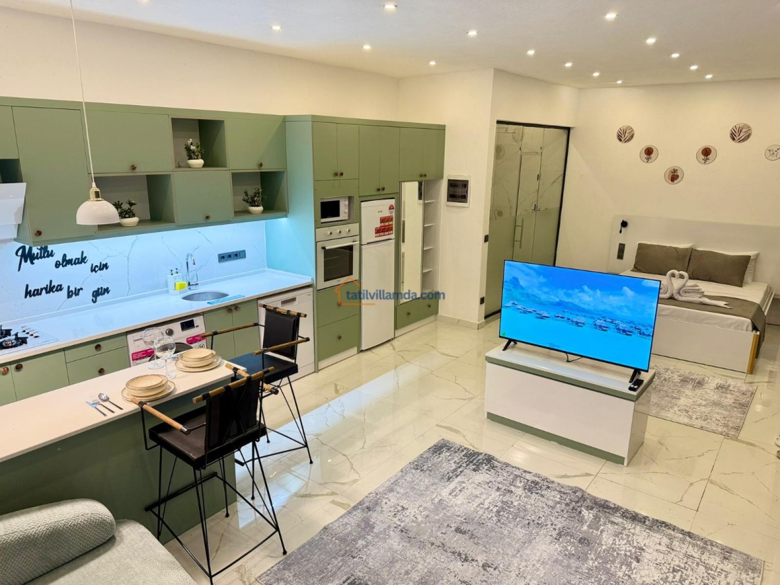 Villanın mutfak, salon ve yatak odası konsepti tek bir açık alanda konumlandırılmış olup, ferah ve kullanışlı bir yaşam alanı oluşturulmuştur. Modern ve sade dekorasyonu sayesinde hem konforlu hem de keyifli bir konaklama imkânı sağlar. Günlük ihtiyaçlarınızı karşılayabileceğiniz donanımlı mutfağı ve rahat oturma alanı ile evinizin konforunu tatilde de yaşarsınız.