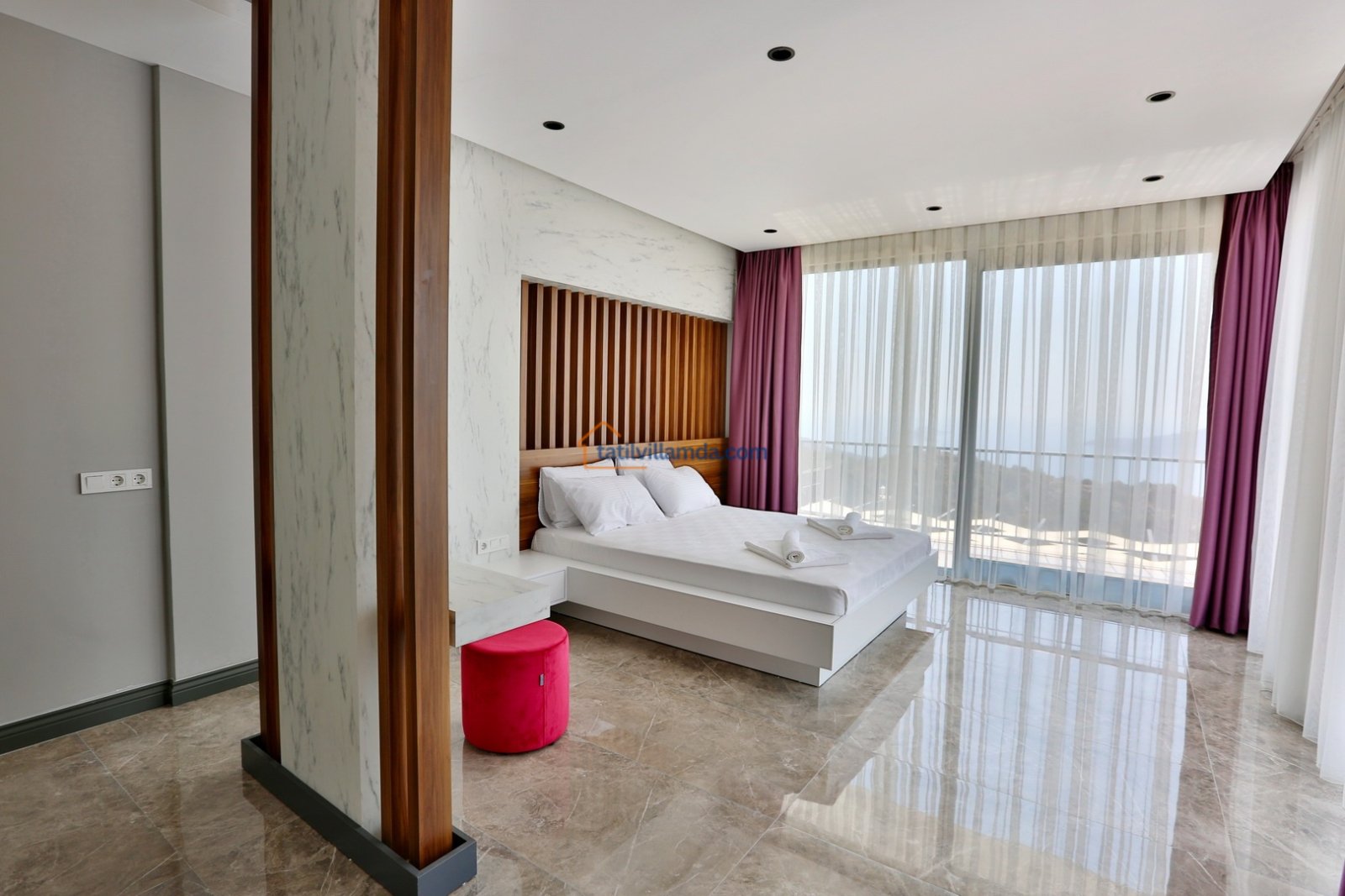 Villada üç yatak odası ve üç banyo bulunmakta olup, toplamda 6 kişilik konaklama kapasitesine sahiptir. Odalarda çift kişilik yataklar yer almakta, ayrıca bebek yatağı da mevcuttur. Geniş ve ferah tasarımıyla aileler ve arkadaş grupları için idealdir.