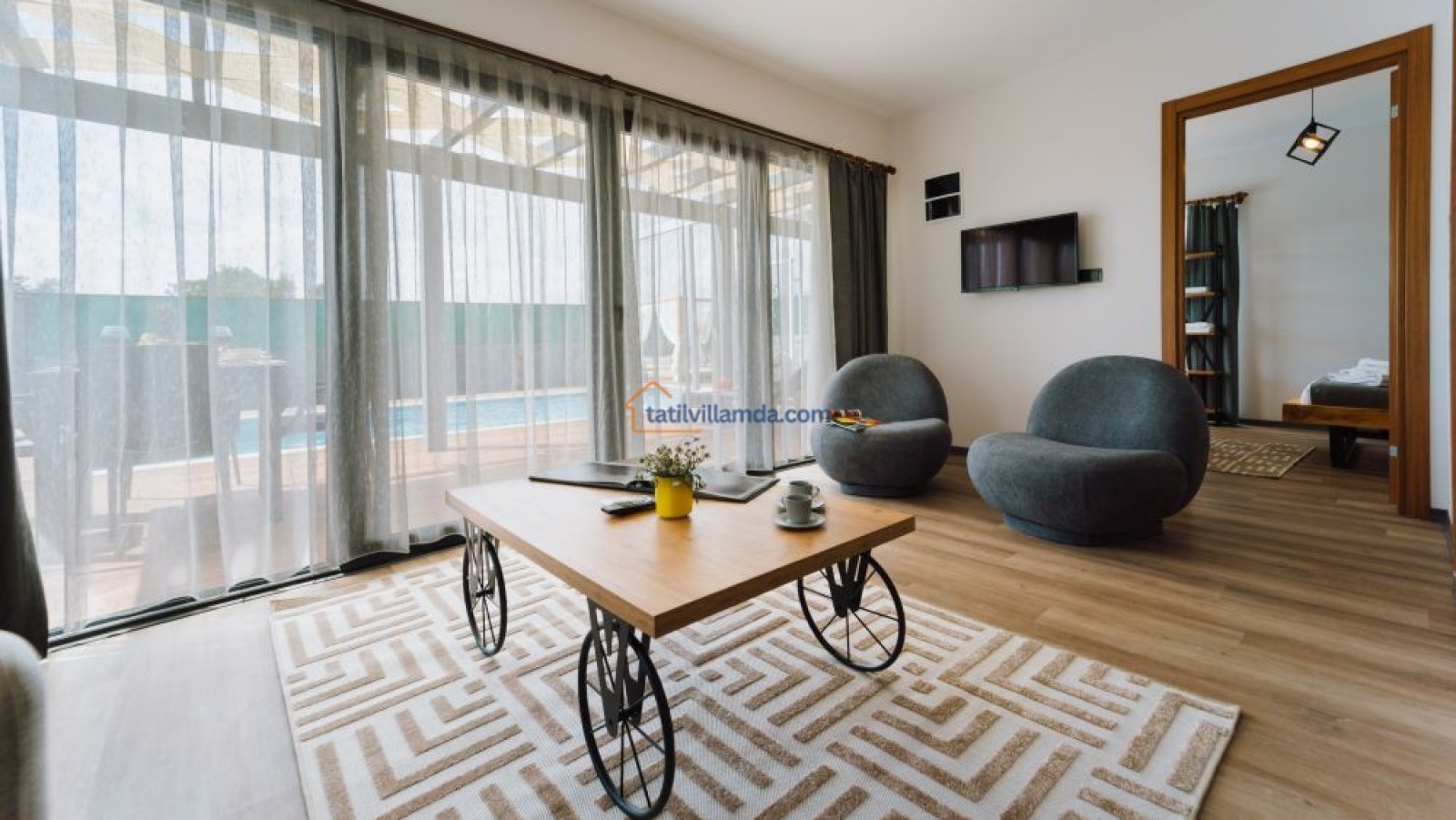 Villa, 1 yatak odası ve 1 salondan oluşur. Yatak odasında rahat bir çift kişilik yatak bulunurken, salondaki açılabilir koltuk 200×140 cm ölçülerinde olup, gerektiğinde ek yatak olarak kullanılabilir. Bu sayede villa, küçük aileler veya arkadaş grupları için de uygundur.