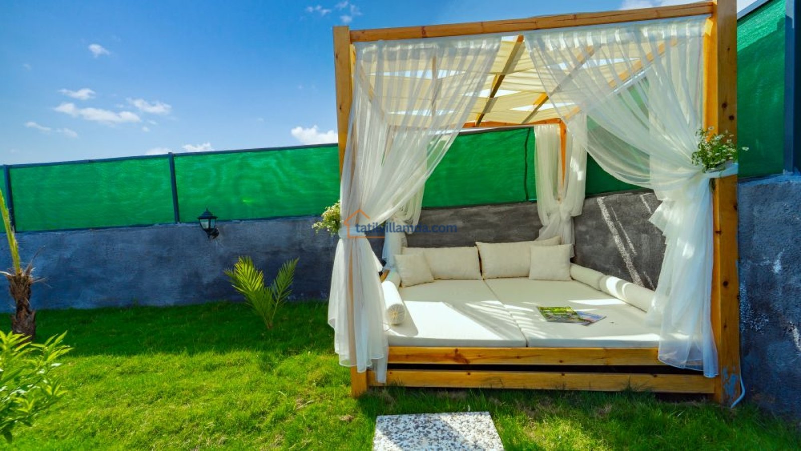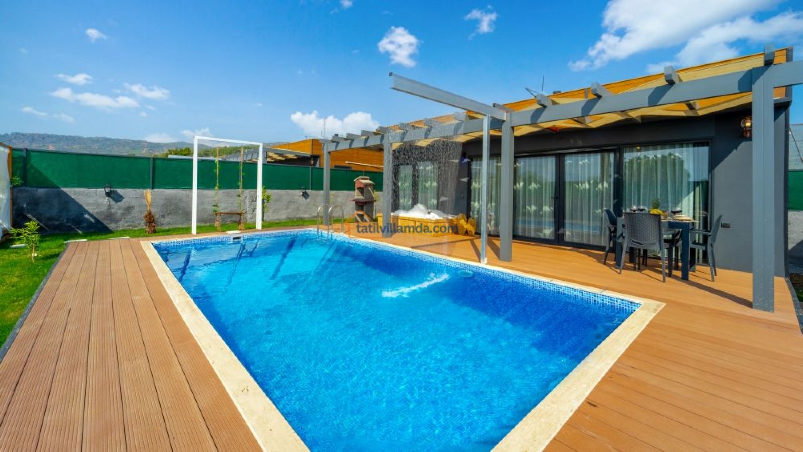 Korunaklı özel havuzu, dışarıdan görünmeyecek şekilde tasarlanmıştır, böylece tatilinizi huzur içinde geçirebilirsiniz. Havuz başında bir salıncak ve dinlenmek için keyifli bir ahşap loca kamelya mevcuttur. Gün boyu güneşlenip, akşamüstü serin bir içecekle gün batımını izleyebilirsiniz. Ayrıca villanın jakuzisi, tatilinize ekstra bir rahatlama ve lüks katacaktır.