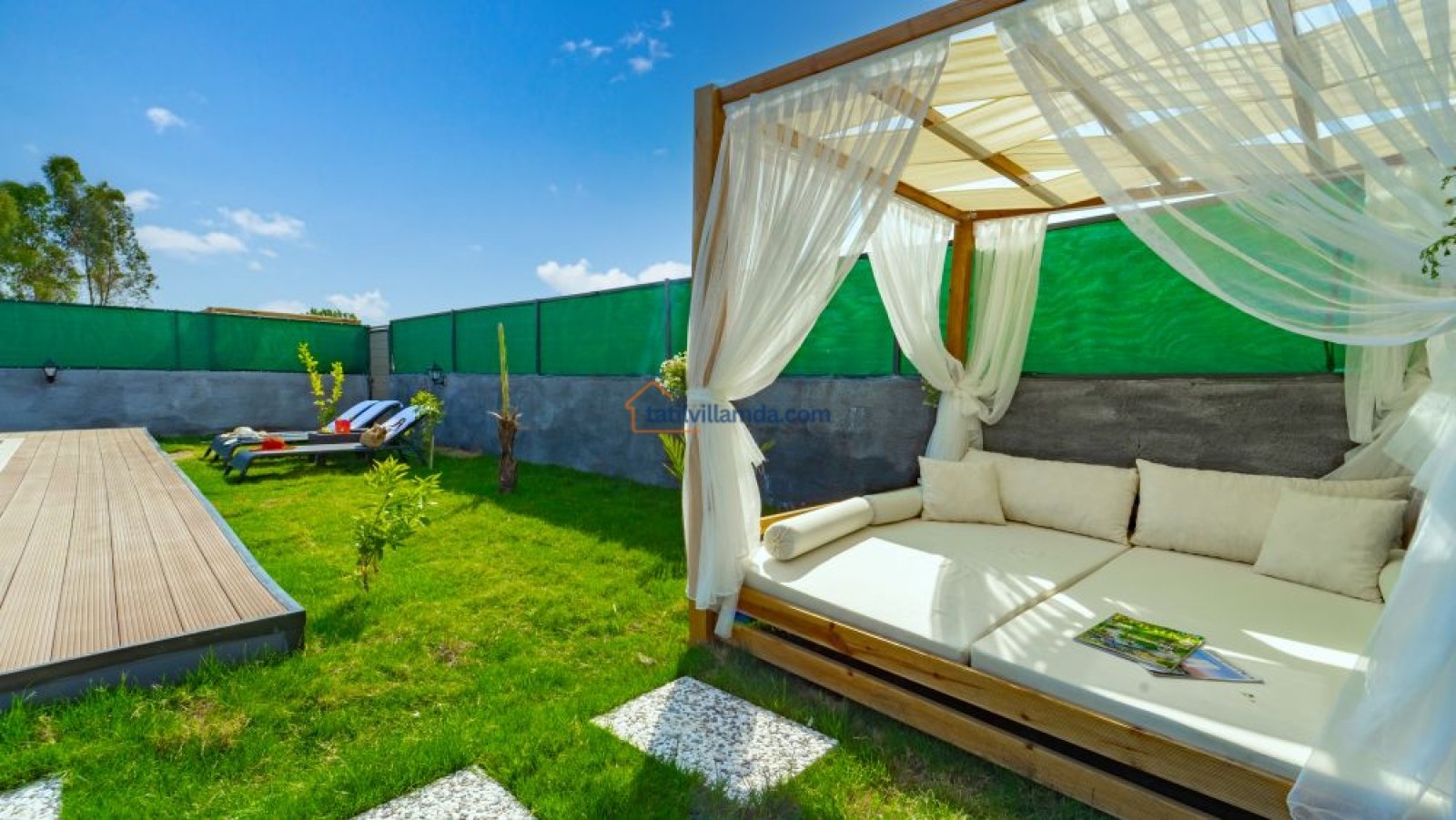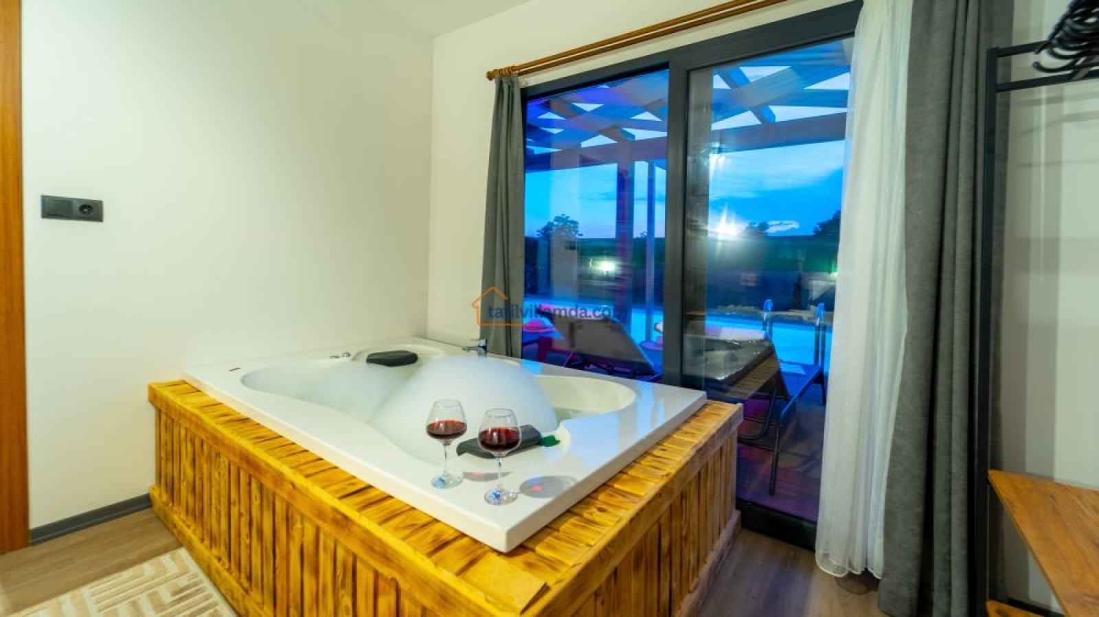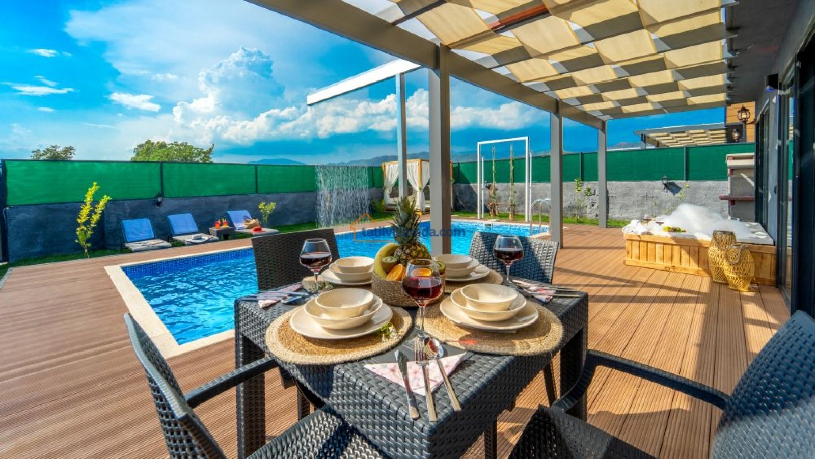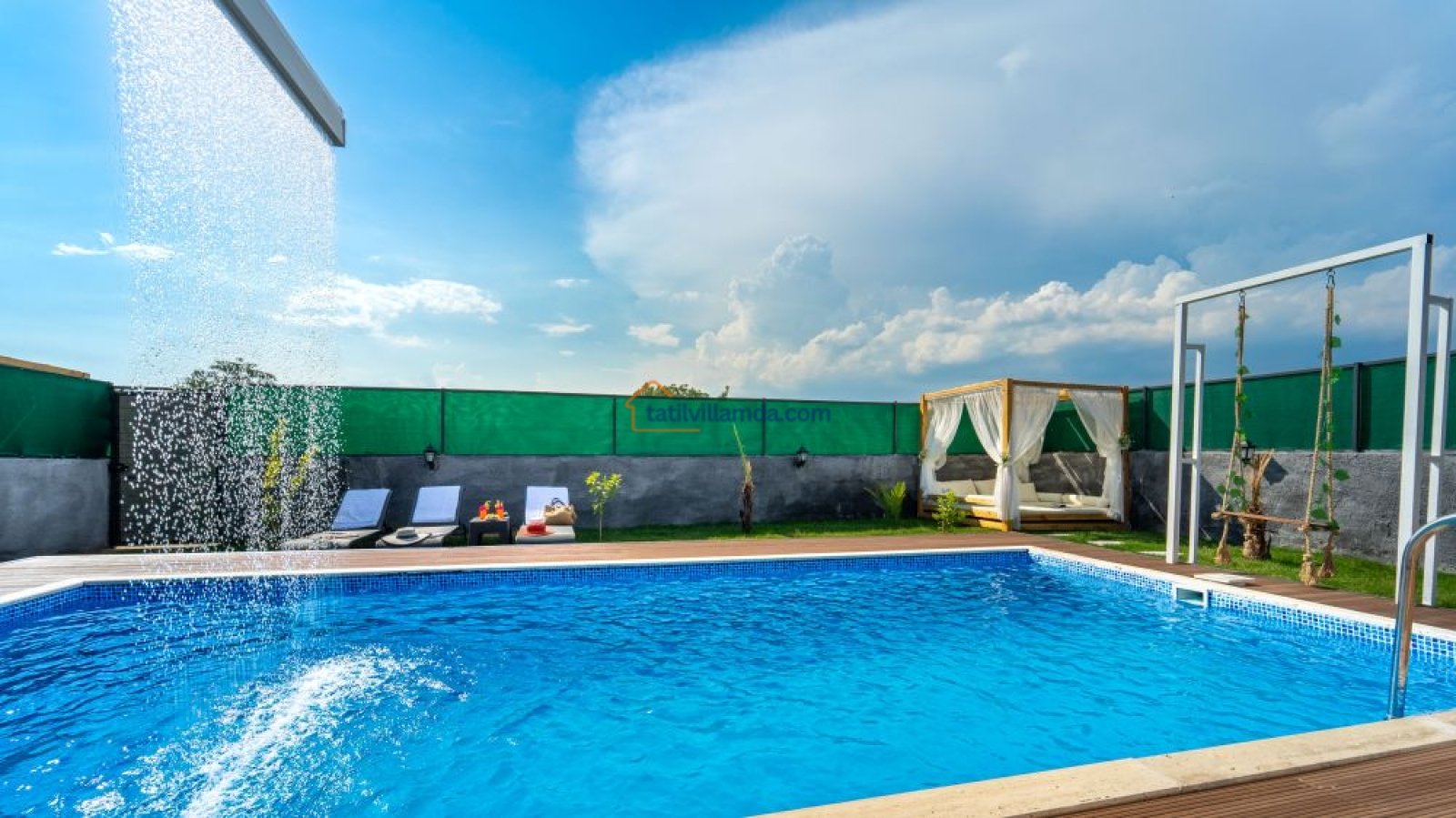 Korunaklı özel havuzu, dışarıdan görünmeyecek şekilde tasarlanmıştır, böylece tatilinizi huzur içinde geçirebilirsiniz. Havuz başında bir salıncak ve dinlenmek için keyifli bir ahşap loca kamelya mevcuttur. Gün boyu güneşlenip, akşamüstü serin bir içecekle gün batımını izleyebilirsiniz. Ayrıca villanın jakuzisi, tatilinize ekstra bir rahatlama ve lüks katacaktır.