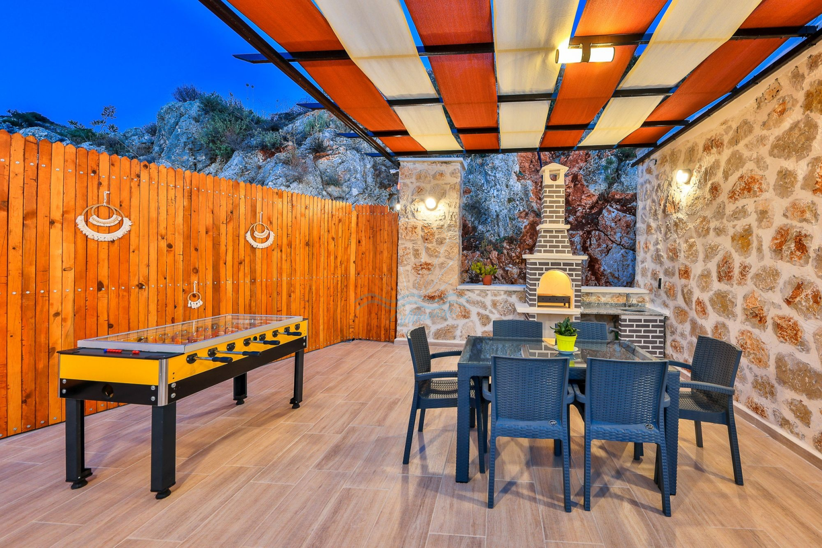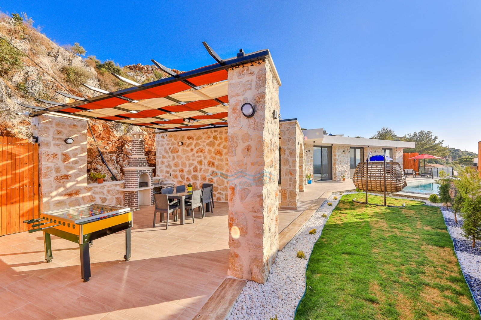 Havuz başında yer alan şezlonglar ve şemsiyeler güneşin tadını çıkarabilmeniz için düşünülmüştür. Salıncak, bahçe oturma grubu ve masa takımı, sevdiklerinizle uzun sohbetler edebileceğiniz, keyifli anlar yaşayabileceğiniz alanlar sunar. Barbekü ve langırt ise tatilinize eğlence ve lezzet katar.