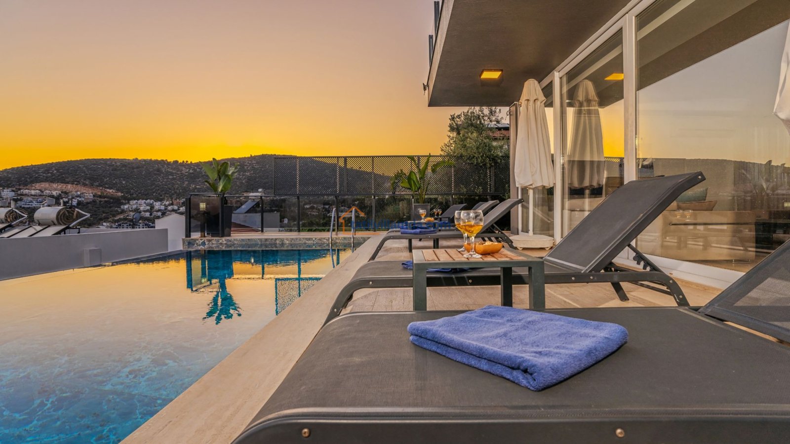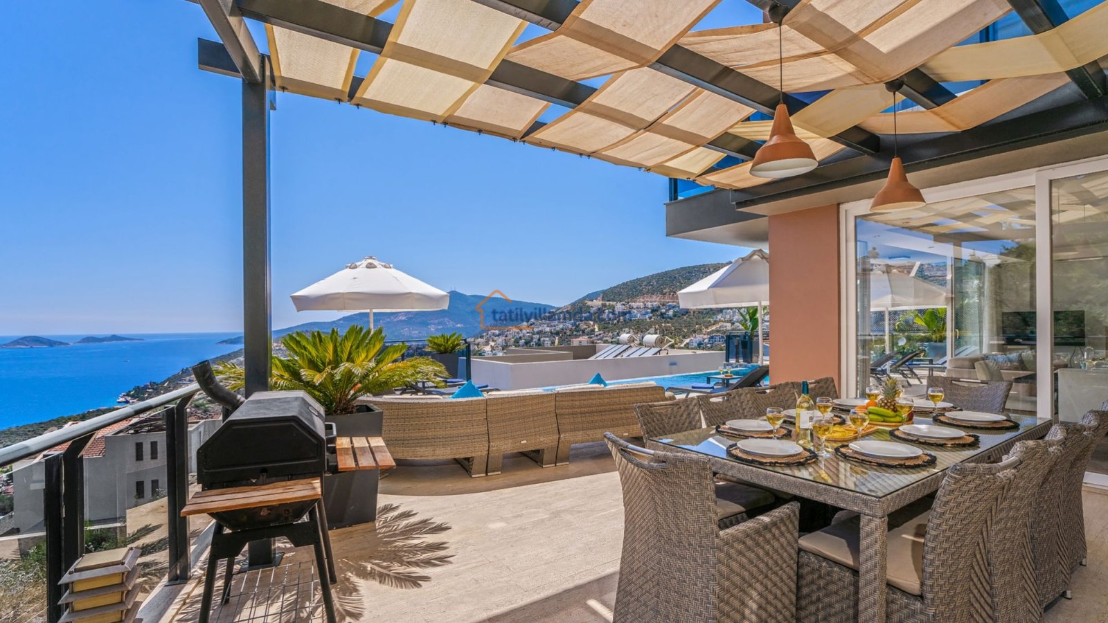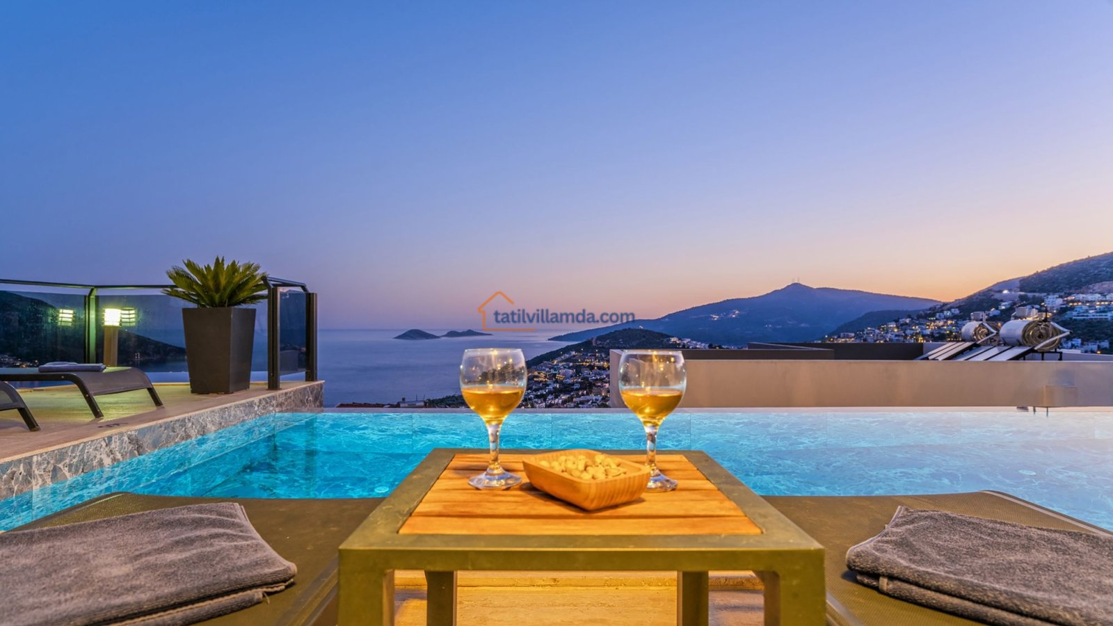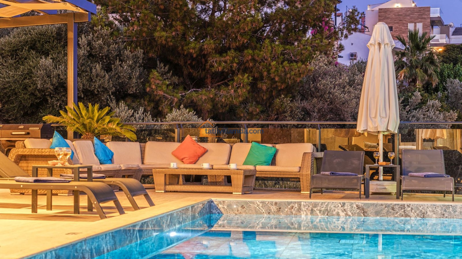 Villanın dış alanında 10×5 metre ölçülerinde geniş bir özel havuz bulunmaktadır. Havuz başında tatilin keyfini doyasıya çıkarabileceğiniz şezlonglar, güneşten korunabileceğiniz şemsiyeler, keyifli akşam yemekleri için barbekü alanı, konforlu oturma grubu ve masa takımı yer alır. Dilerseniz havuz ısıtma sistemi de aktif edilerek serin dönemlerde dahi rahatça havuz keyfi yapabilirsiniz. Tüm bu alanlar büyüleyici deniz manzarasına karşı konumlanmış olup gün batımında unutulmaz bir atmosfer sunmaktadır.