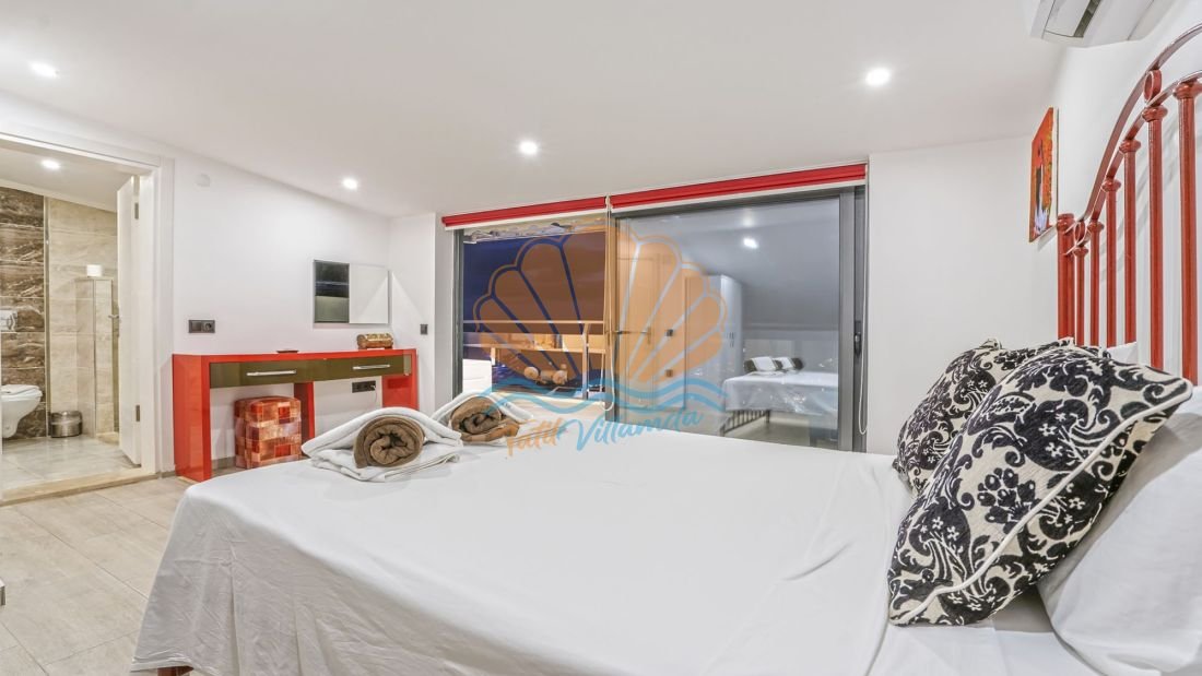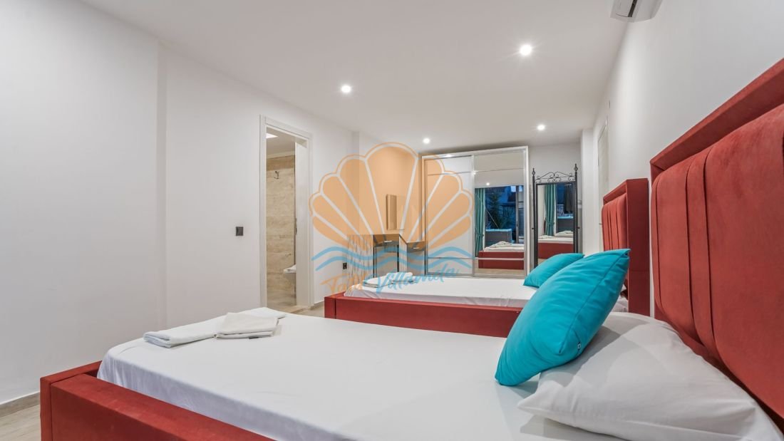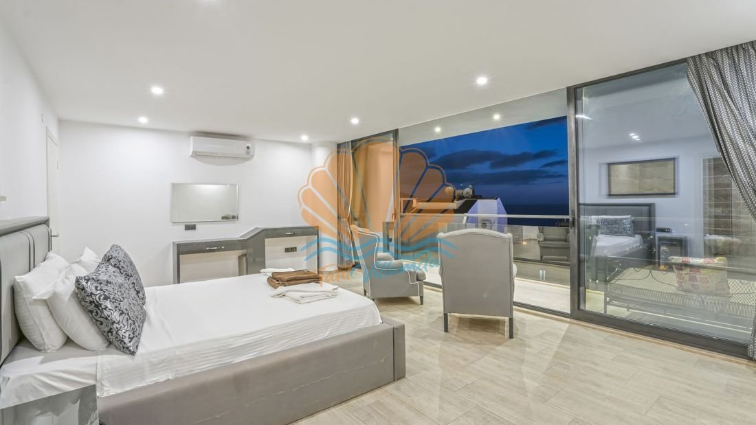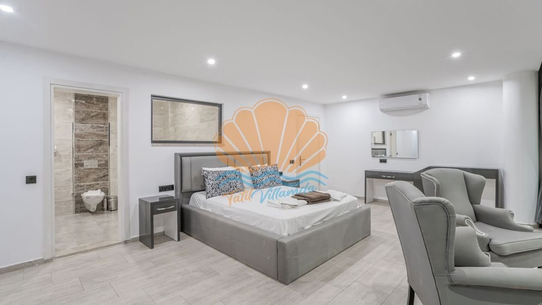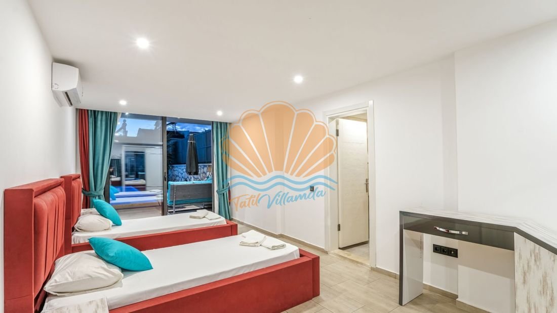 Toplam 4 yatak odasına sahip olan villa, 8 kişilik konaklama kapasitesine sahiptir. Tüm yatak odaları ebeveyn banyoludur ve misafirlerine maksimum konfor ile mahremiyet sağlar. Teras katında bulunan yatak odasında yer alan jakuzi ise deniz manzarası eşliğinde dinlenmek isteyen misafirler için ayrıcalıklı bir detaydır. Gün batımında jakuzide keyif yapmak tatilinize unutulmaz anlar katacaktır.
