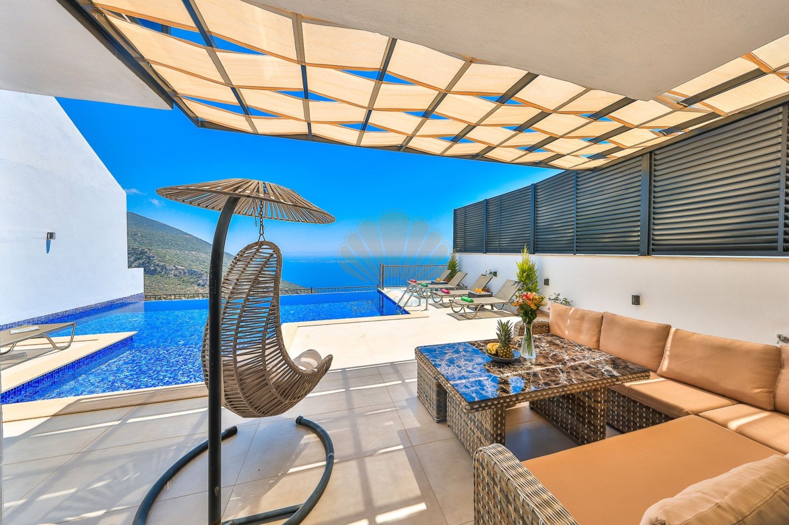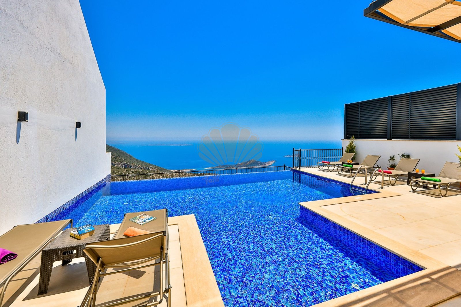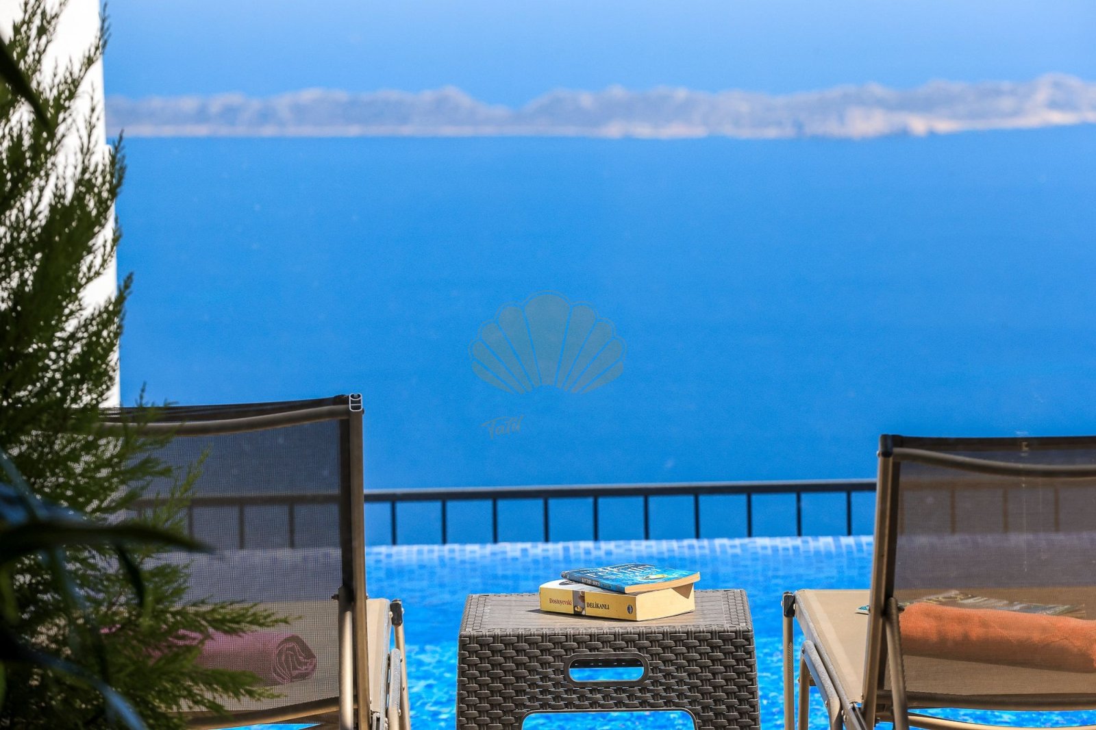 Deniz manzaralı sonsuzluk havuzu, villanın en dikkat çekici noktalarından biridir. Korunaklı ve geniş yapısı sayesinde gün boyu özgürce yüzebilir, güneşin tadını çıkarabilirsiniz. Havuz başında şezlonglar, şemsiye, salıncak ve bahçe oturma grubu yer alırken, akşamları barbekü keyfiyle tatilinize lezzet katabilirsiniz.