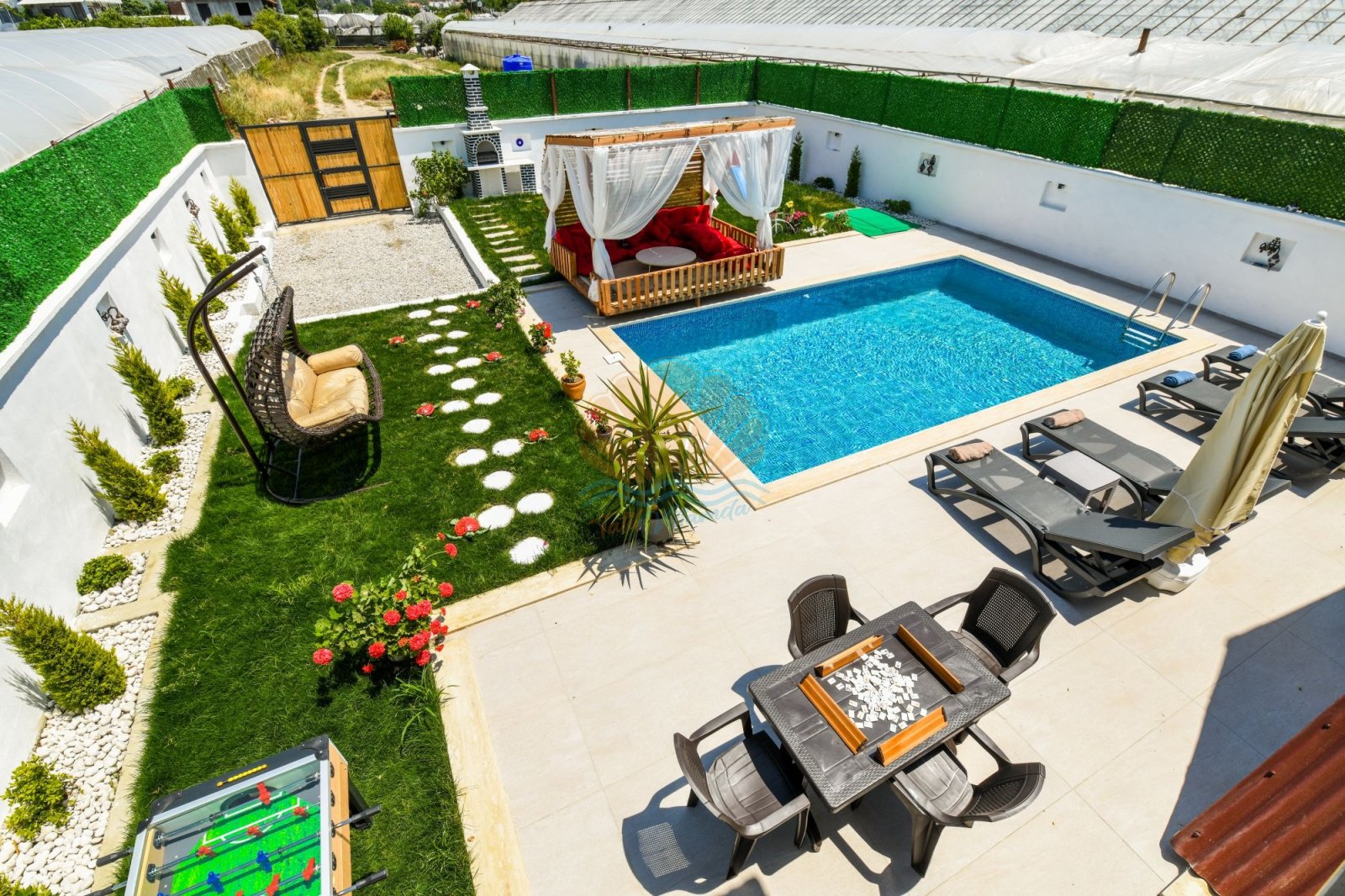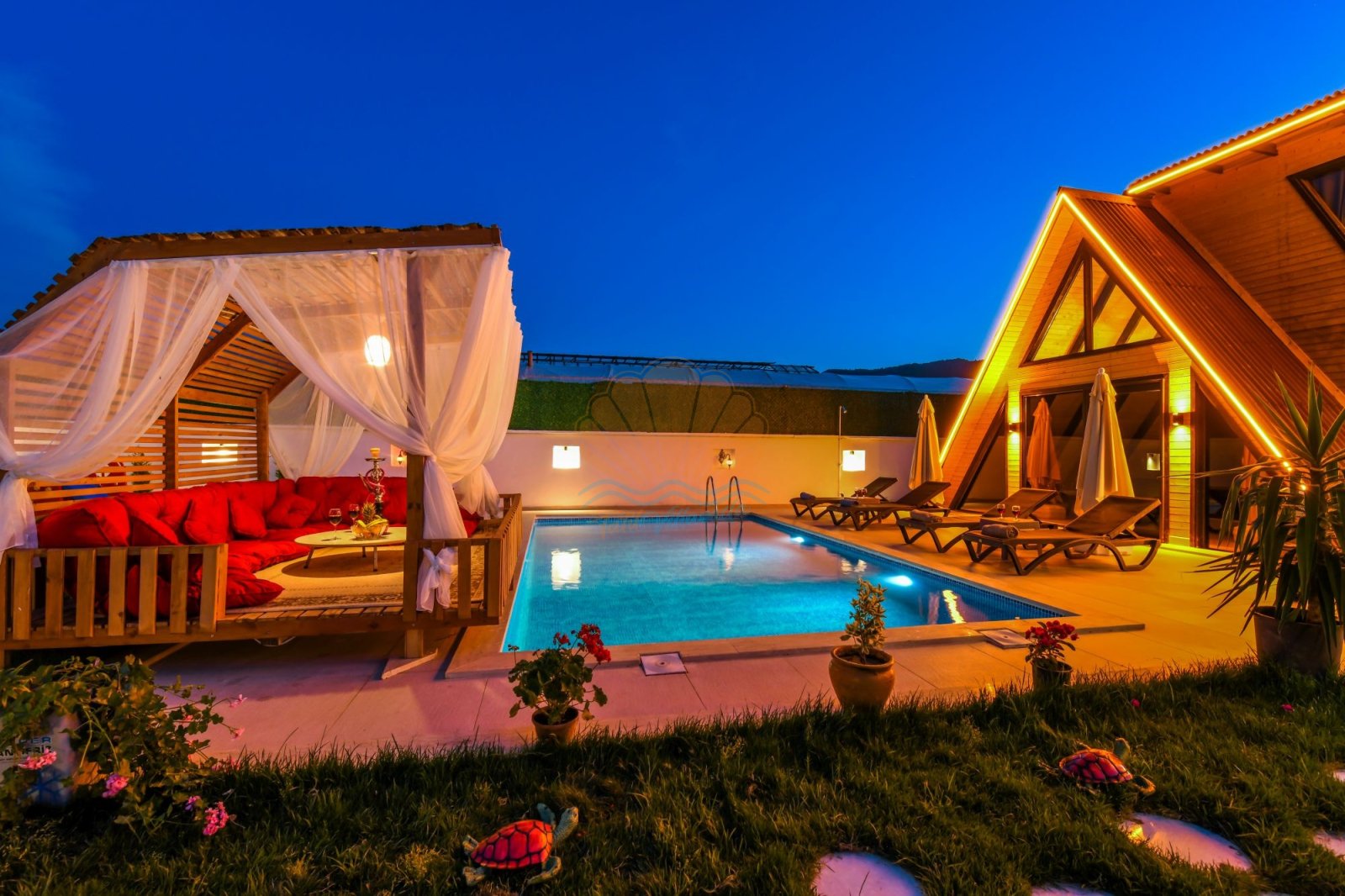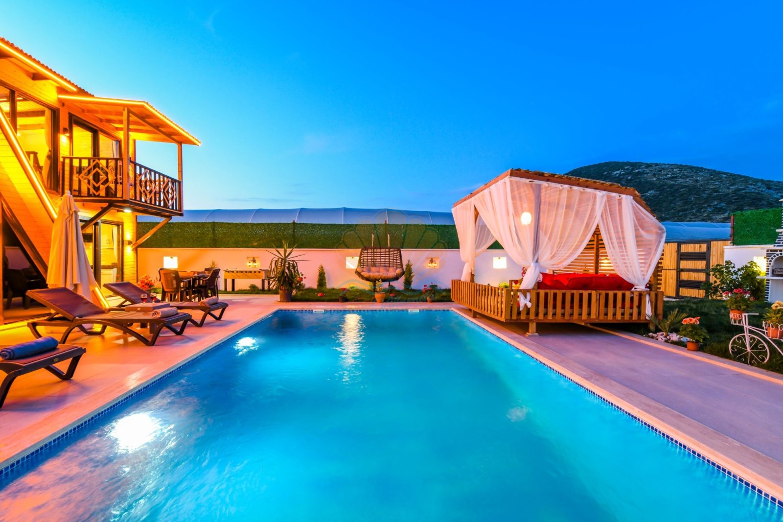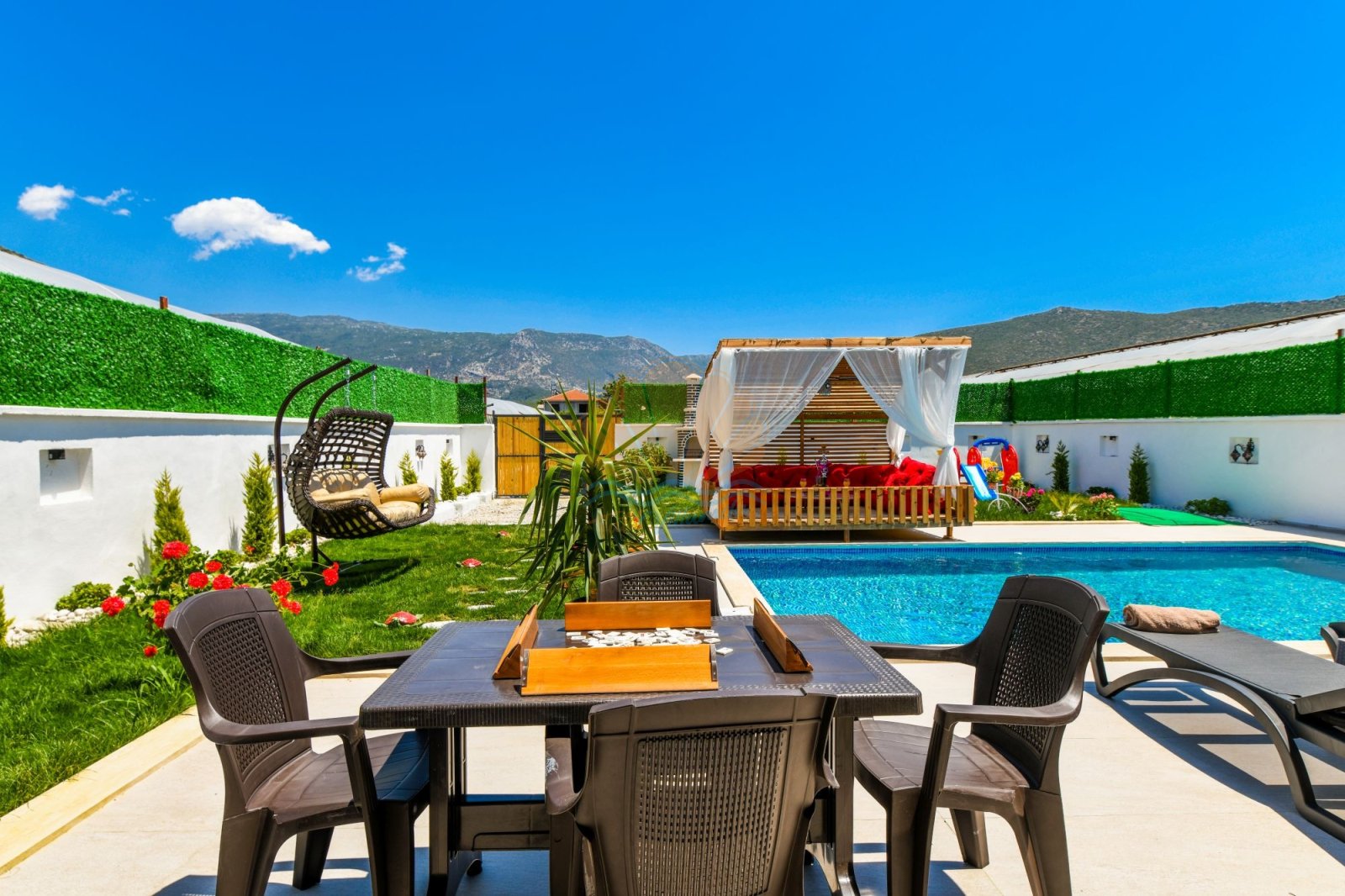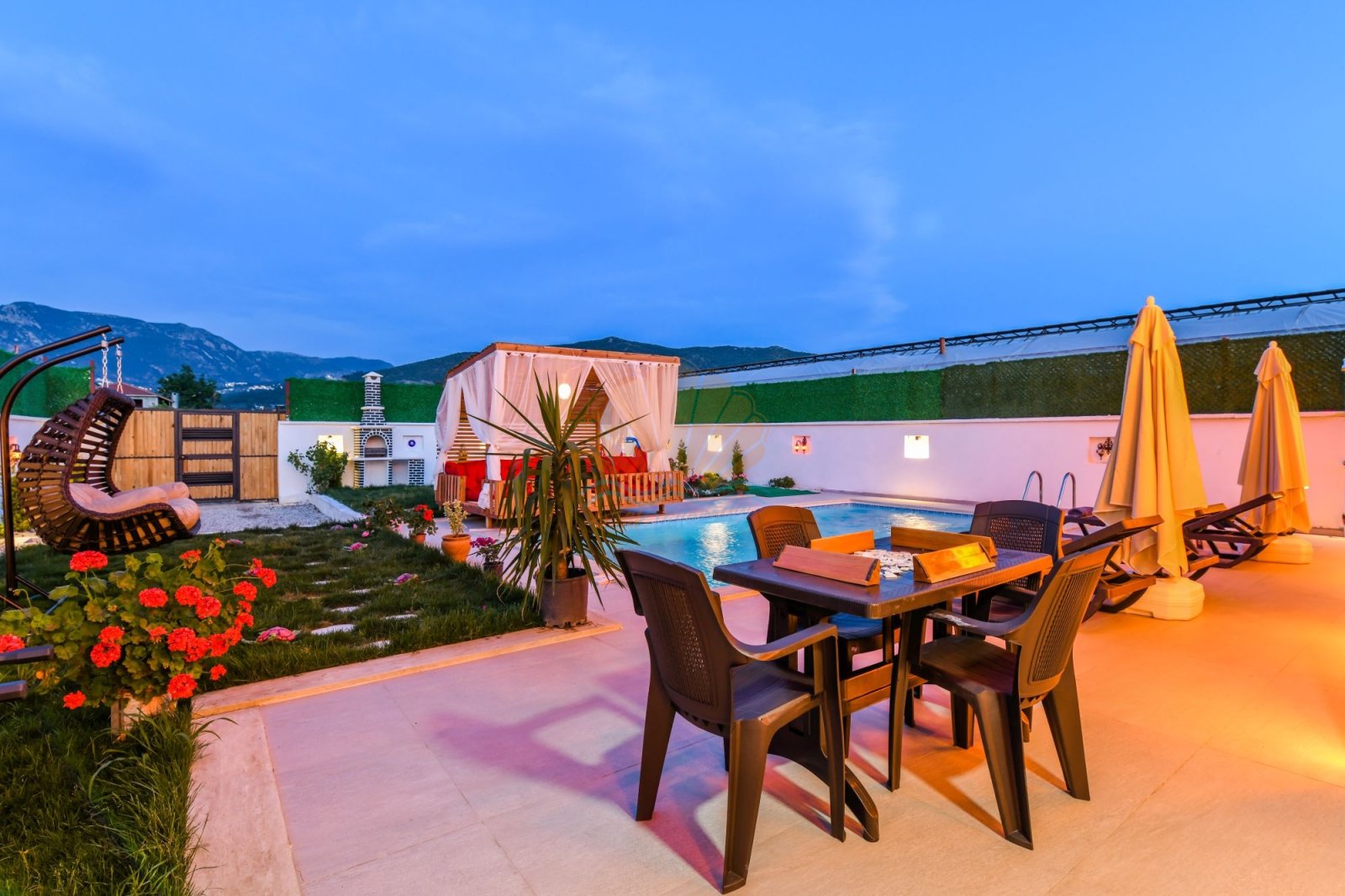 Geniş ve bakımlı bahçesi, Villa Anıl’ın en sevilen alanlarından biridir. Bahçede bulunan keyifli çardak ve oturma alanı, sabah kahvaltıları ya da akşam sohbetleri için ideal bir ortam oluşturur. Havuz başında yer alan şezlonglar, şemsiyeler, salıncak ve masa takımı sayesinde gün boyu güneşin ve serinliğin tadını çıkarabilirsiniz. Barbekü alanı ise sevdiklerinizle birlikte lezzetli akşam yemekleri hazırlamanıza olanak tanır.