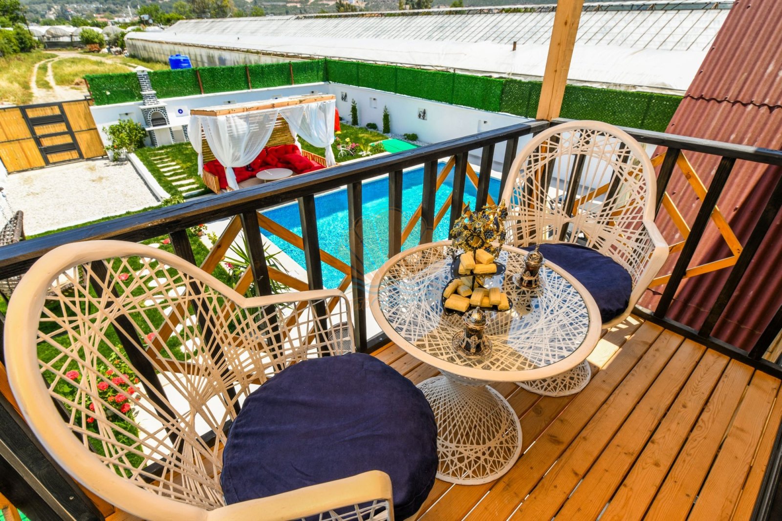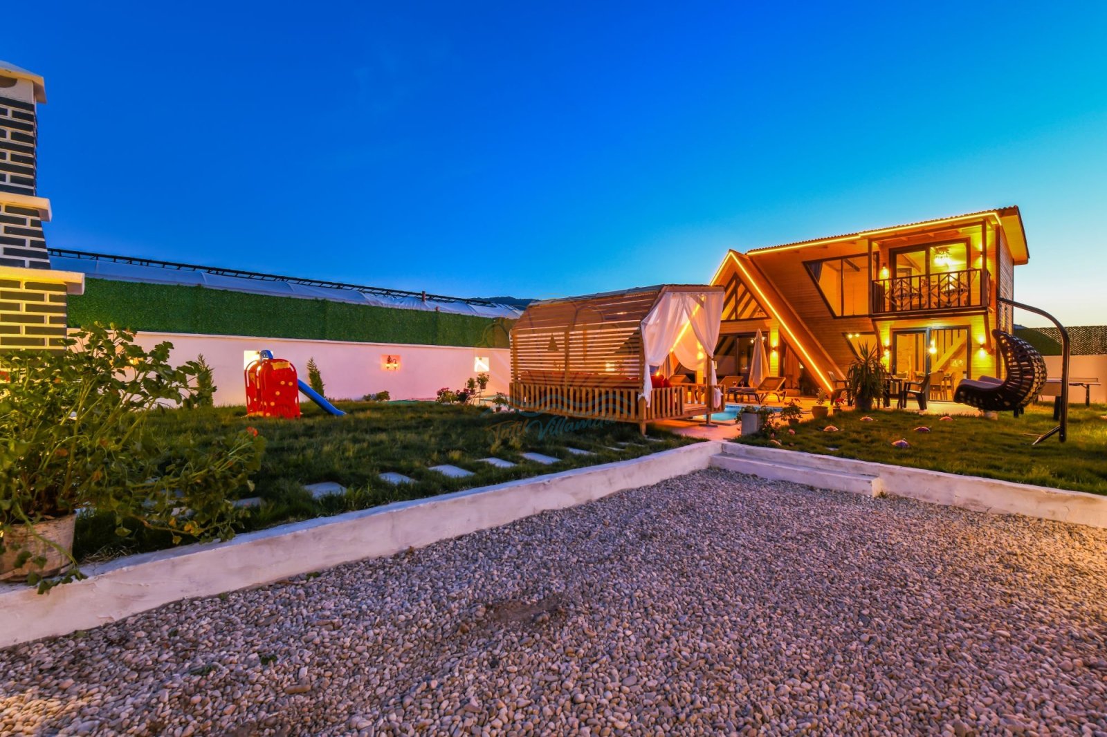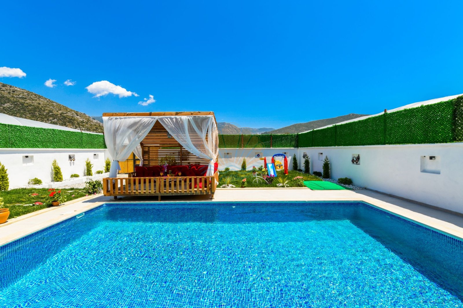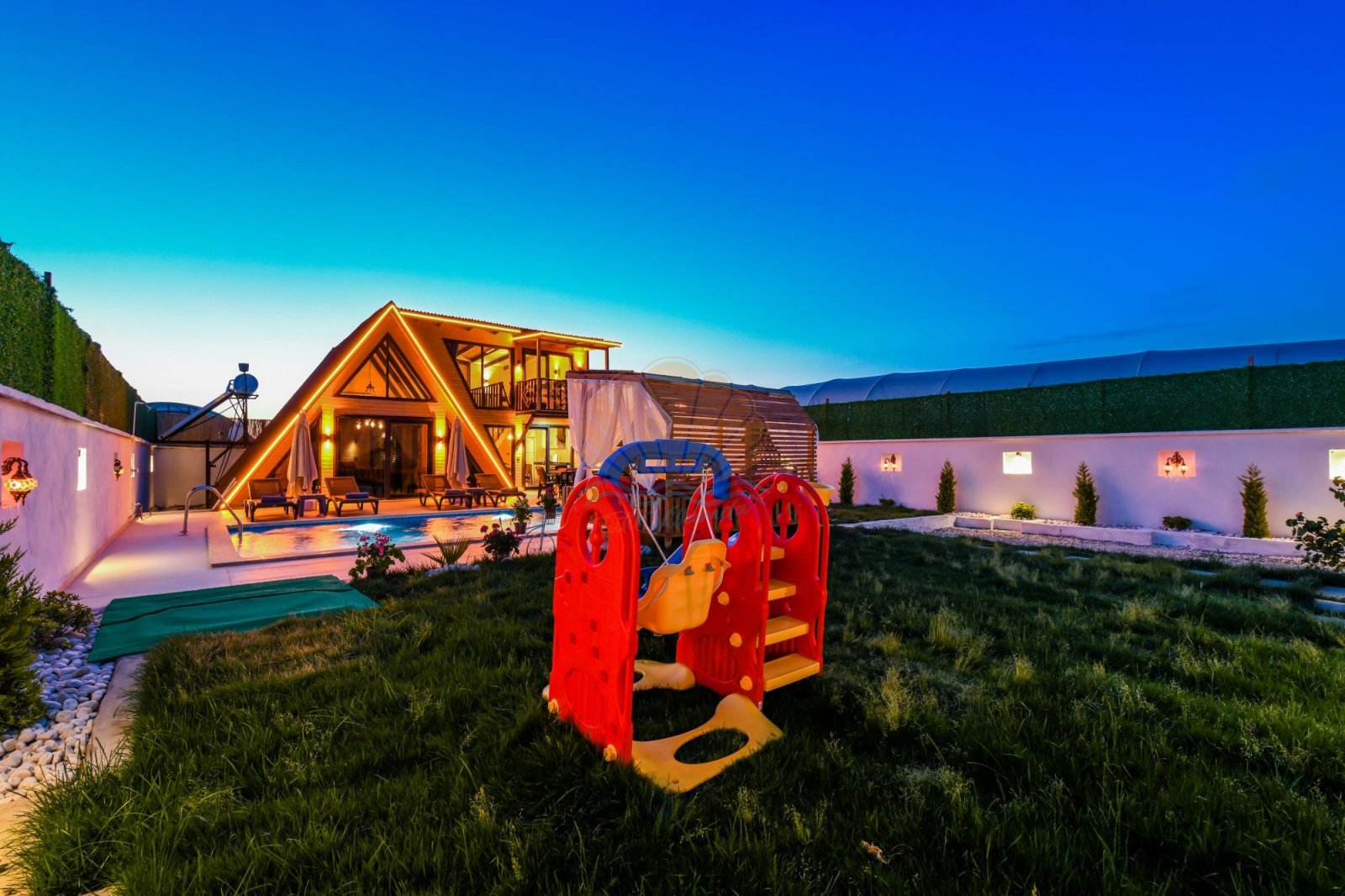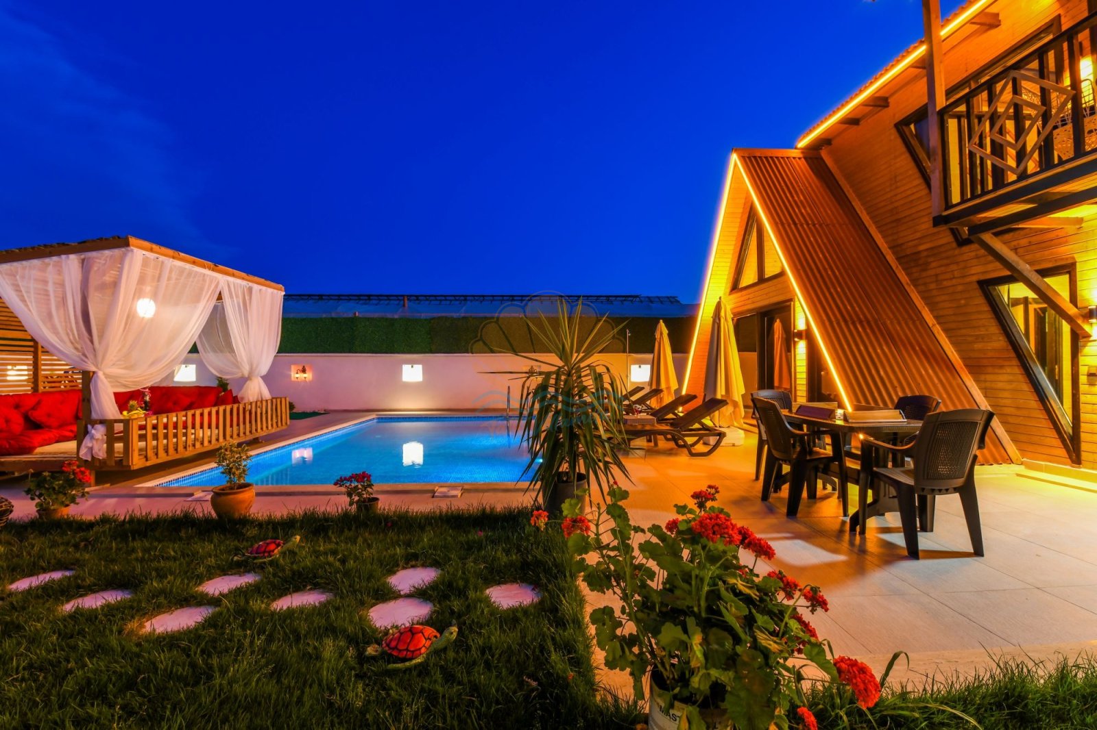 Geniş ve bakımlı bahçesi, Villa Anıl’ın en sevilen alanlarından biridir. Bahçede bulunan keyifli çardak ve oturma alanı, sabah kahvaltıları ya da akşam sohbetleri için ideal bir ortam oluşturur. Havuz başında yer alan şezlonglar, şemsiyeler, salıncak ve masa takımı sayesinde gün boyu güneşin ve serinliğin tadını çıkarabilirsiniz. Barbekü alanı ise sevdiklerinizle birlikte lezzetli akşam yemekleri hazırlamanıza olanak tanır.
