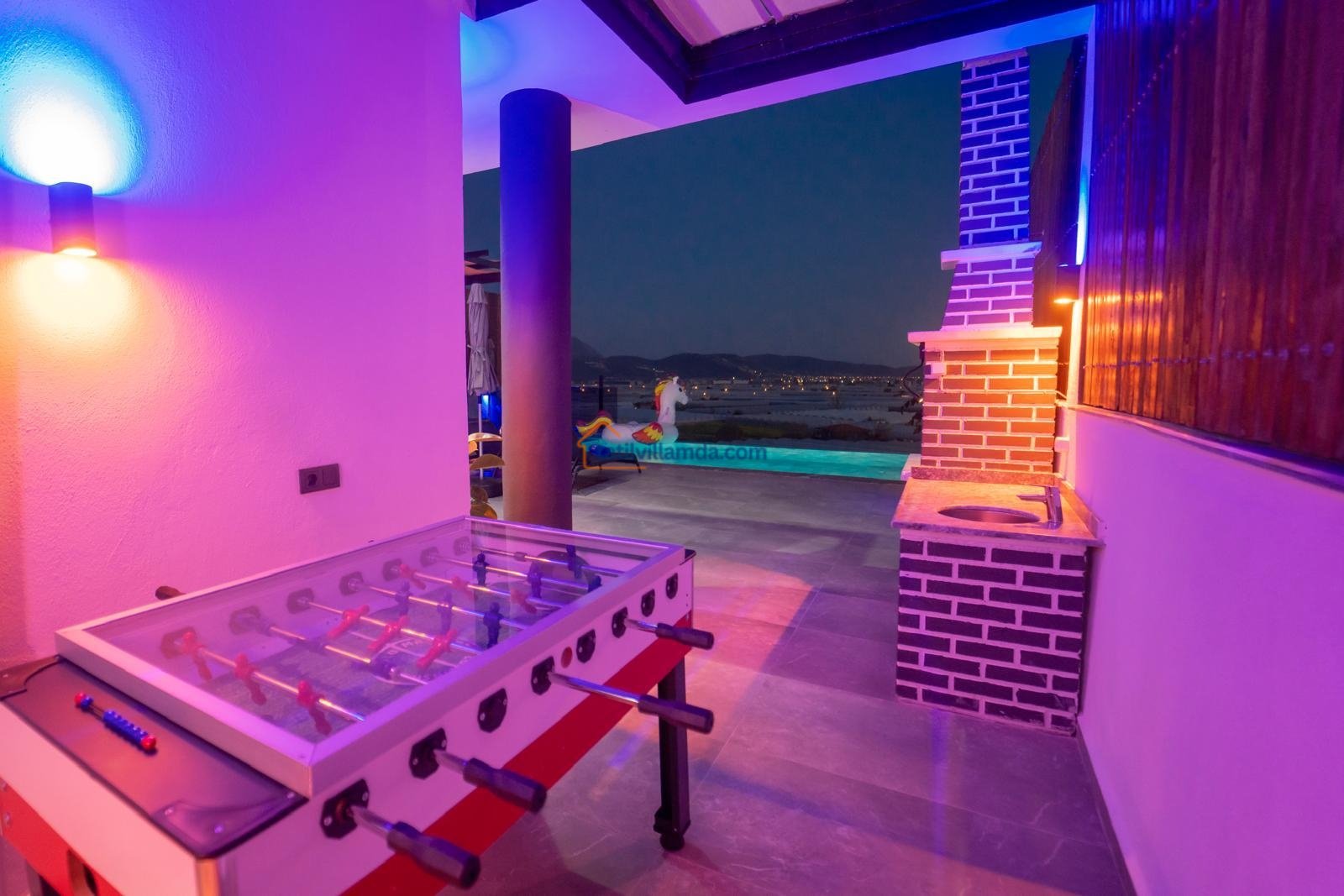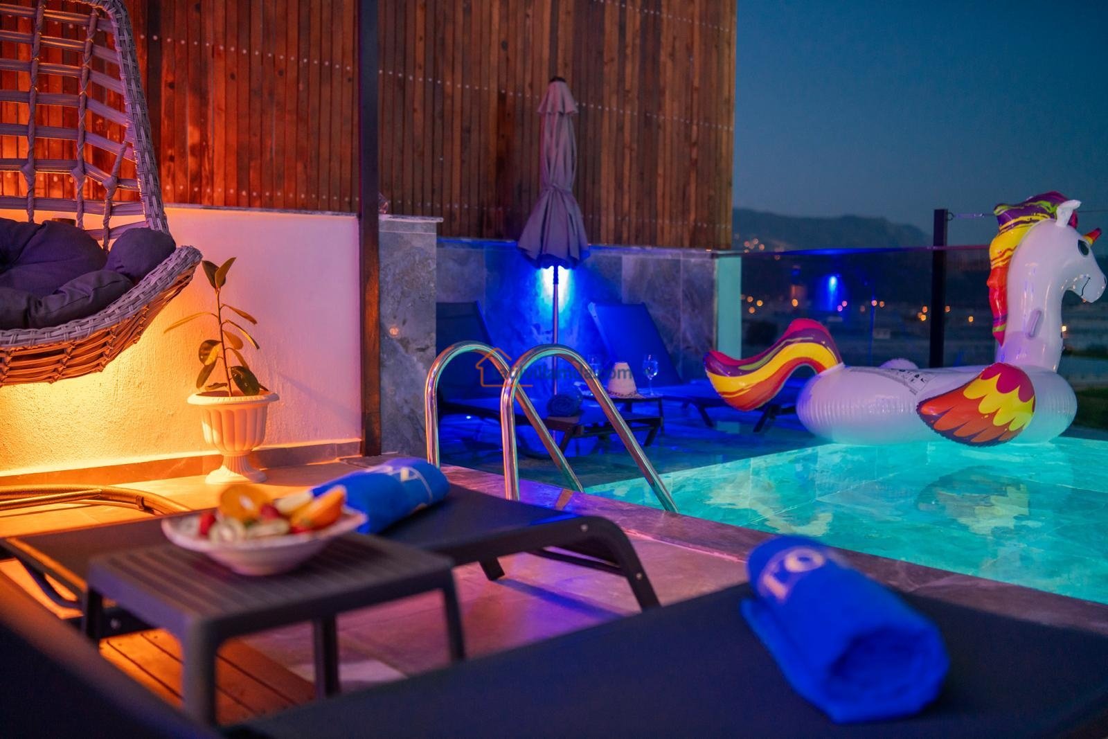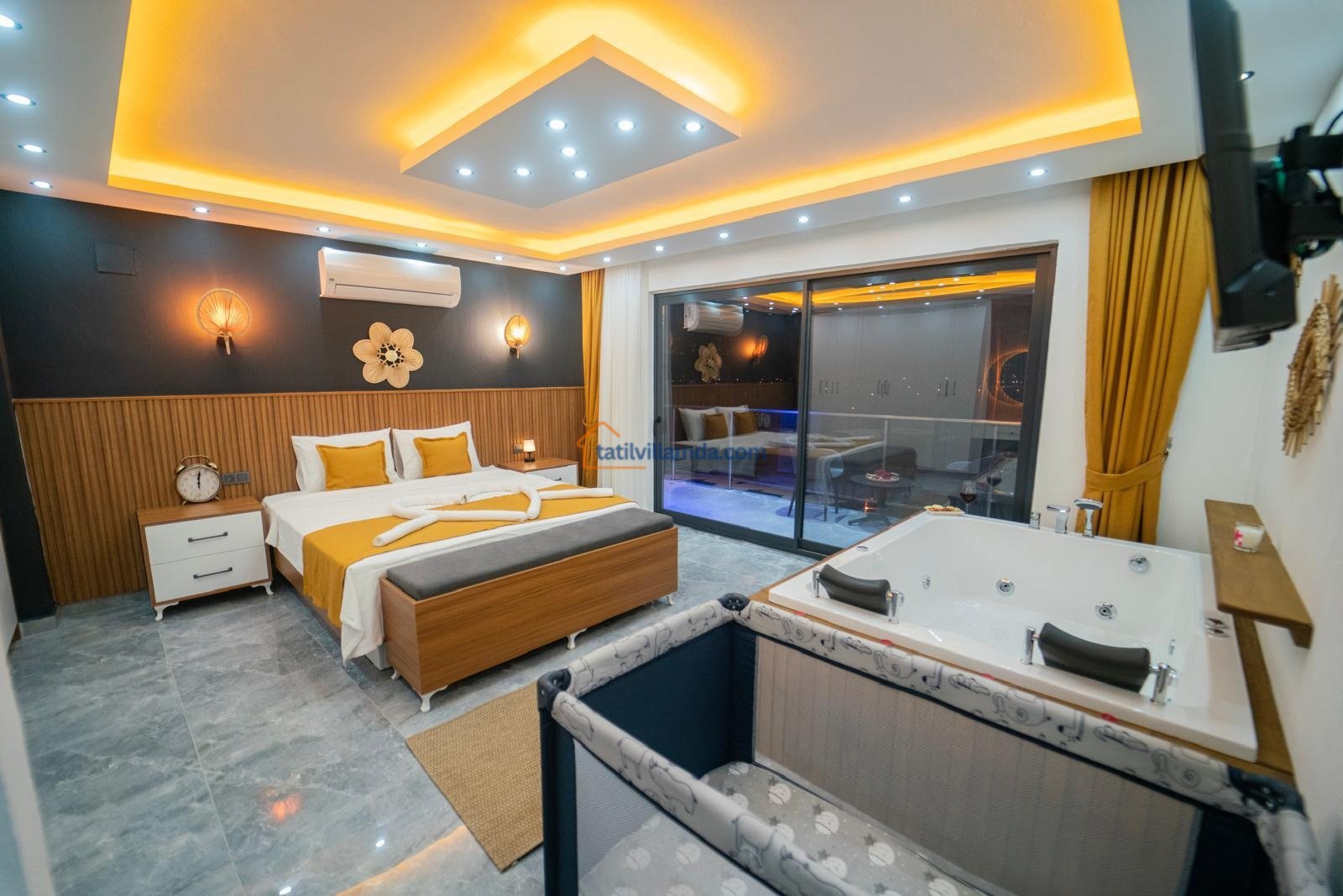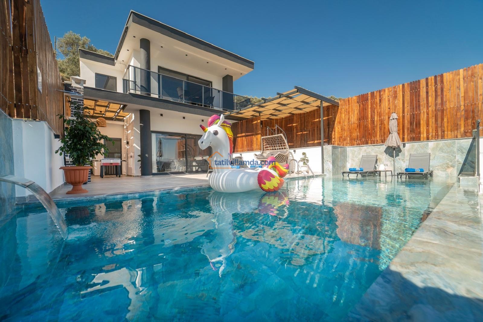 Kalkan Çavdır’da yer alan bu özel villamız, doğayla iç içe huzurlu bir tatil arayan misafirlerimiz için ideal bir seçenektir. 2 yatak odalı ve 5 kişilik konaklama kapasitesine sahip villamız, korunaklı özel yüzme havuzu sayesinde muhafazakâr aileler için de uygundur. Ebeveyn odasında yer alan jakuzi, tatilinize konfor ve keyif katarken, havuz başında bulunan langırt masası da eğlenceli vakitler geçirmenizi sağlar.