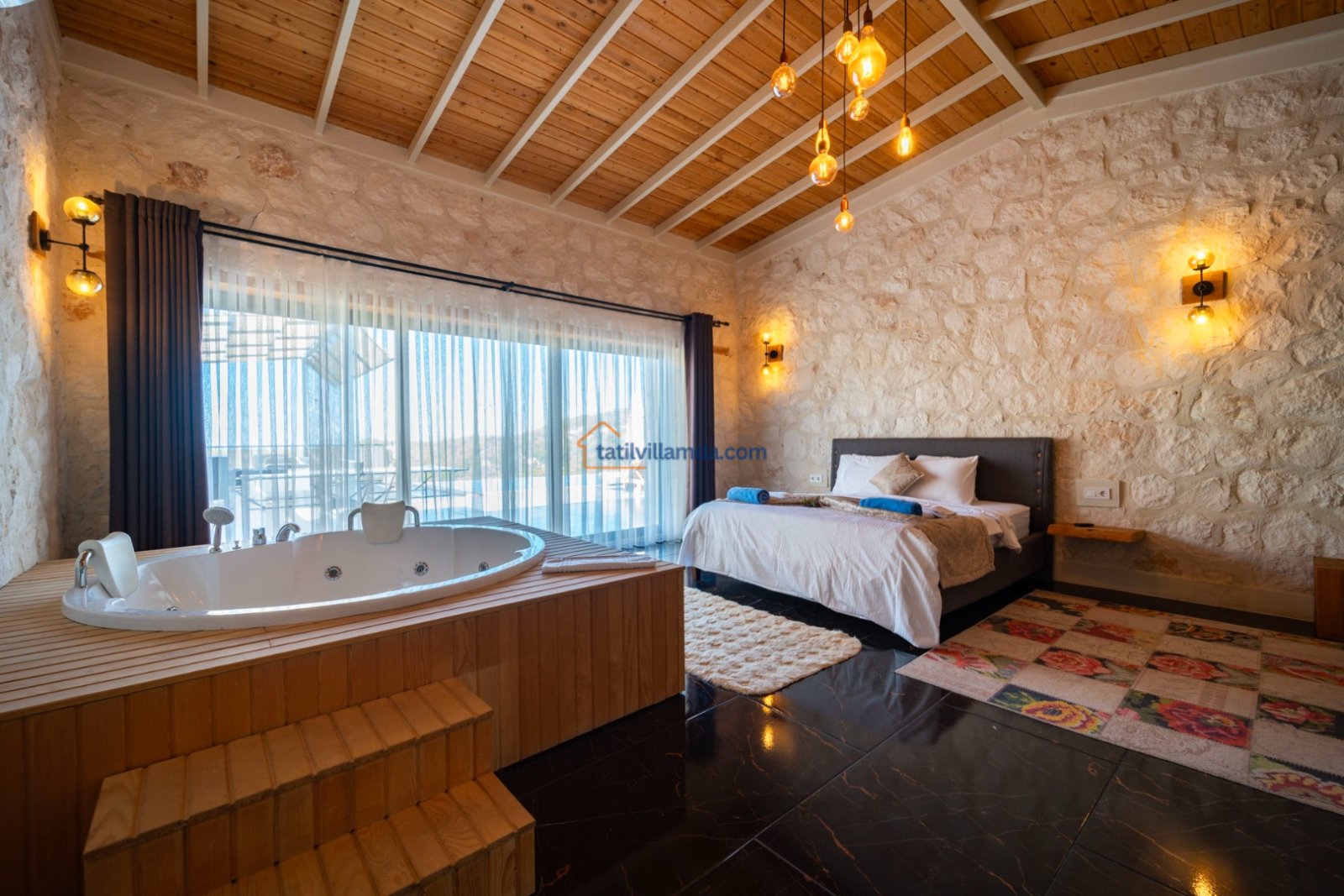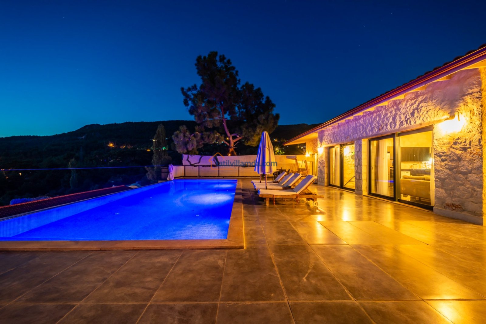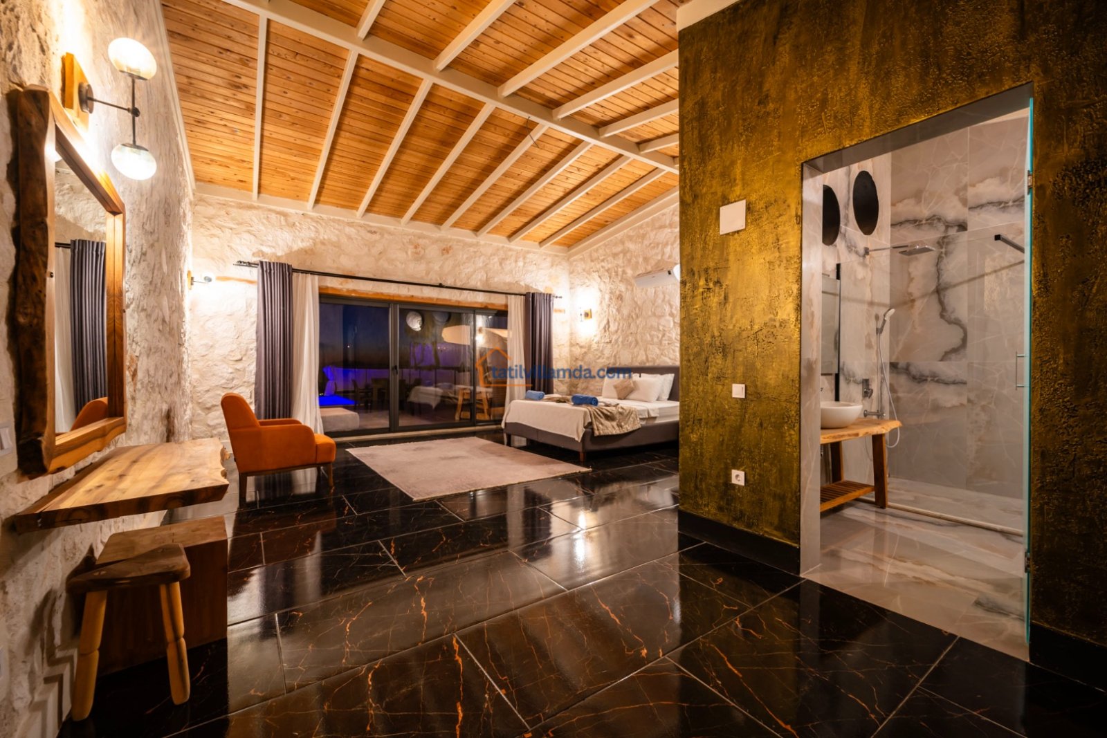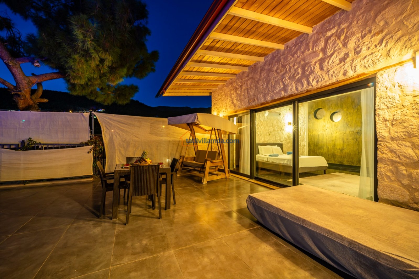 Villa Ateş Eco, Kalkan’ın huzur veren İslamlar bölgesinde doğayla iç içe konumlanmış modern ve lüks bir tatil villasıdır. Muhteşem manzarası, korunaklı özel havuzu ve şık mimarisiyle dört kişilik aileler ve arkadaş grupları için ideal bir konaklama sunar. İki yatak odasının her biri özel banyoya sahiptir; ebeveyn odasında ayrıca jakuzi ve TV bulunmaktadır. Geniş ve ferah salonda konforlu oturma grubu, klima, TV ve havuz terasına direkt çıkış yer alır. Amerikan mutfakta buzdolabı, bulaşık makinesi, çamaşır makinesi, fırın, mikrodalga ve yemek ekipmanları eksiksiz şekilde sunulmaktadır. Villa Ateş’in korunaklı bahçesinde bulunan özel yüzme havuzu, şezlonglar ve oturma alanları misafirlerine sakin ve keyifli bir tatil imkânı sağlar. Villa Hava Eco, Villa Toprak Eco ve Villa Su Eco gibi yan komşu villalarla birlikte kalabalık gruplar için de avantajlıdır. Doğal yaşamının içinde yer alan villa, doğa severler için unutulmaz ve konforlu bir tatil deneyimi sunar.