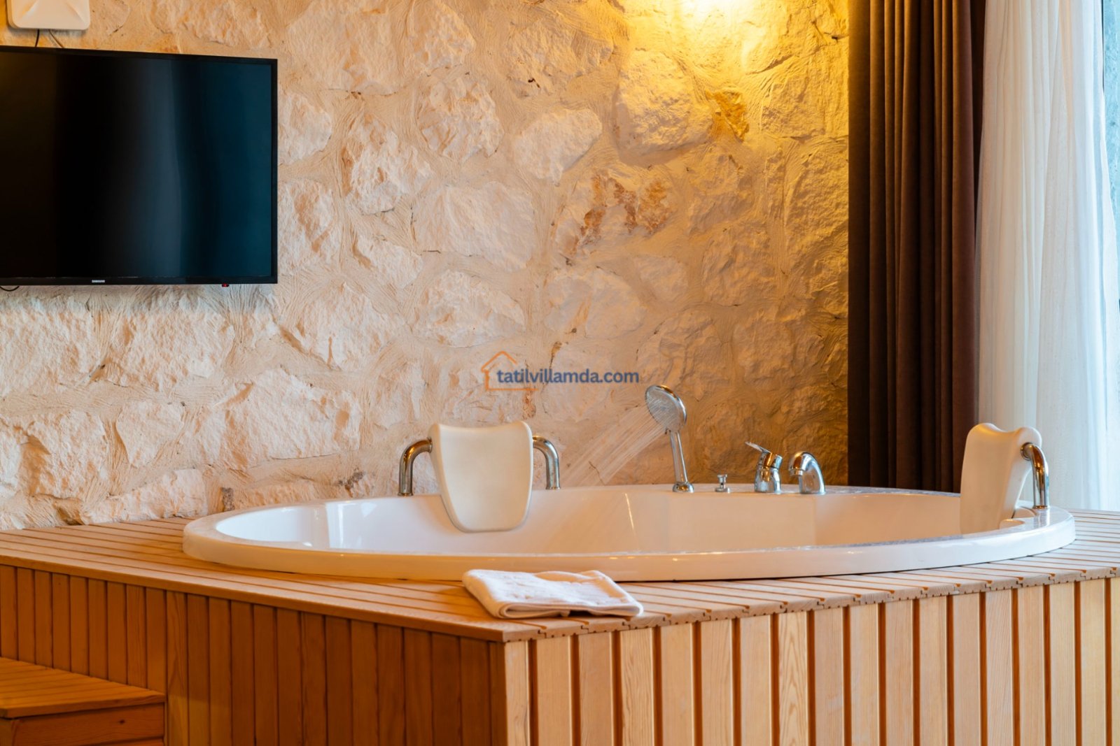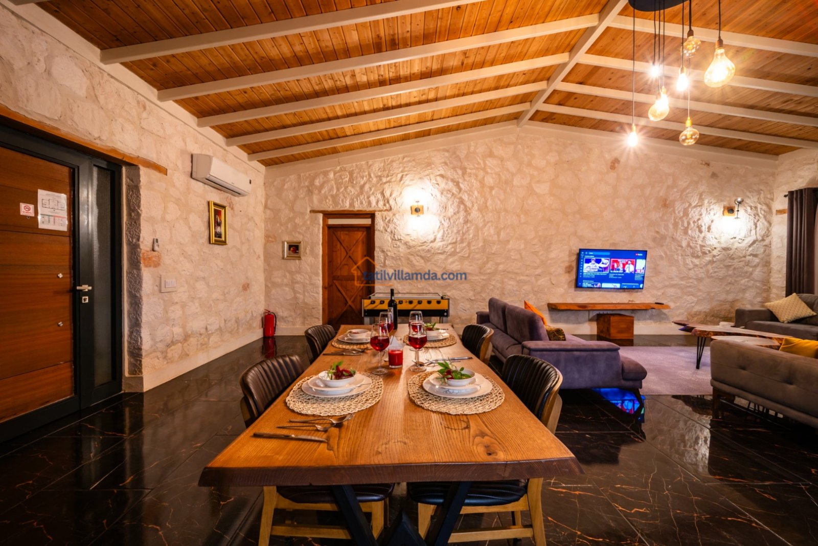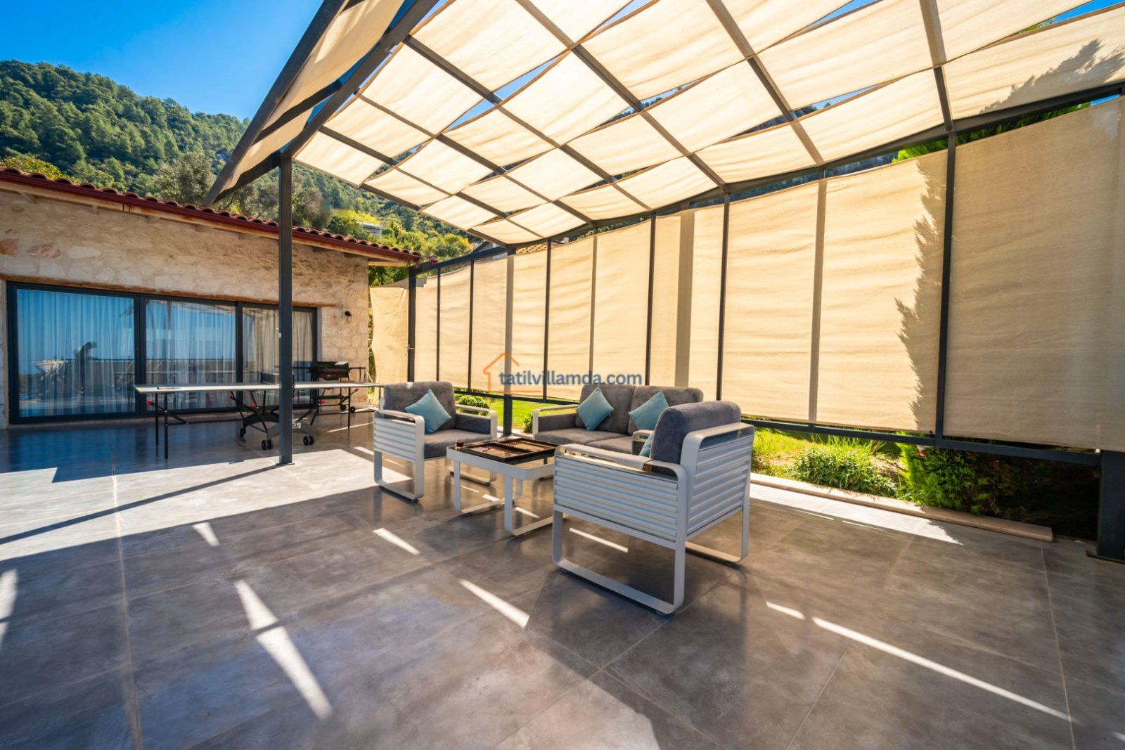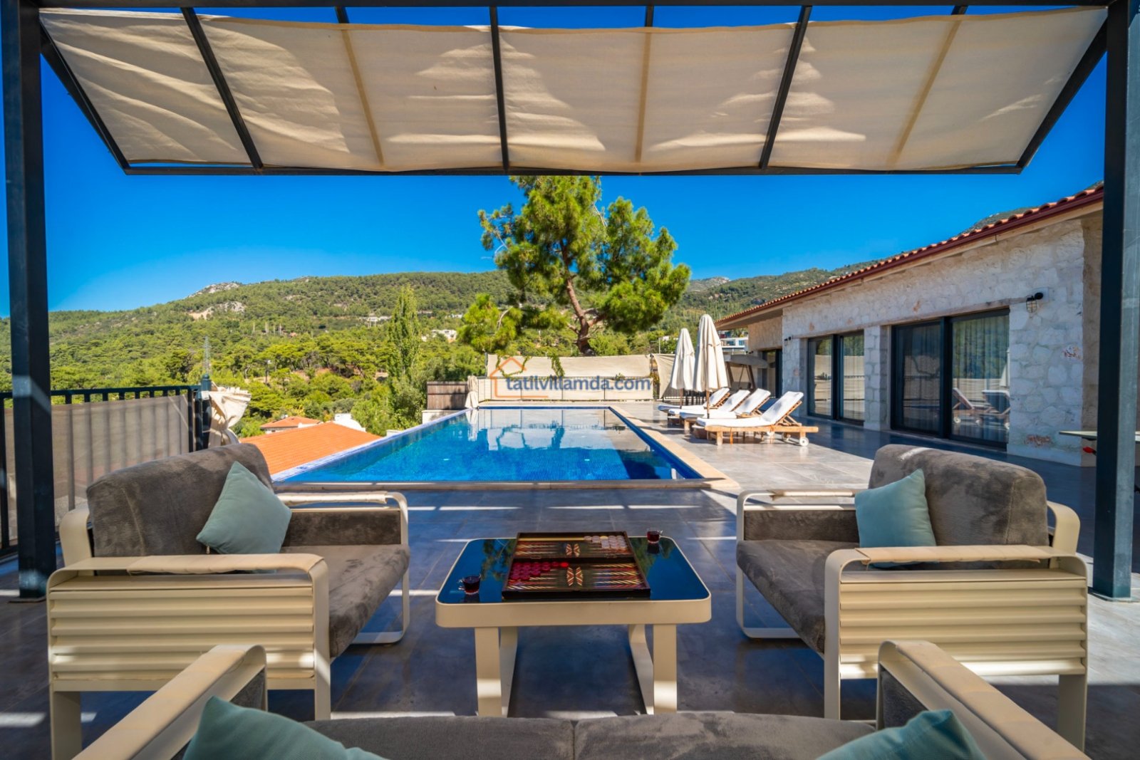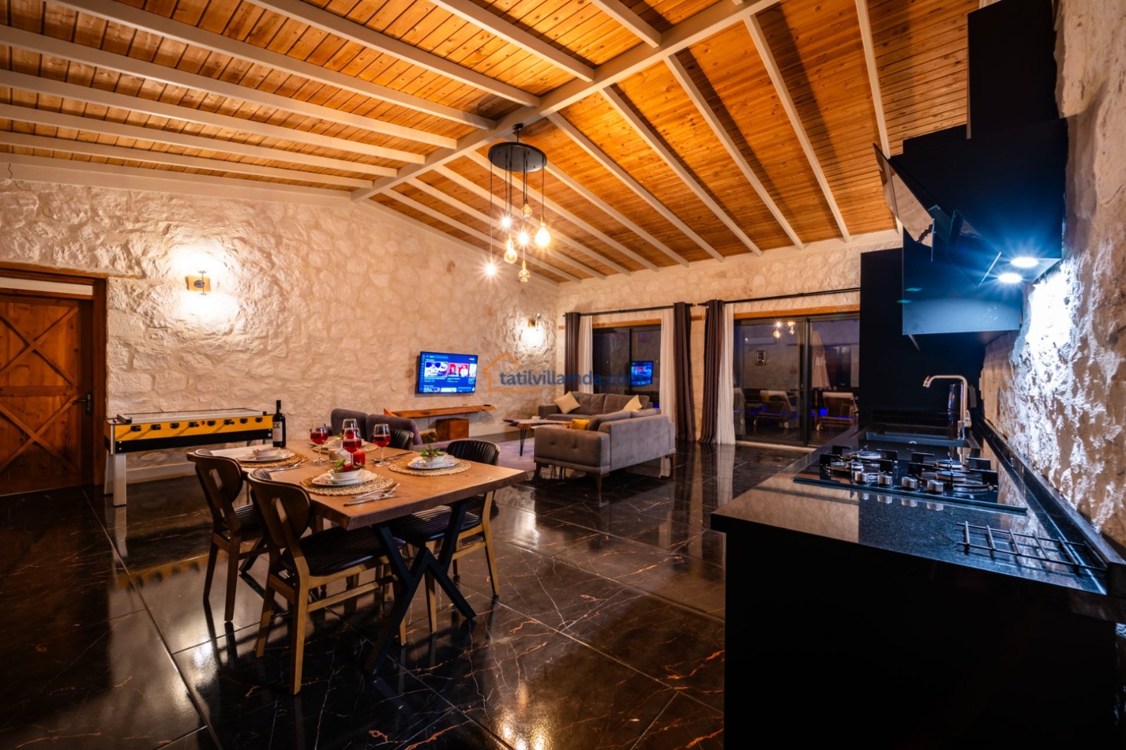 Villa Ateş Eco, Kalkan’ın huzur veren İslamlar bölgesinde doğayla iç içe konumlanmış modern ve lüks bir tatil villasıdır. Muhteşem manzarası, korunaklı özel havuzu ve şık mimarisiyle dört kişilik aileler ve arkadaş grupları için ideal bir konaklama sunar. İki yatak odasının her biri özel banyoya sahiptir; ebeveyn odasında ayrıca jakuzi ve TV bulunmaktadır. Geniş ve ferah salonda konforlu oturma grubu, klima, TV ve havuz terasına direkt çıkış yer alır. Amerikan mutfakta buzdolabı, bulaşık makinesi, çamaşır makinesi, fırın, mikrodalga ve yemek ekipmanları eksiksiz şekilde sunulmaktadır. Villa Ateş’in korunaklı bahçesinde bulunan özel yüzme havuzu, şezlonglar ve oturma alanları misafirlerine sakin ve keyifli bir tatil imkânı sağlar. Villa Hava Eco, Villa Toprak Eco ve Villa Su Eco gibi yan komşu villalarla birlikte kalabalık gruplar için de avantajlıdır. Doğal yaşamının içinde yer alan villa, doğa severler için unutulmaz ve konforlu bir tatil deneyimi sunar.