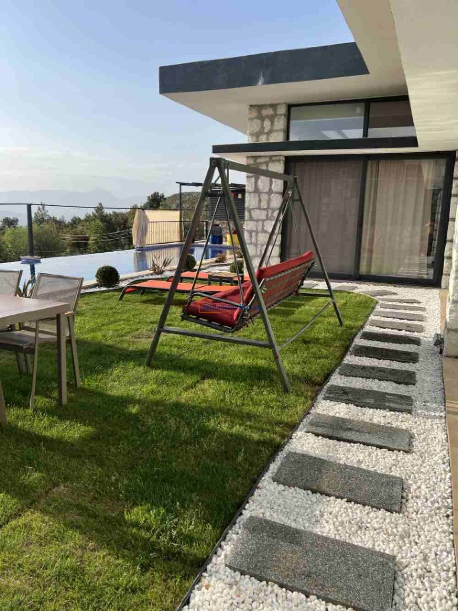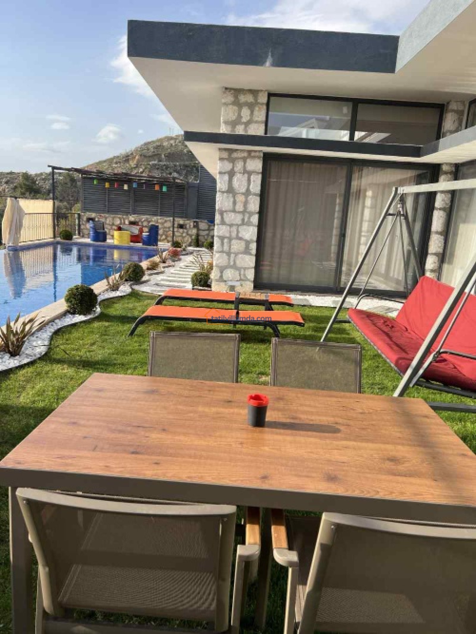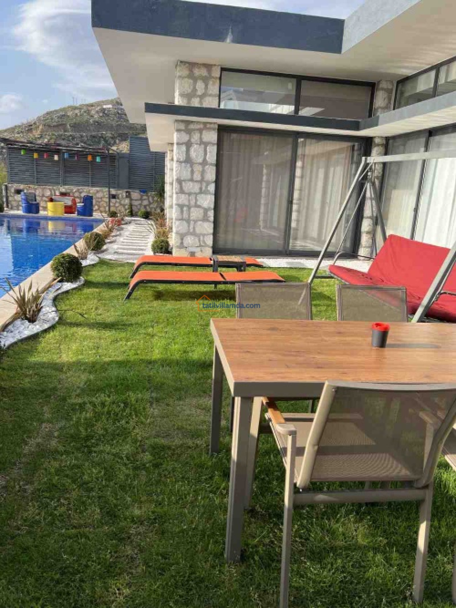 Villamız 1 yatak odalı olup, maksimum 2 kişilik konaklama kapasitesine sahiptir. Şık ve modern dizaynı ile konforlu bir yaşam alanı sunarken, tatilinizi unutulmaz kılacak detaylarla donatılmıştır. Açık çok geniş havuzun yanı sıra villa içerisinde kapalı ve ısıtmalı bir havuz da bulunmaktadır, böylece her mevsim keyifle yüzme imkânı sunar. Jakuzisi, konuklarına ekstra rahatlık ve keyifli anlar yaşatırken, havuz başındaki şezlonglar ve bahçe oturma grubu dinlenmeniz için ideal bir alan sunar.