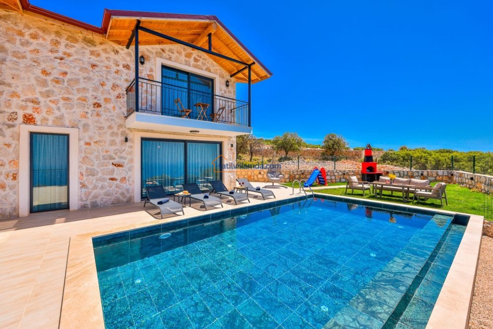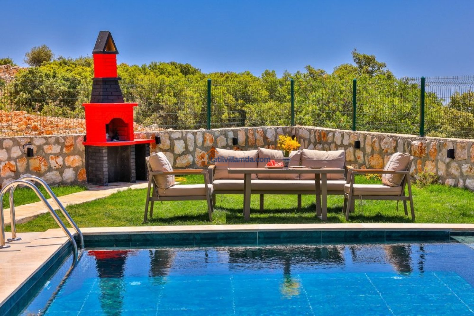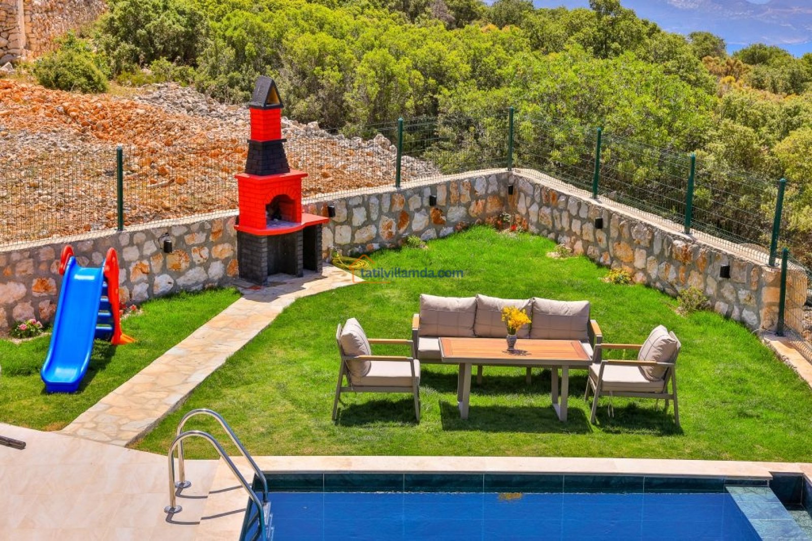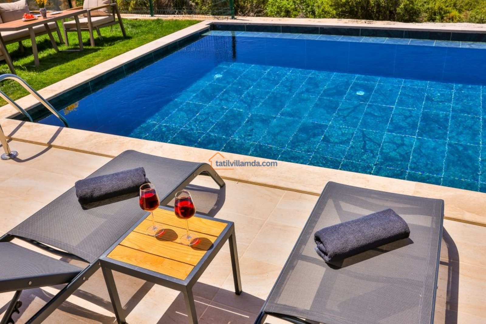 Villanın bahçesi, tatilinize keyif katacak birçok olanak sunar. Geniş havuz alanında bulunan şezlonglar, gün boyu güneşin tadını çıkarmanız için idealdir. Ayrıca, salıncak, barbekü alanı ve bahçe oturma grubu ile açık havada unutulmaz anlar yaşayabilirsiniz. Akşamları barbekü yaparken, gün batımının huzur verici atmosferinde sevdiklerinizle keyifli vakit geçirebilirsiniz.