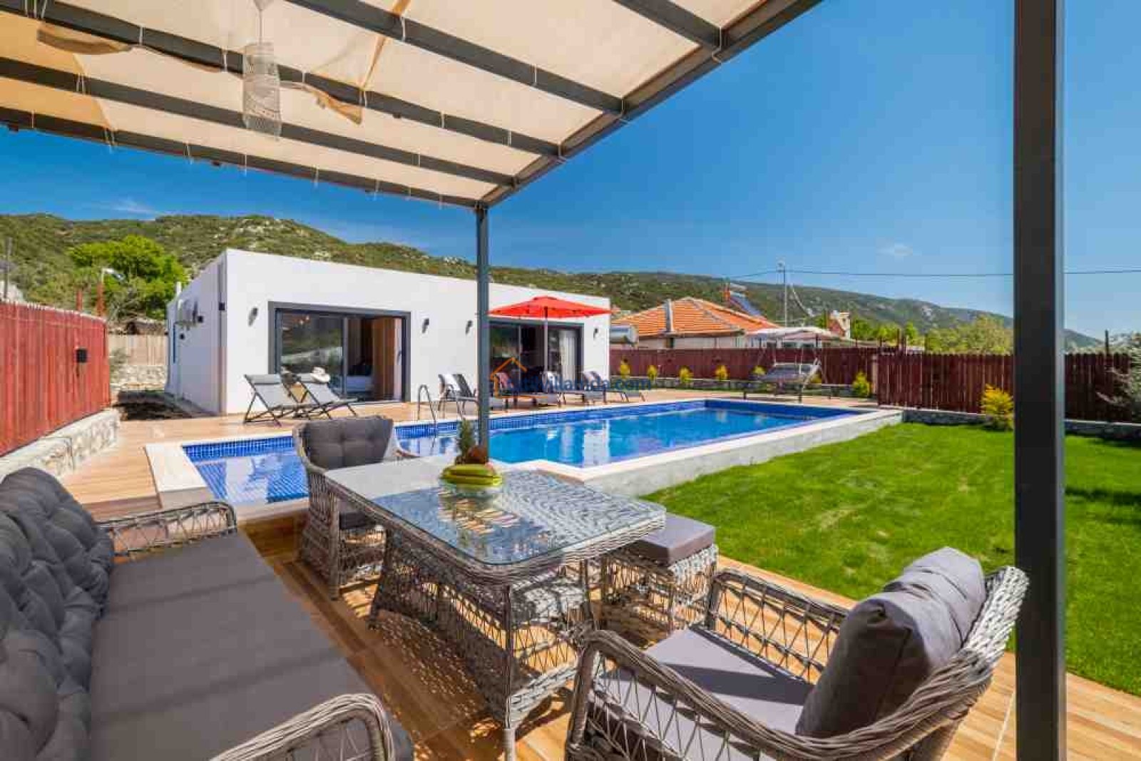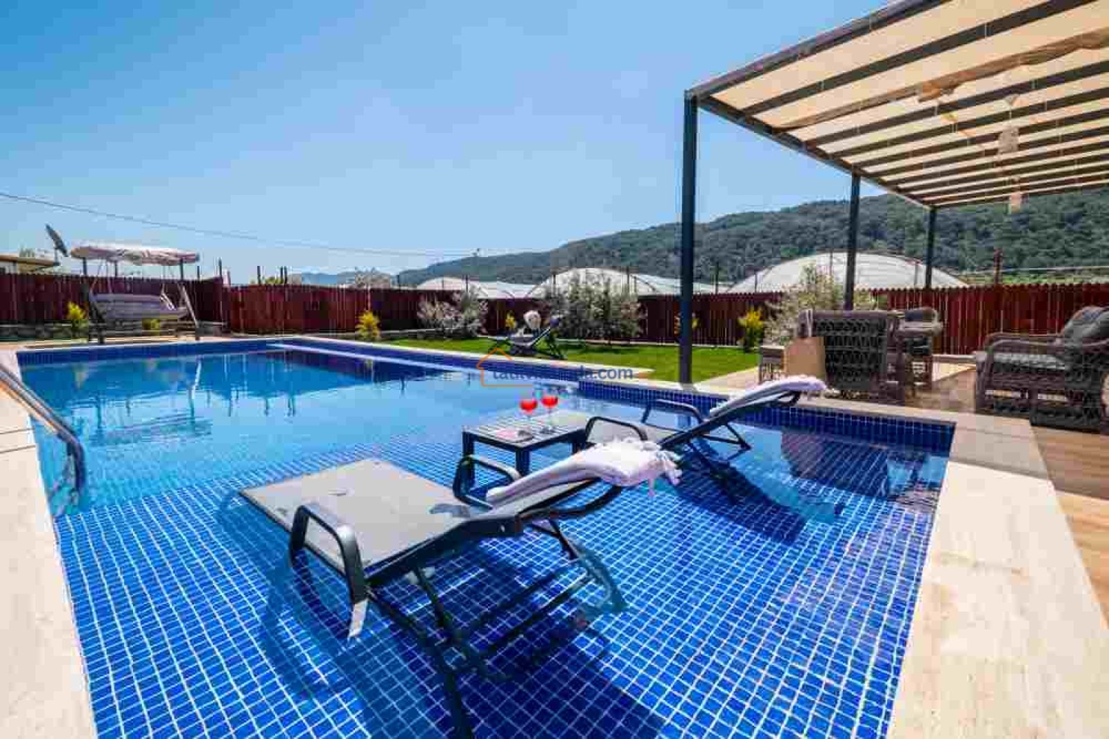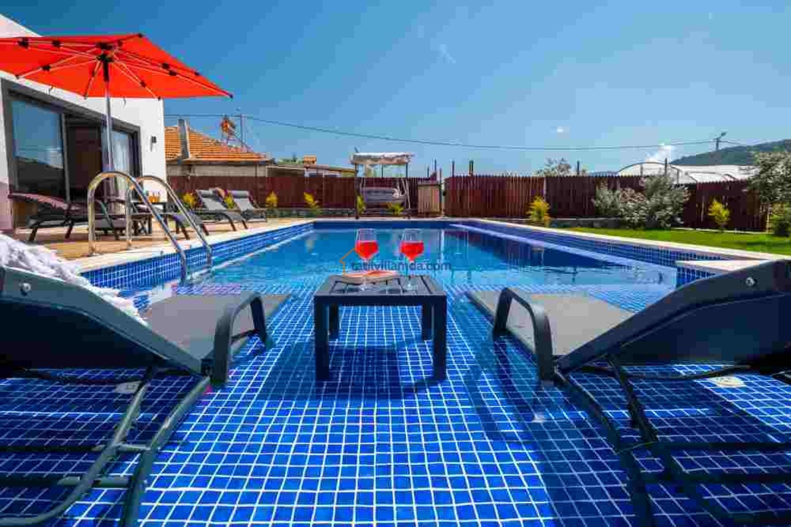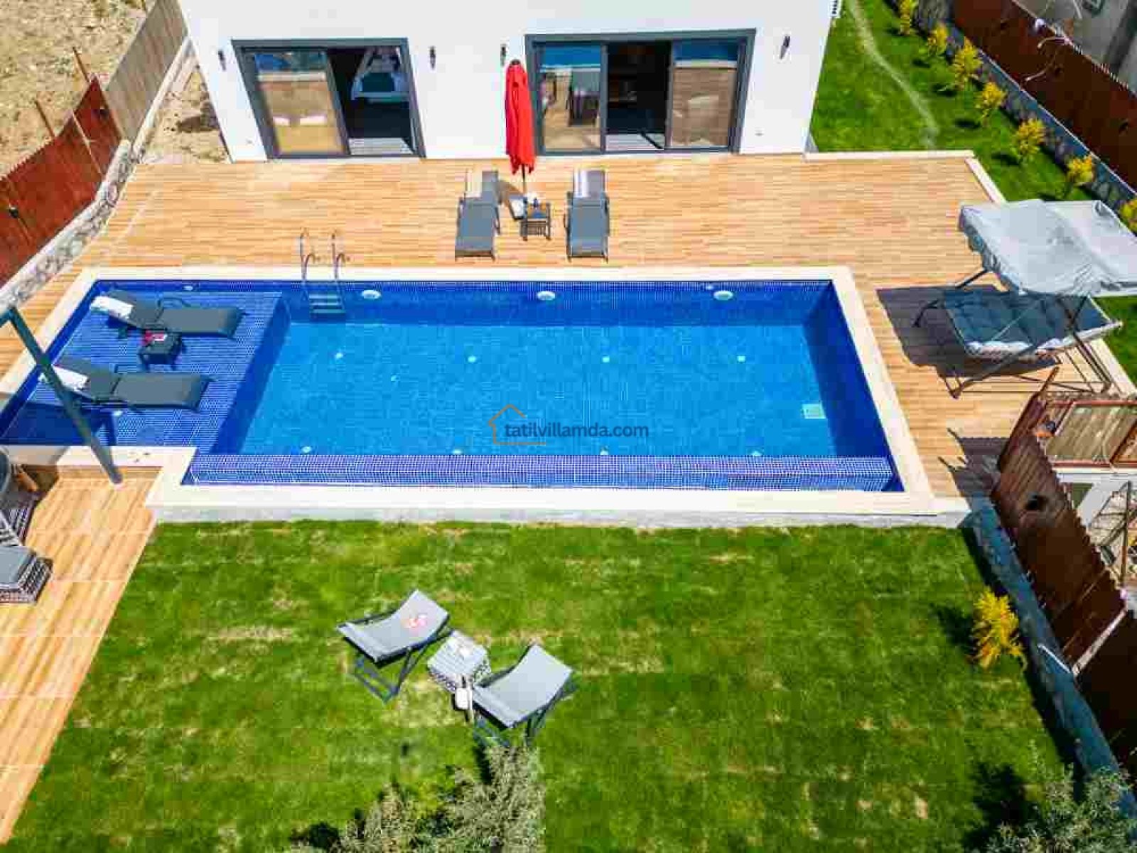 Villamız, geniş ve ferah bir bahçeye sahiptir. Büyük yüzme havuzunun hemen yanında şezlonglar, şemsiyeler, salıncak ve konforlu bir bahçe oturma grubu bulunur. Gün boyu güneşlenip, akşamları havuz başında keyifli sohbetler edebilirsiniz.