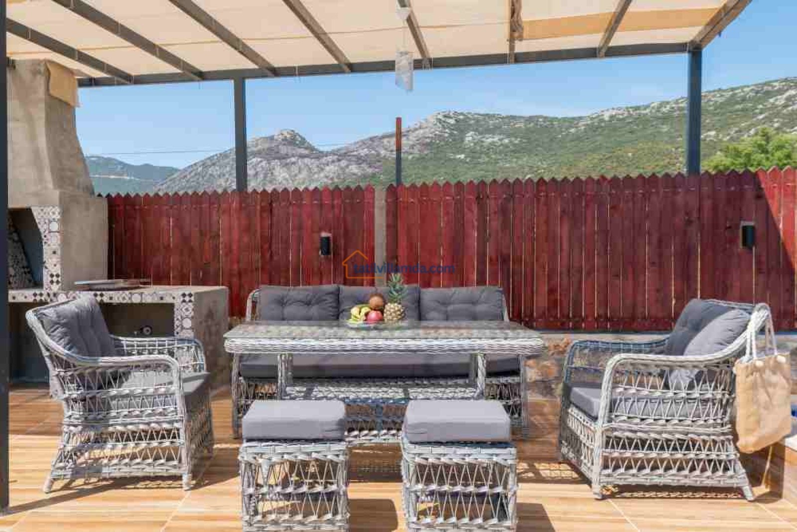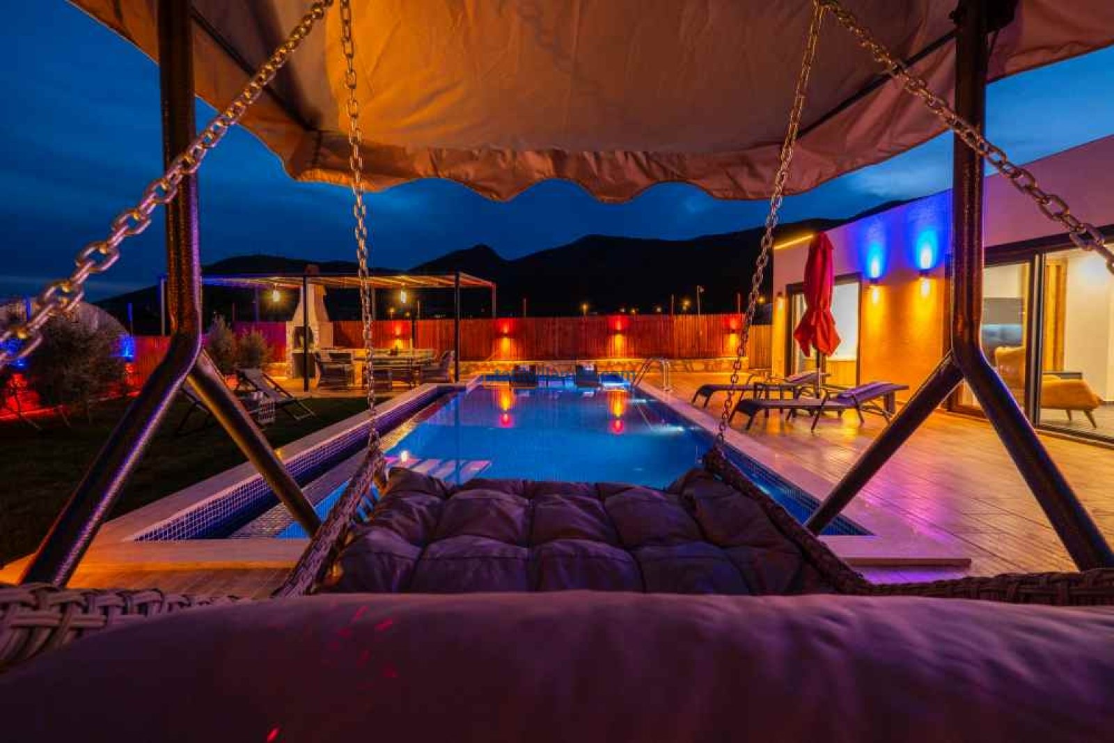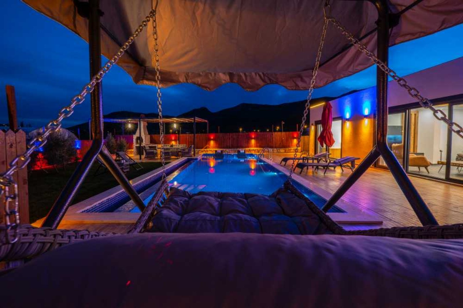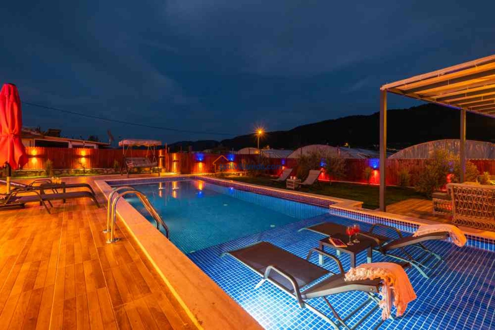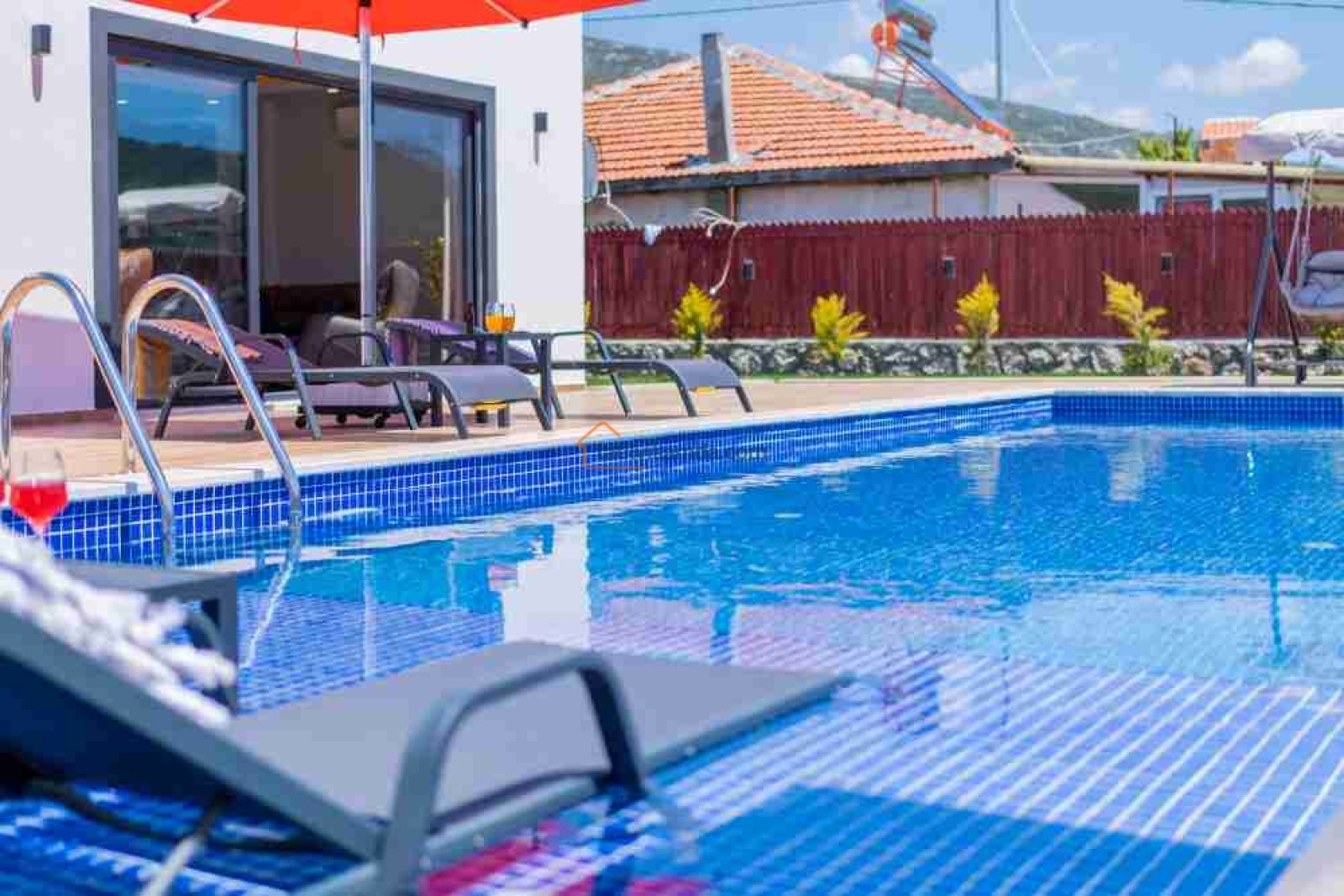 Villamız, geniş ve ferah bir bahçeye sahiptir. Büyük yüzme havuzunun hemen yanında şezlonglar, şemsiyeler, salıncak ve konforlu bir bahçe oturma grubu bulunur. Gün boyu güneşlenip, akşamları havuz başında keyifli sohbetler edebilirsiniz.