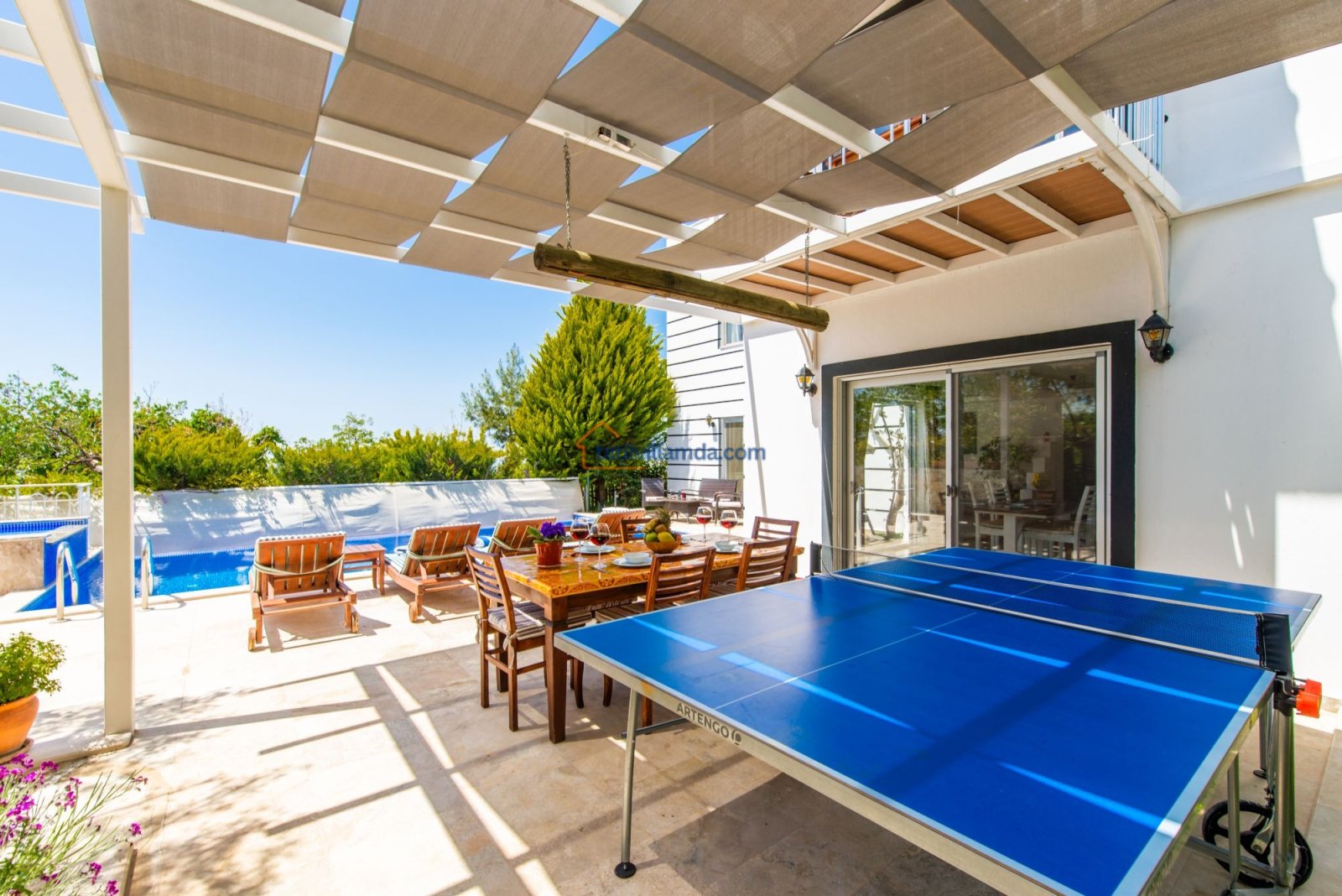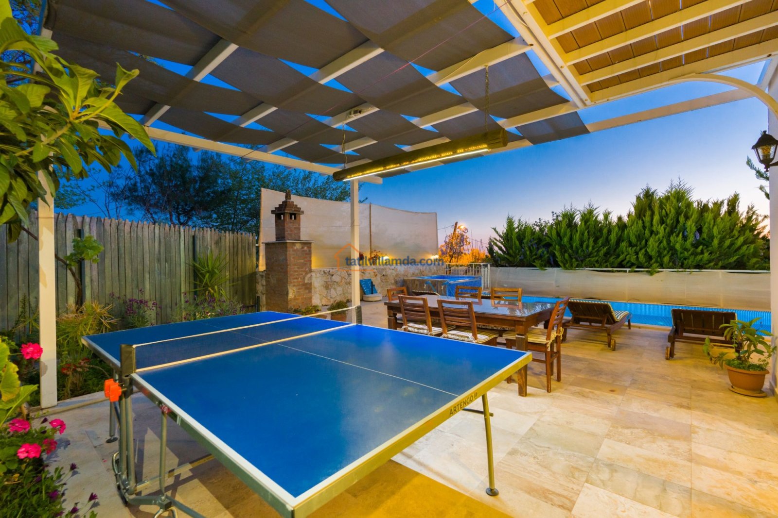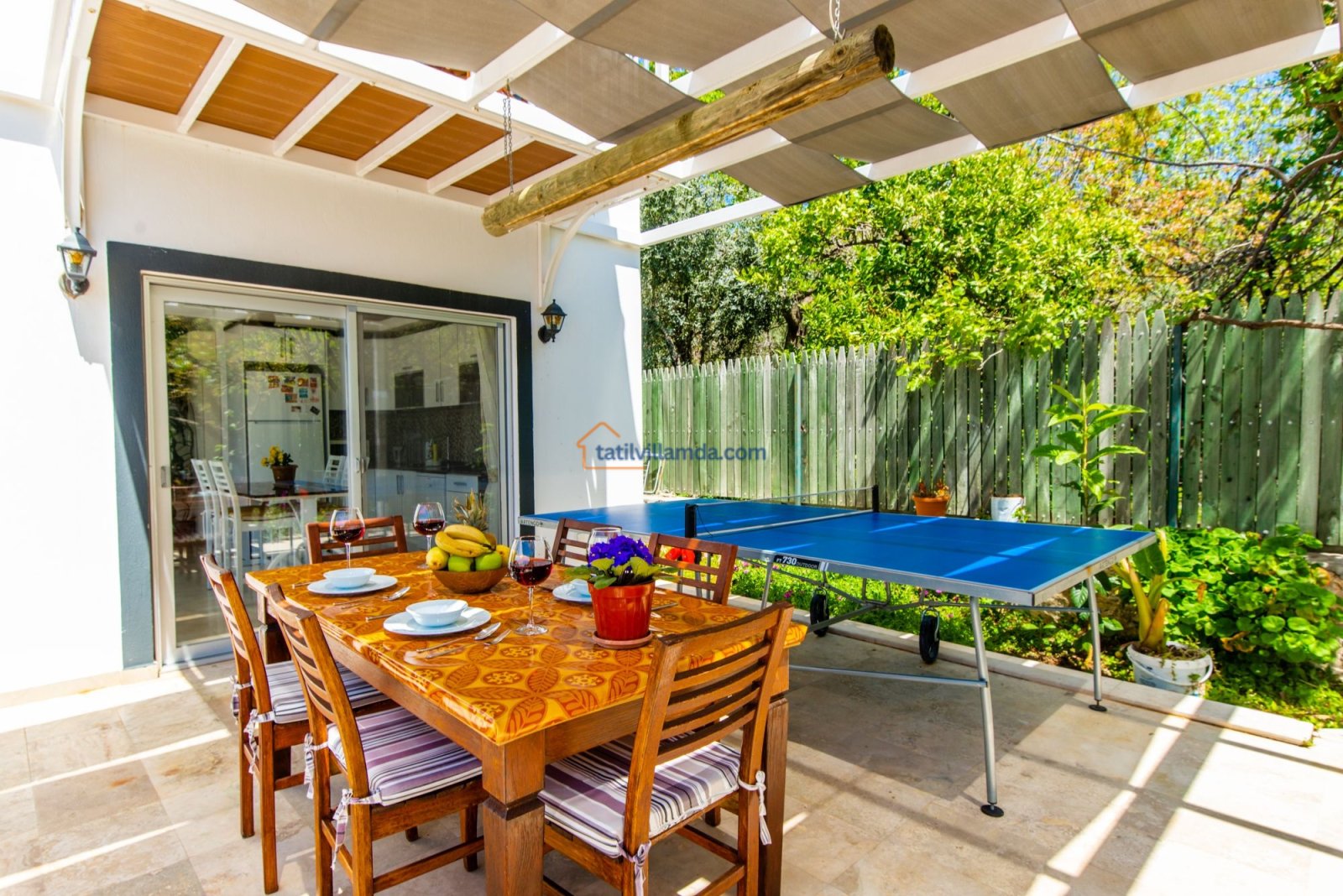 Villa Buğra'nın bahçe alanında bulunan masa tenisi, ailece eğlenceli vakit geçirmeniz için hoş bir alternatif oluşturur. Tam donanımlı mutfak, modern oturma alanı ve klimalı odalar ile tüm ihtiyaçlarınıza uygun şekilde tasarlanan villamız, hem balayı çiftleri hem de çekirdek aileler için mükemmel bir seçenektir.