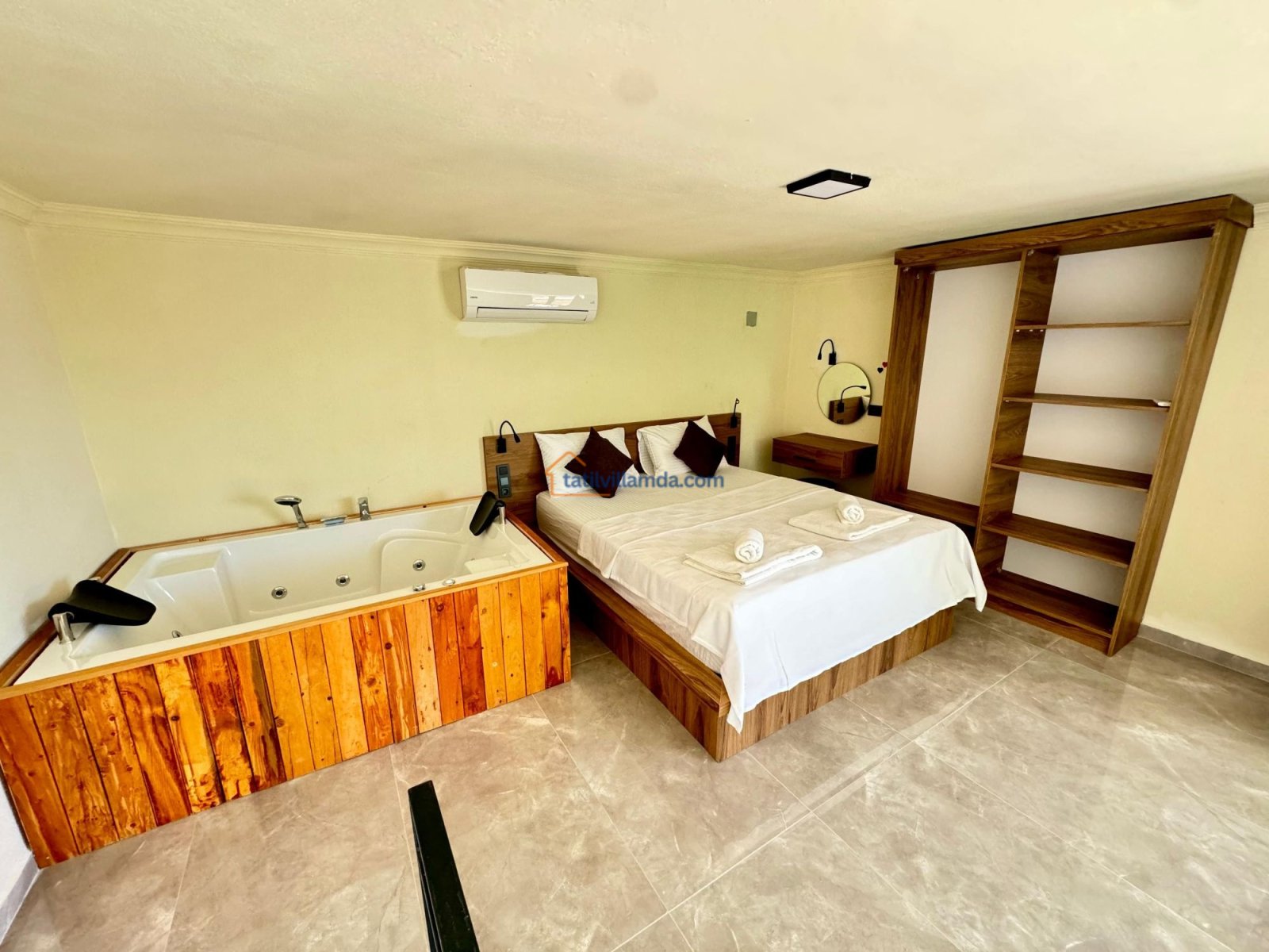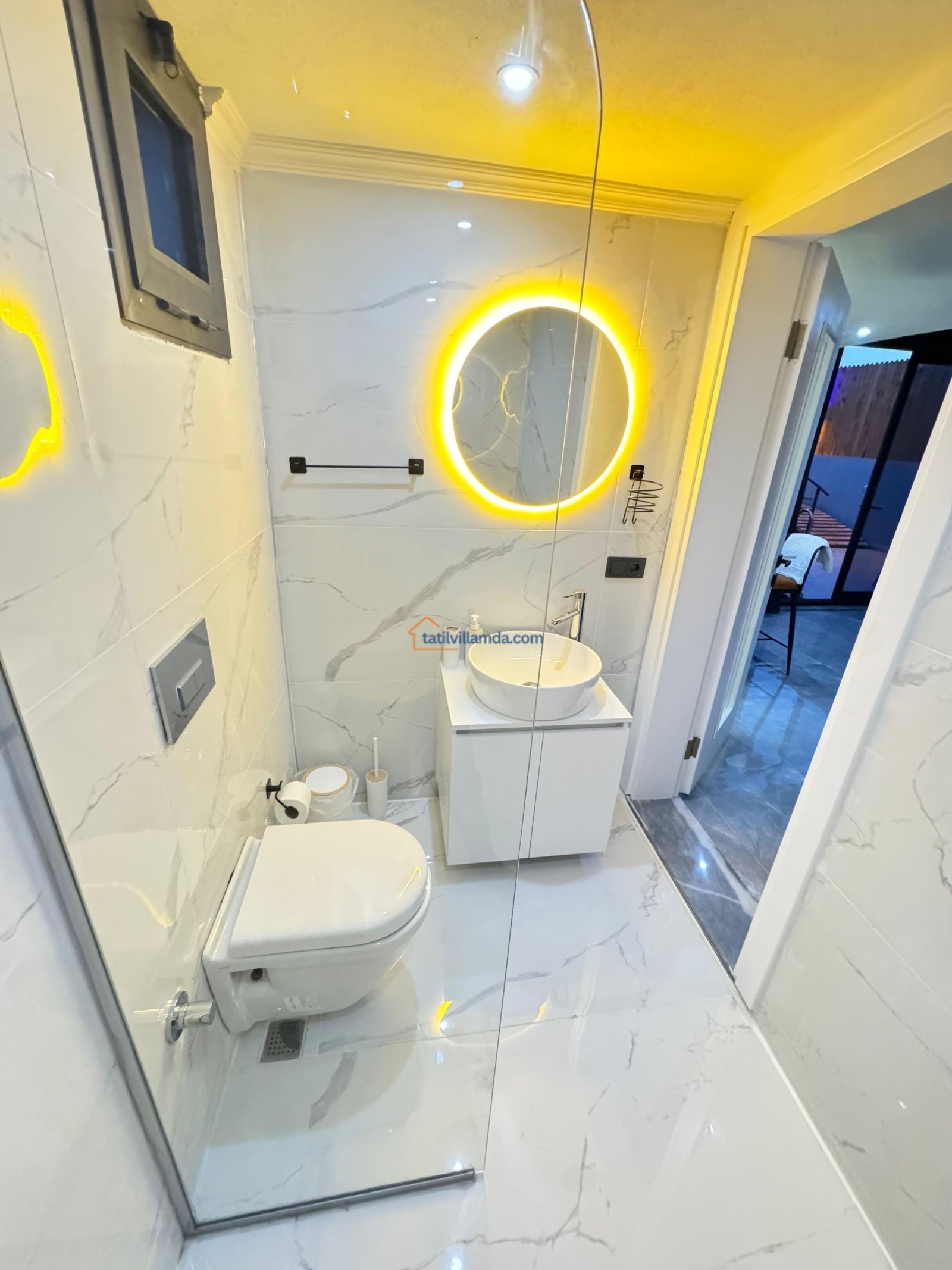 Villanın iç alanları modern detaylarla dizayn edilmiş olup, ferah ve kullanışlı bir yapıya sahiptir. Yatak odasında bulunan jakuzi, tatil süresince keyifli ve dinlendirici anlar yaşamanıza olanak tanır. Günün yorgunluğunu atabileceğiniz bu özel alan, tatilinize konfor katar.
