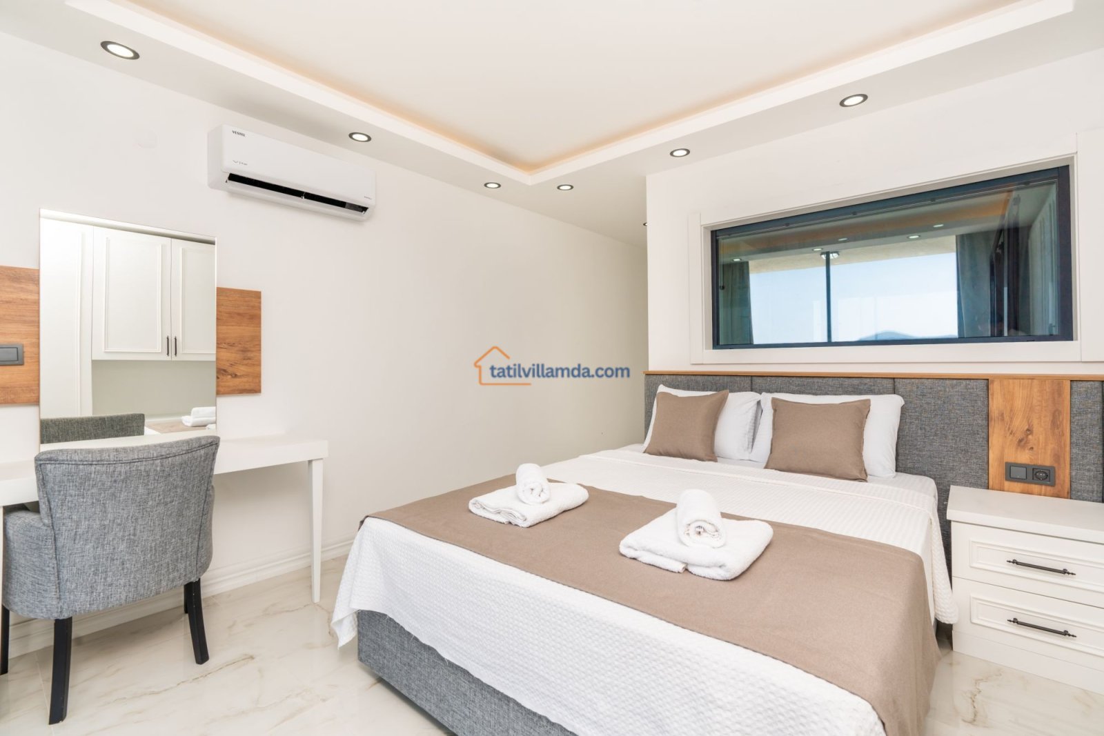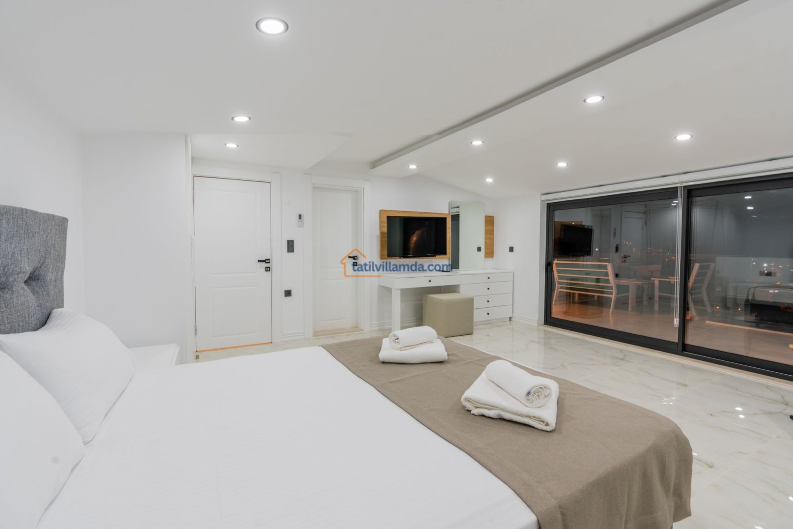 Her biri özenle tasarlanan yatak odalarında konforlu yataklar, klima, geniş dolaplar ve balkonlar yer alırken, çatı katındaki özel açık jakuzi misafirlere benzersiz bir keyif alanı sunar. Sabahın ilk ışıklarıyla birlikte deniz manzarasına karşı jakuzi keyfi, tatilin en unutulmaz anları arasında yerini alır.