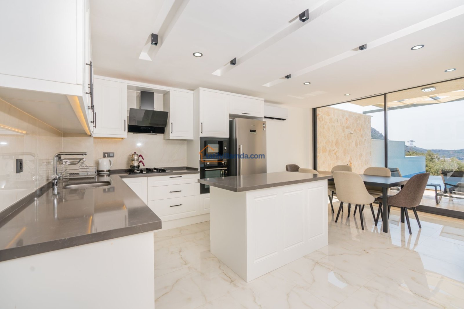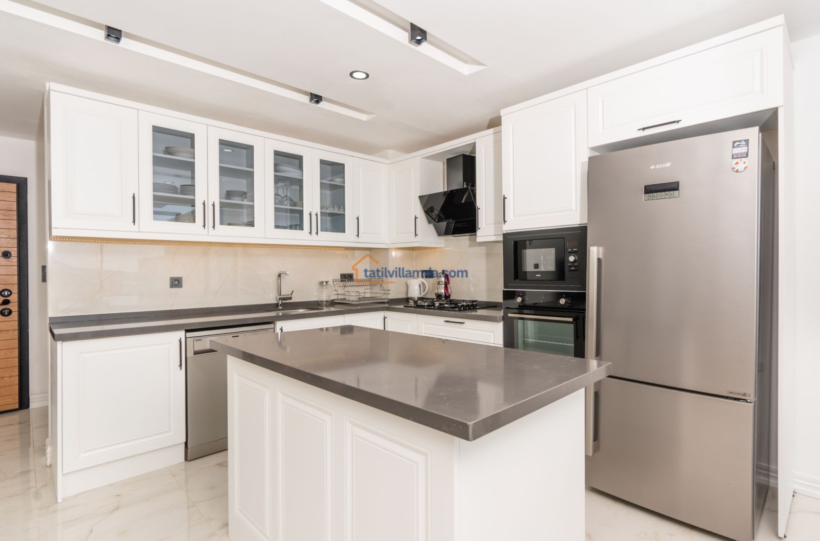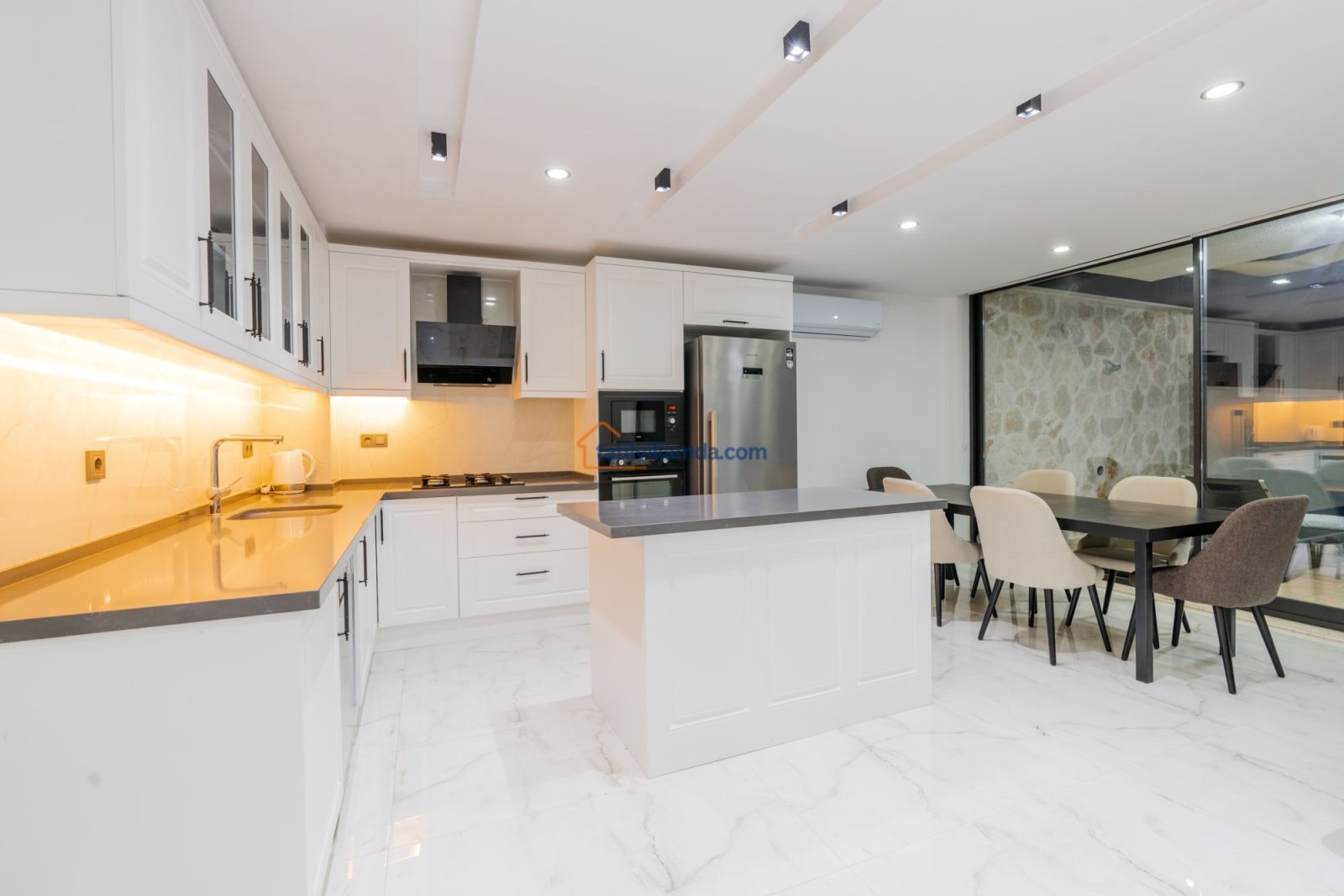 Tam donanımlı Amerikan mutfağı; ankastre ekipmanlar, geniş yemek alanı, tüm mutfak gereçleri ve modern tasarımıyla ev konforunu fazlasıyla sağlar. Salon bölümünde bulunan şık oturma grubu, TV, klima ve havuz terası çıkışı villanın kullanımını son derece pratik hâle getirir.