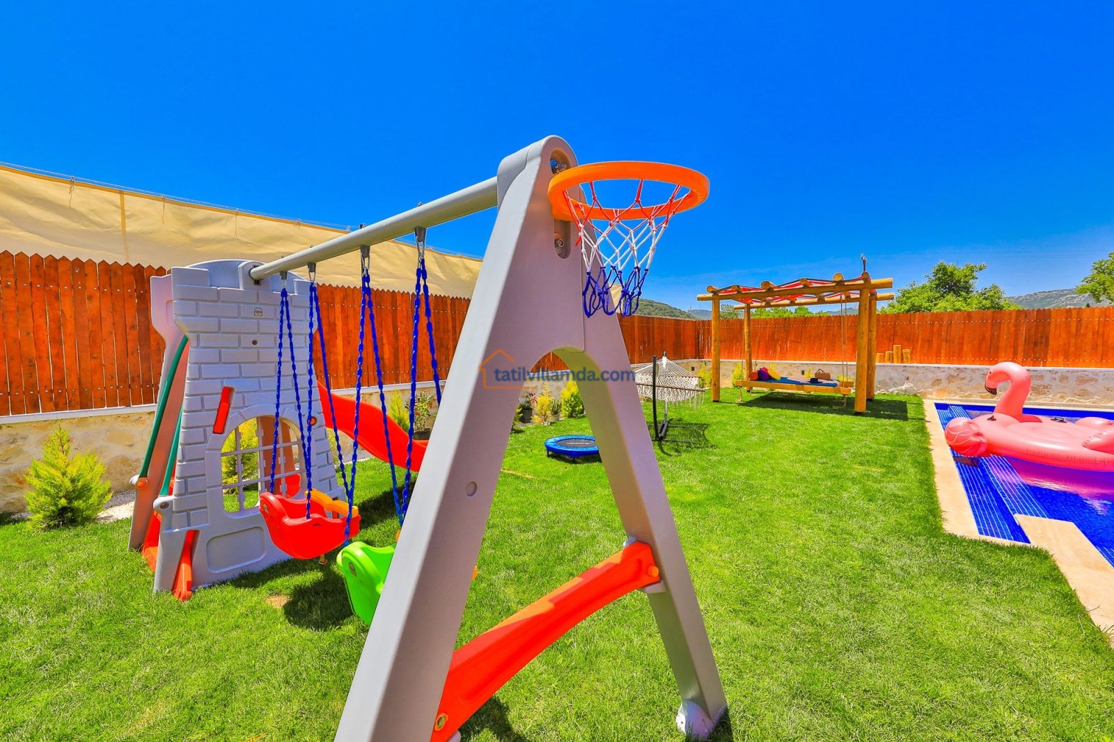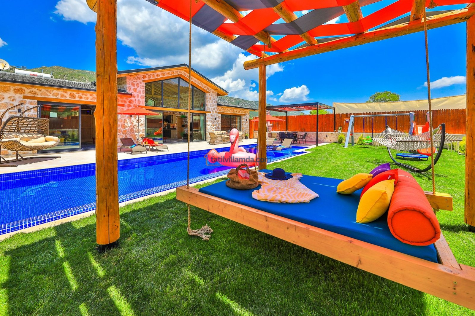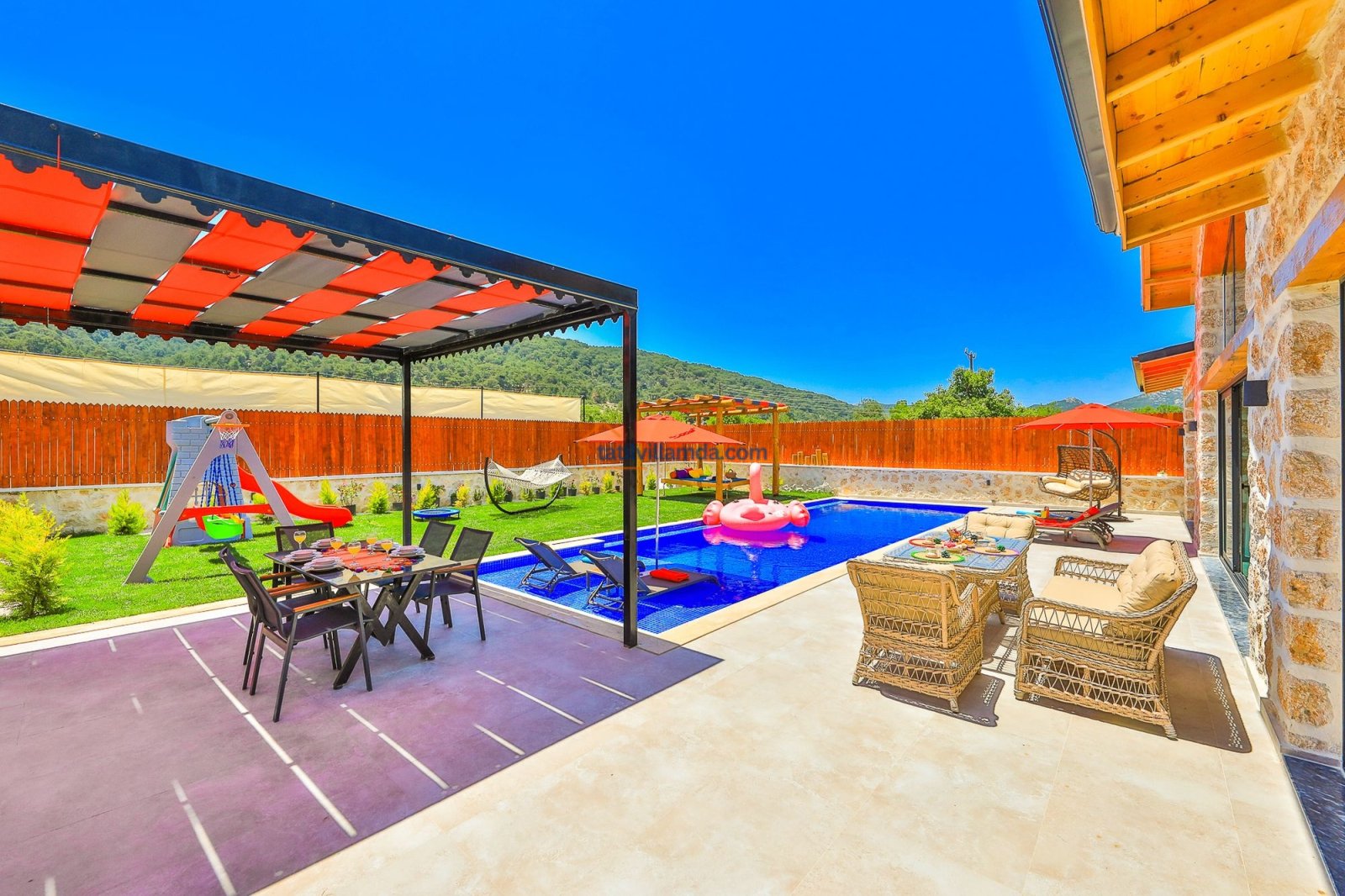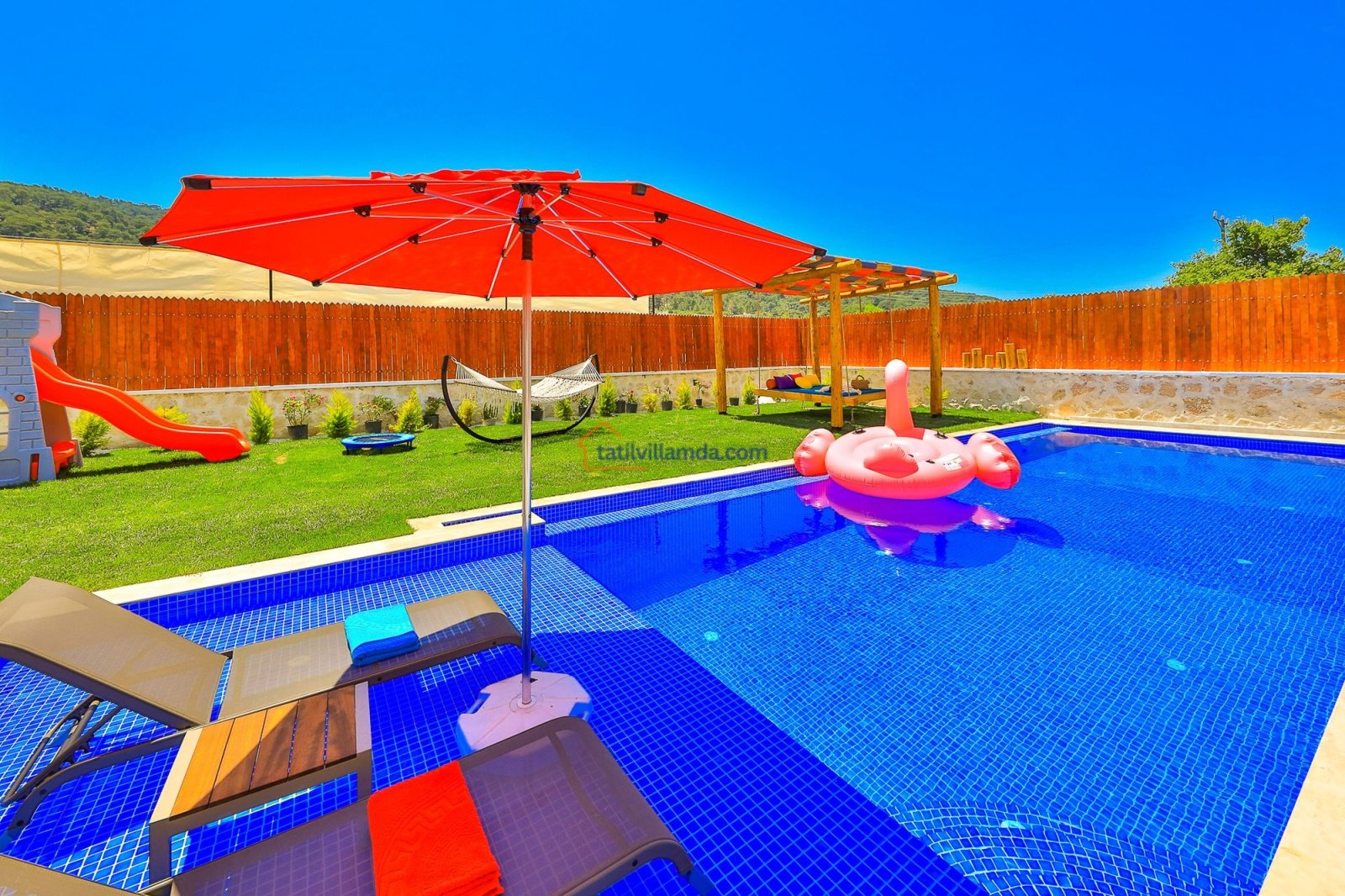 Geniş havuz terasında güneşin tadını çıkarabileceğiniz şezlonglar, serin gölgeler sunan şemsiyeler, keyifli anlar için salıncak, rahat bahçe oturma grubu, yemek keyfi için masa takımı ve barbekü alanı bulunmaktadır. Hamak ve yataklı salıncak, özellikle dinlenmek, kitap okumak ve gün batımını izlemek isteyenler için huzurlu bir köşe sunar. Çocuklu aileler için düşünülmüş trambolin ve çocuk oyun alanında salıncak ile kaydırak yer almakta, böylece minik misafirler güvenle eğlenebilmektedir. Doğa manzarası, sessiz konumu ve şık iç tasarımıyla Villa Düşler Bahçesi, hem balayı çiftlerine hem de sakin, keyifli bir tatil arayan ailelere unutulmaz bir konaklama deneyimi vadeder.