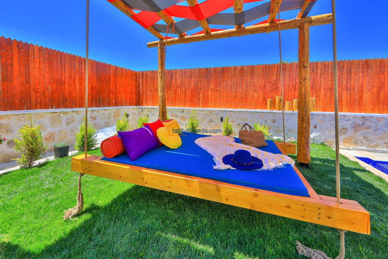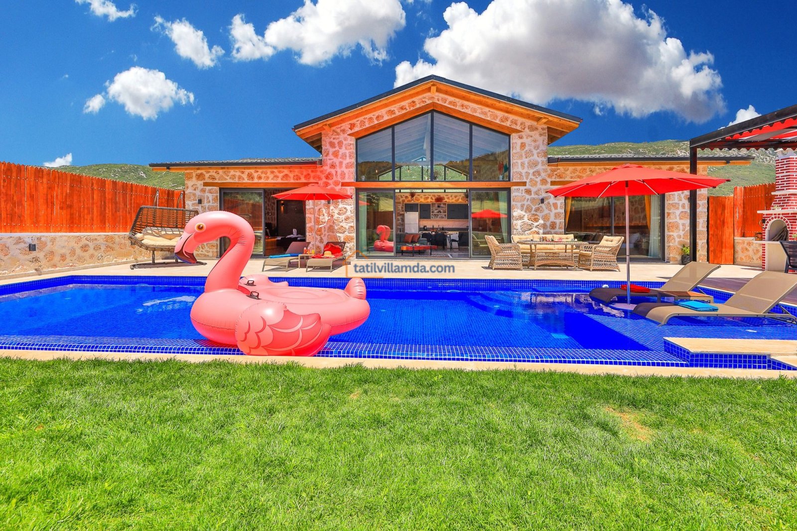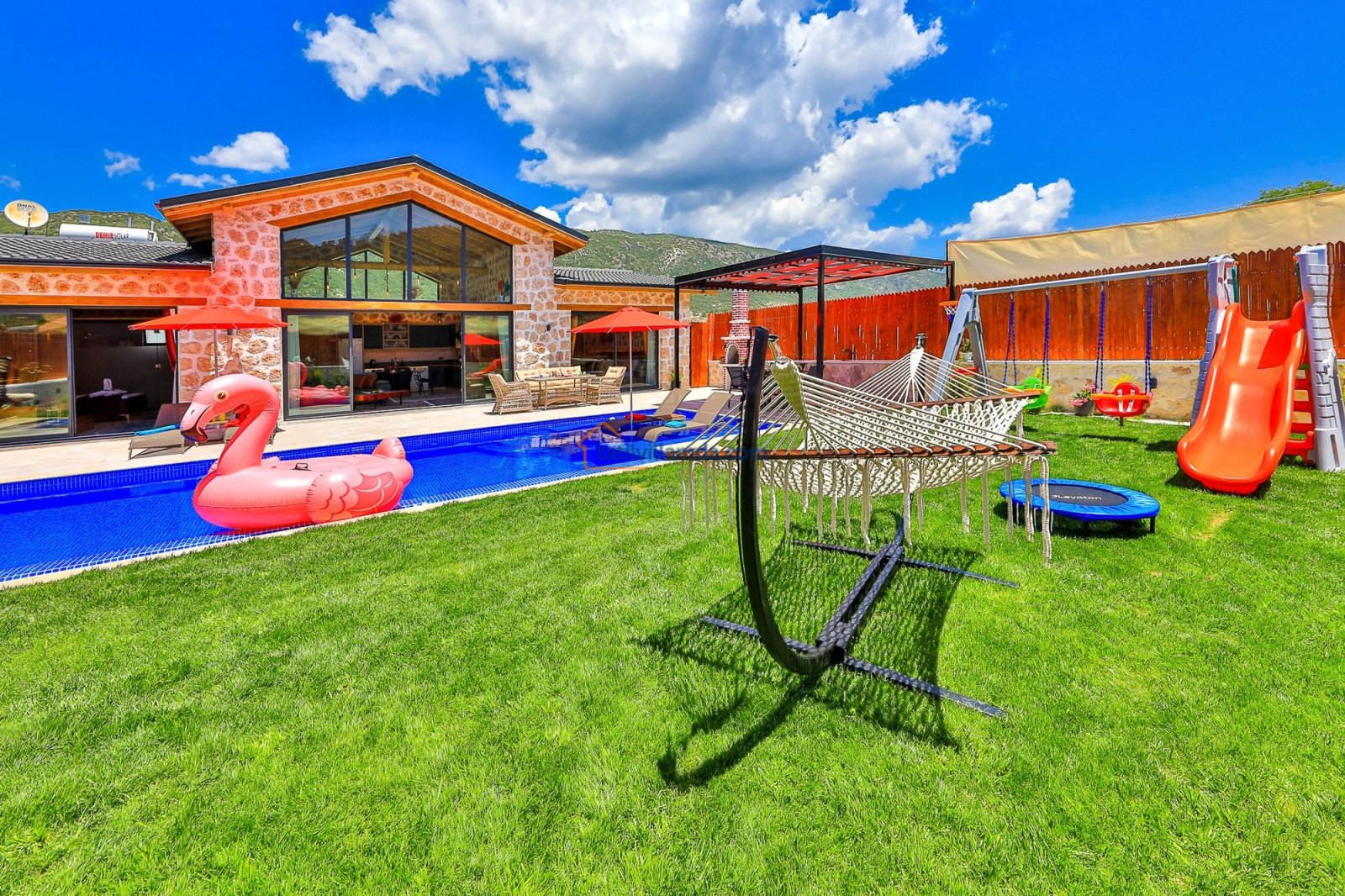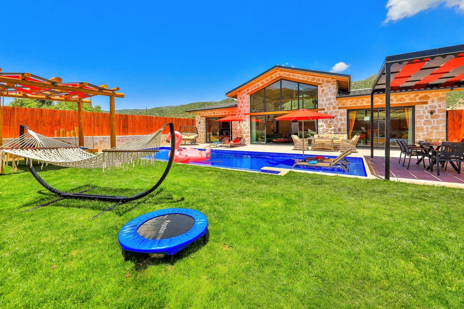 Geniş havuz terasında güneşin tadını çıkarabileceğiniz şezlonglar, serin gölgeler sunan şemsiyeler, keyifli anlar için salıncak, rahat bahçe oturma grubu, yemek keyfi için masa takımı ve barbekü alanı bulunmaktadır. Hamak ve yataklı salıncak, özellikle dinlenmek, kitap okumak ve gün batımını izlemek isteyenler için huzurlu bir köşe sunar. Çocuklu aileler için düşünülmüş trambolin ve çocuk oyun alanında salıncak ile kaydırak yer almakta, böylece minik misafirler güvenle eğlenebilmektedir. Doğa manzarası, sessiz konumu ve şık iç tasarımıyla Villa Düşler Bahçesi, hem balayı çiftlerine hem de sakin, keyifli bir tatil arayan ailelere unutulmaz bir konaklama deneyimi vadeder.