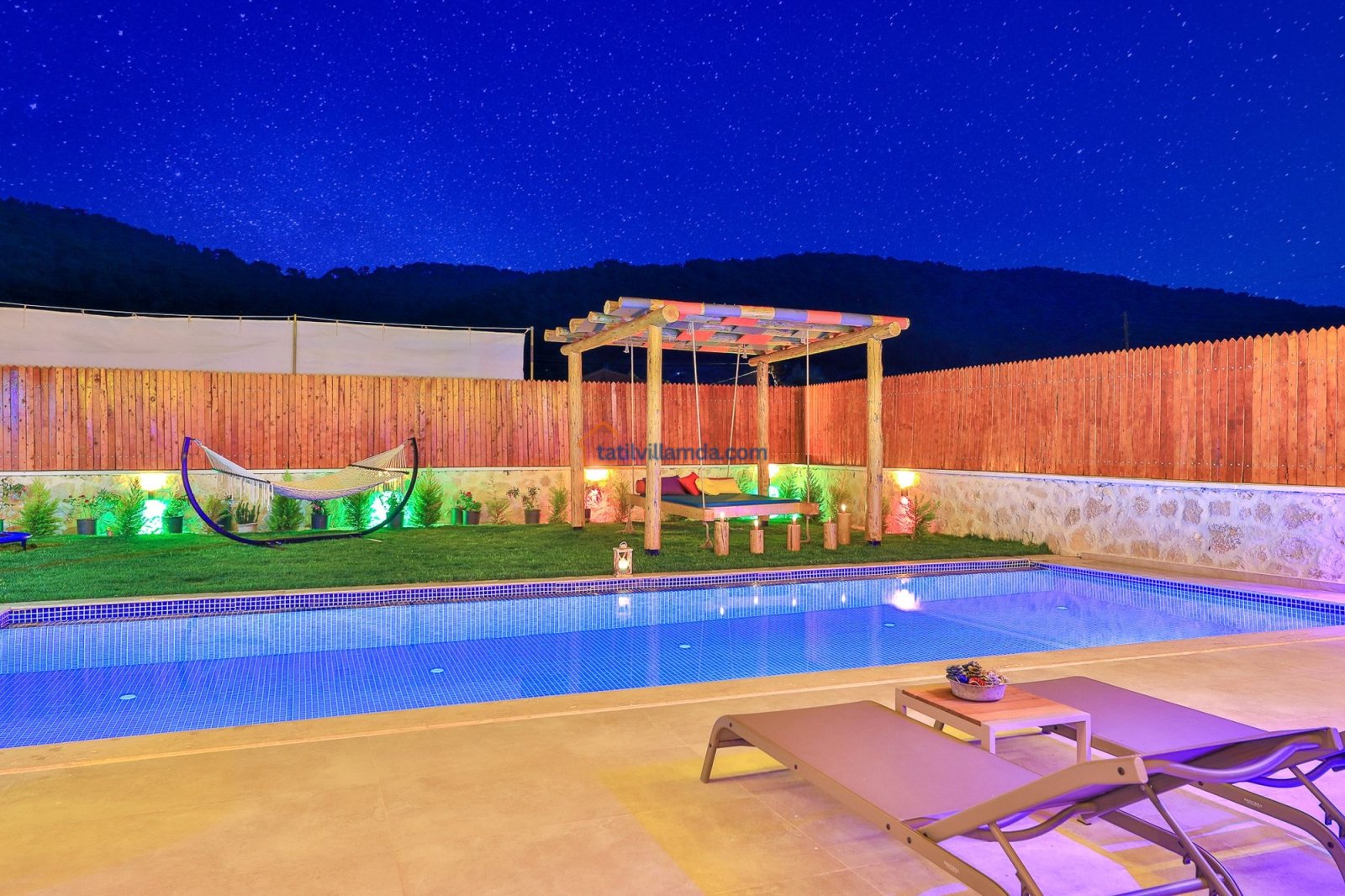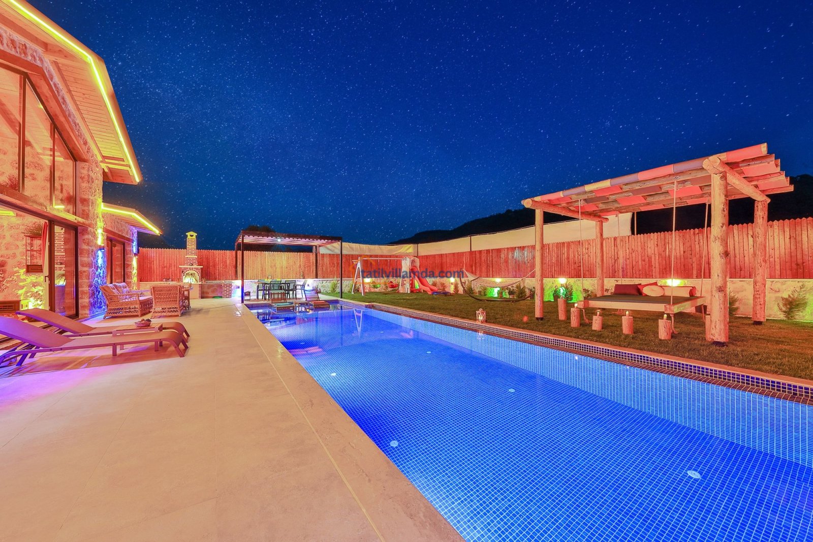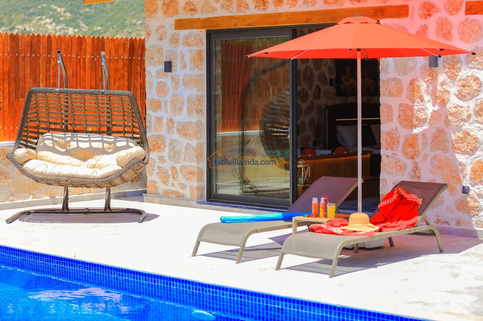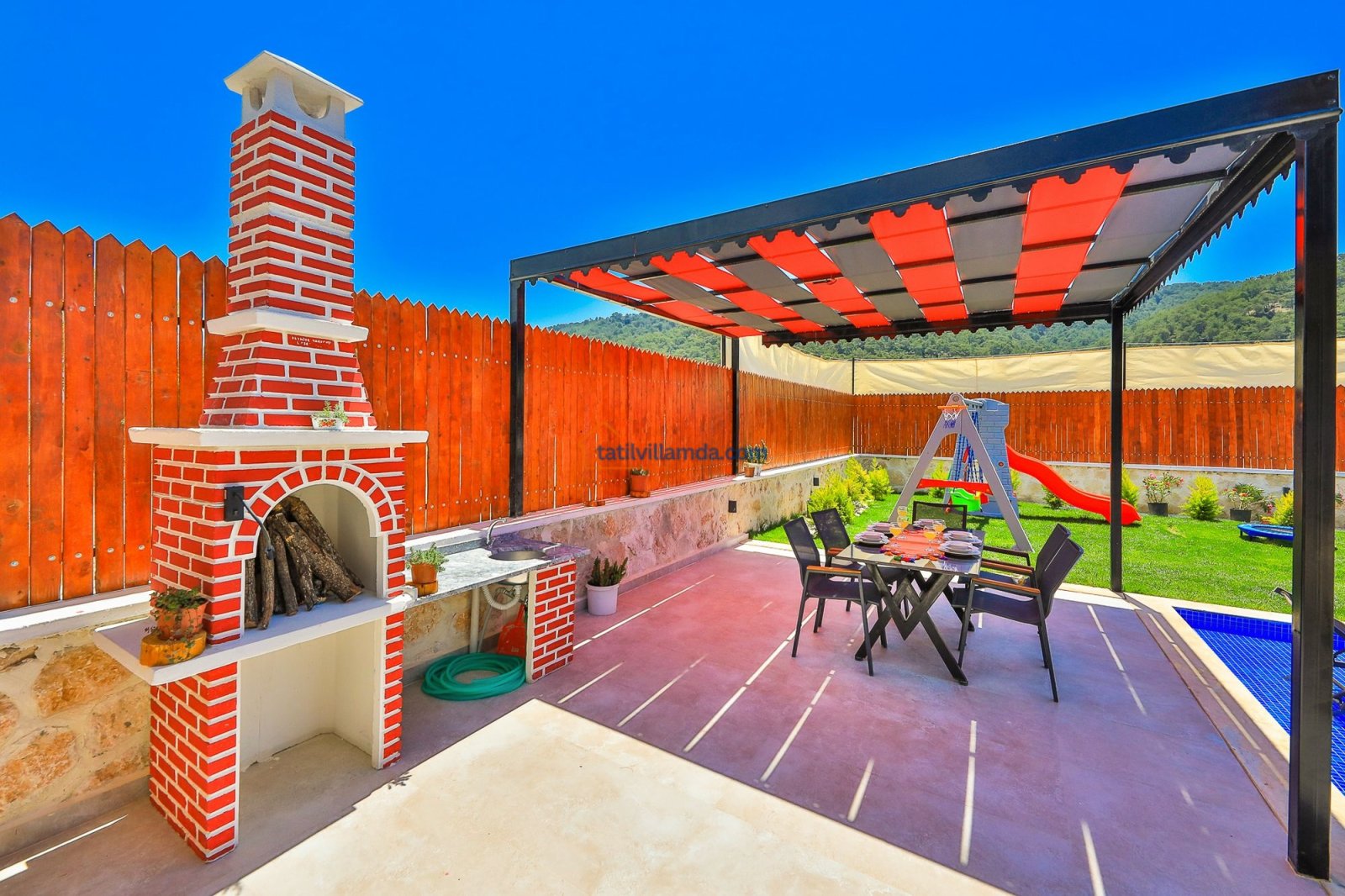 Geniş havuz terasında güneşin tadını çıkarabileceğiniz şezlonglar, serin gölgeler sunan şemsiyeler, keyifli anlar için salıncak, rahat bahçe oturma grubu, yemek keyfi için masa takımı ve barbekü alanı bulunmaktadır. Hamak ve yataklı salıncak, özellikle dinlenmek, kitap okumak ve gün batımını izlemek isteyenler için huzurlu bir köşe sunar. Çocuklu aileler için düşünülmüş trambolin ve çocuk oyun alanında salıncak ile kaydırak yer almakta, böylece minik misafirler güvenle eğlenebilmektedir. Doğa manzarası, sessiz konumu ve şık iç tasarımıyla Villa Düşler Bahçesi, hem balayı çiftlerine hem de sakin, keyifli bir tatil arayan ailelere unutulmaz bir konaklama deneyimi vadeder.