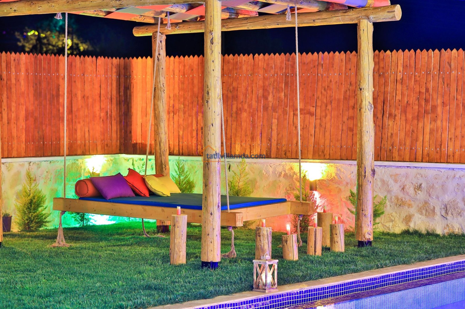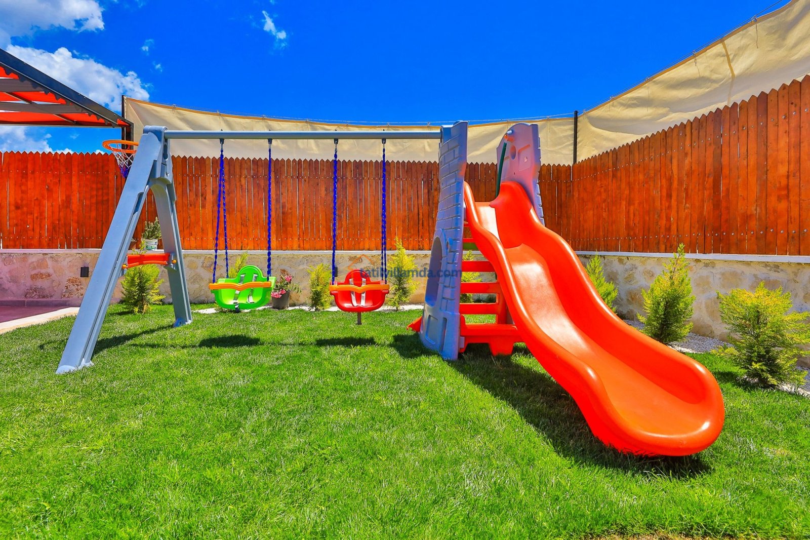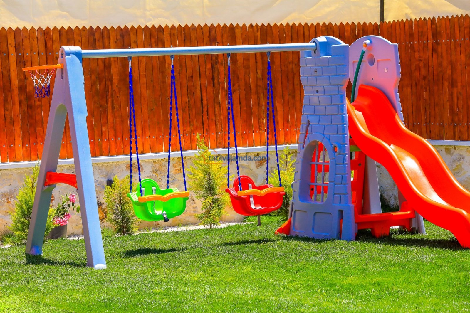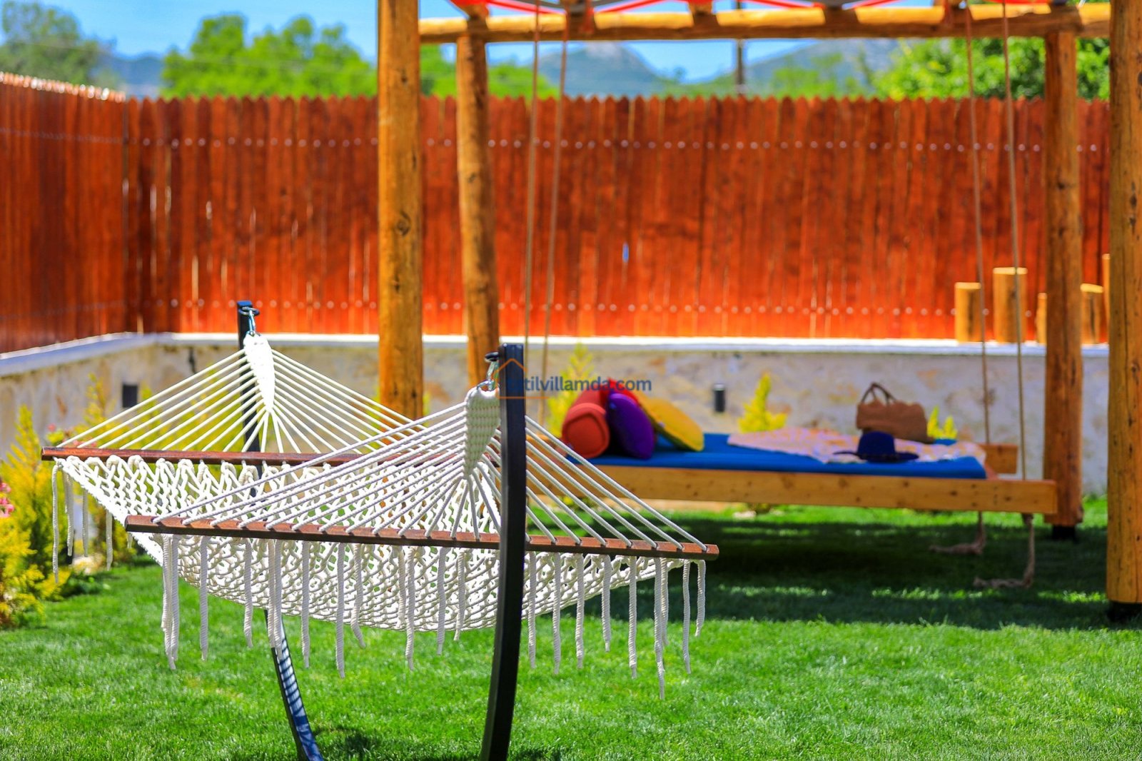 Geniş havuz terasında güneşin tadını çıkarabileceğiniz şezlonglar, serin gölgeler sunan şemsiyeler, keyifli anlar için salıncak, rahat bahçe oturma grubu, yemek keyfi için masa takımı ve barbekü alanı bulunmaktadır. Hamak ve yataklı salıncak, özellikle dinlenmek, kitap okumak ve gün batımını izlemek isteyenler için huzurlu bir köşe sunar. Çocuklu aileler için düşünülmüş trambolin ve çocuk oyun alanında salıncak ile kaydırak yer almakta, böylece minik misafirler güvenle eğlenebilmektedir. Doğa manzarası, sessiz konumu ve şık iç tasarımıyla Villa Düşler Bahçesi, hem balayı çiftlerine hem de sakin, keyifli bir tatil arayan ailelere unutulmaz bir konaklama deneyimi vadeder.