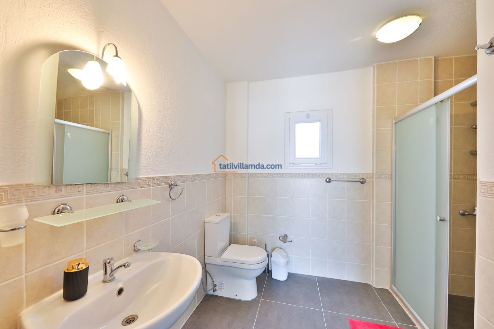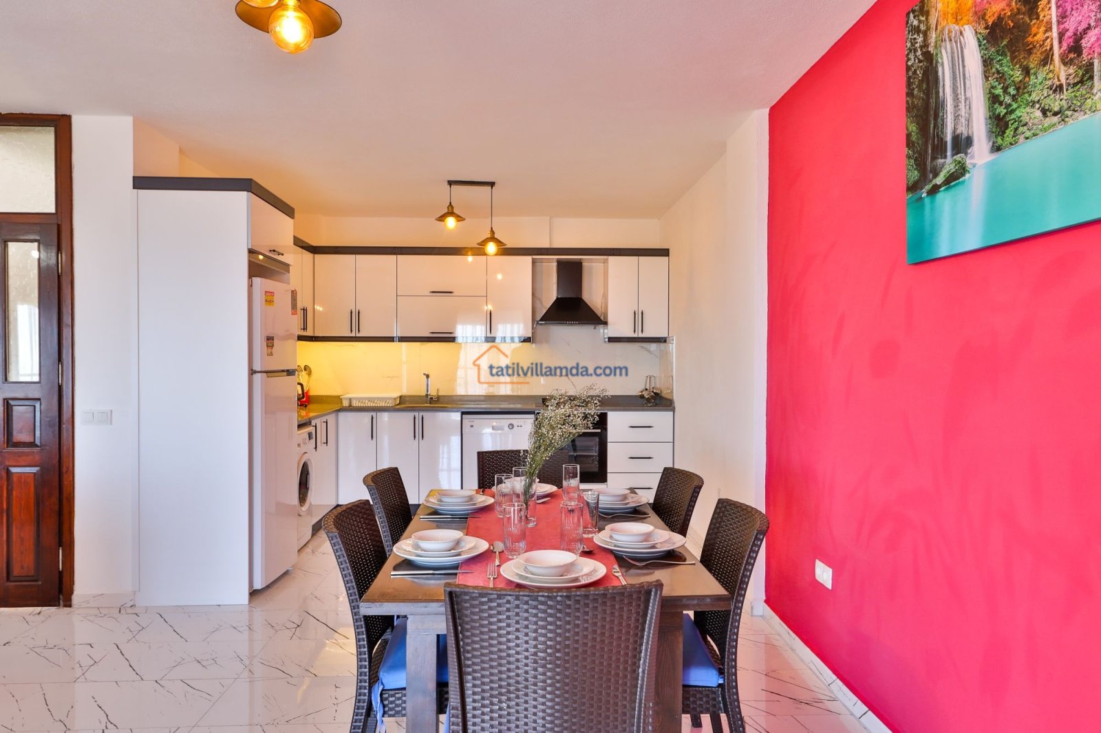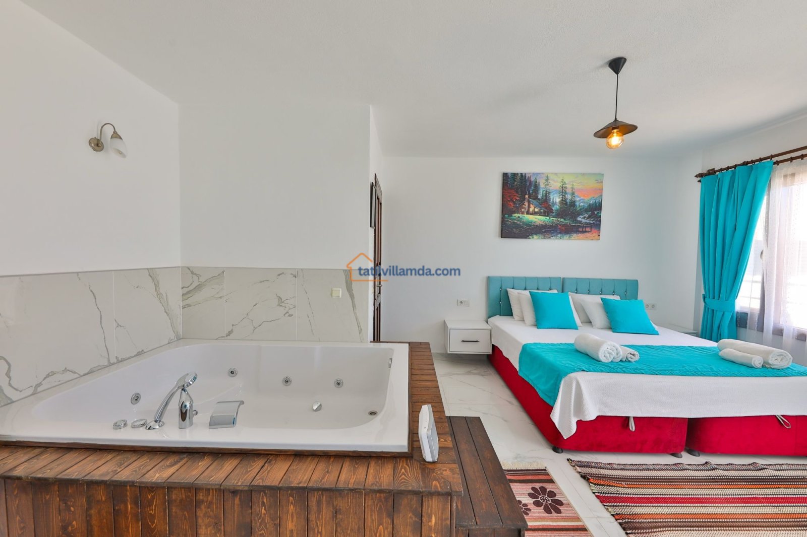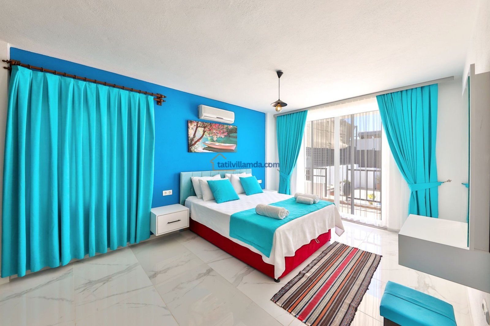 Havuz terasında yer alan şezlonglar, şemsiye ve masa takımı, gün boyu güneşin tadını çıkarmanız için ideal bir alan oluşturur. Akşam saatlerinde ise barbekü alanında sevdiklerinizle birlikte keyifli sofralar kurabilir, tatilinizi unutulmaz anılarla taçlandırabilirsiniz. Villanın teras katından görülen deniz manzarası, gün batımında eşsiz manzaralar eşliğinde huzurlu anlar yaşamanıza olanak tanır.