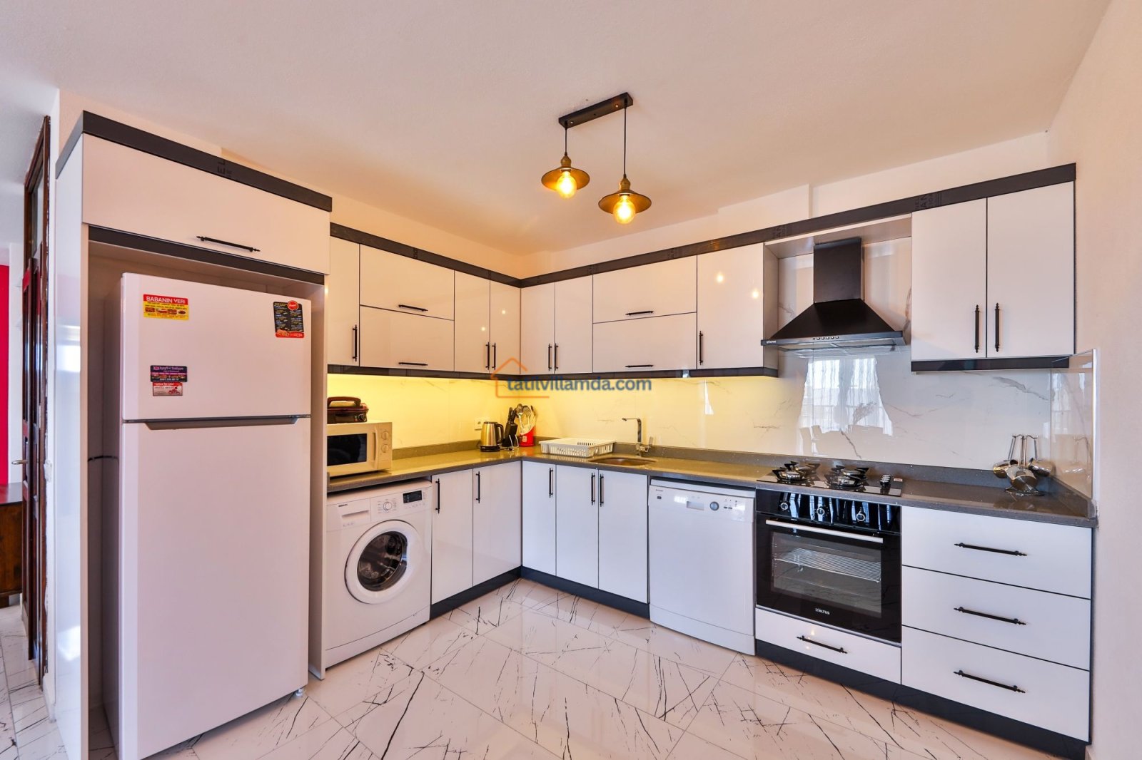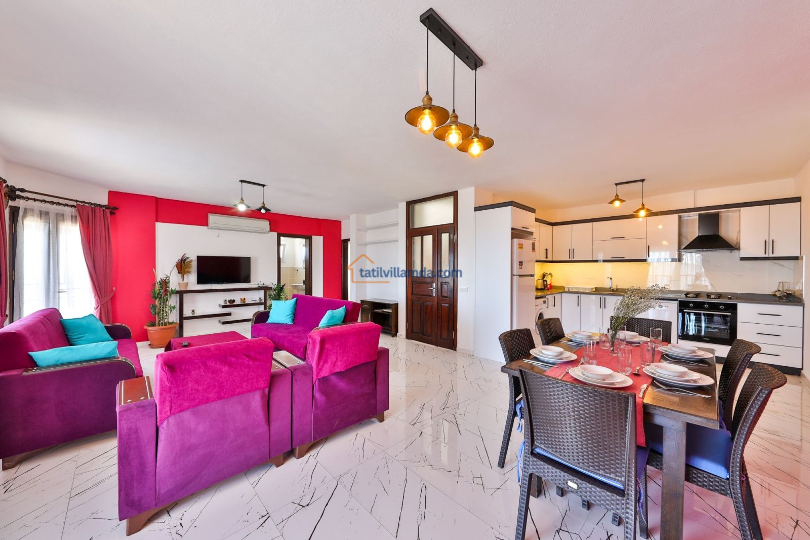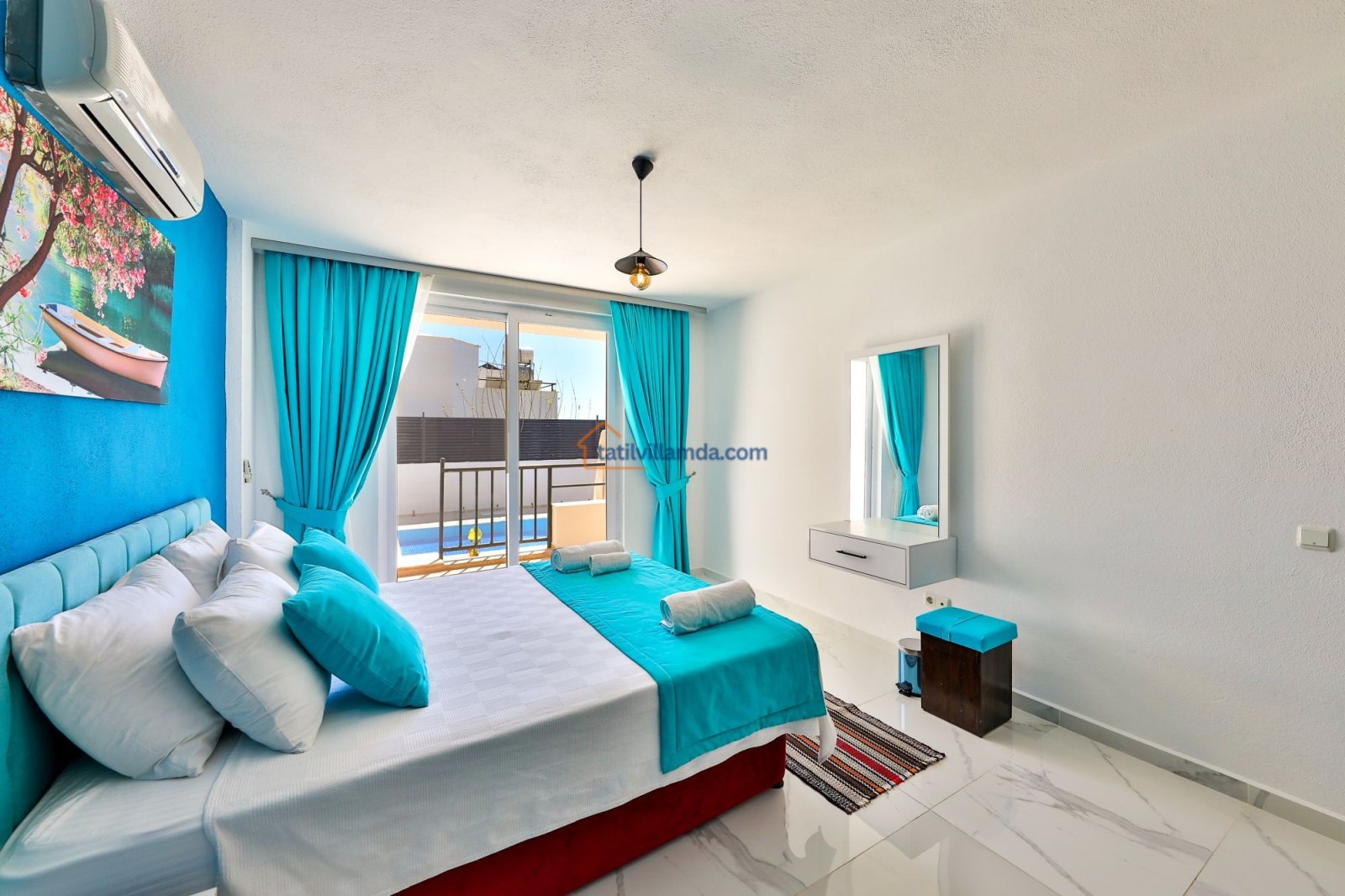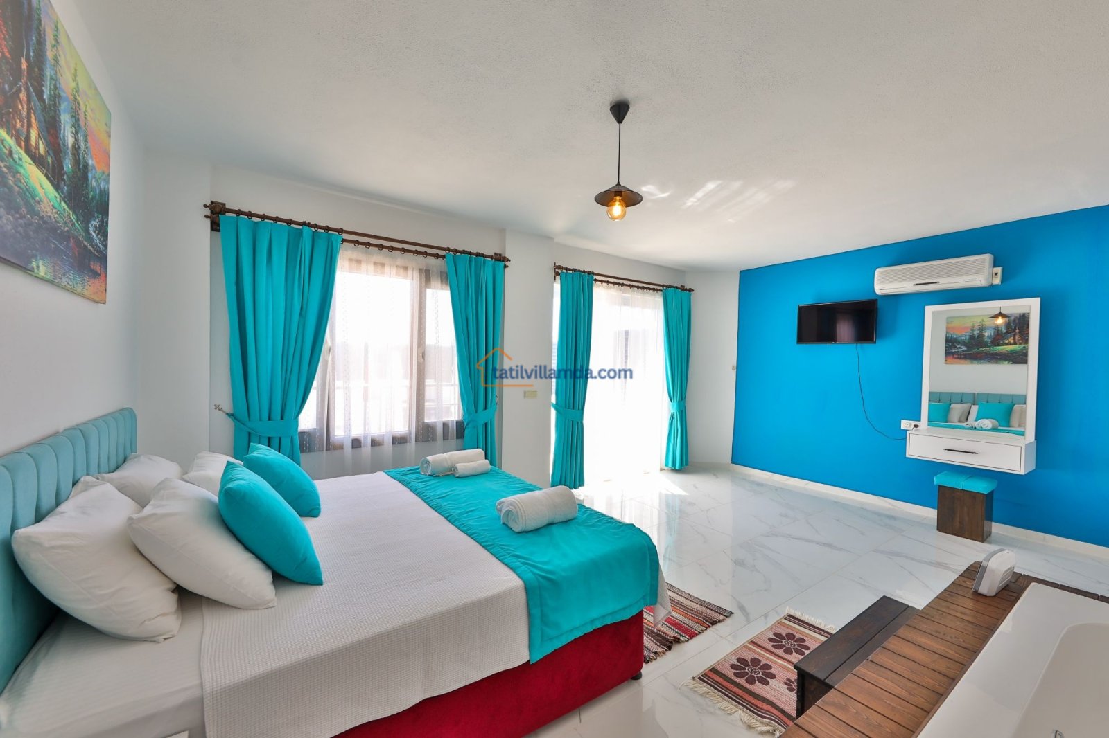 Havuz terasında yer alan şezlonglar, şemsiye ve masa takımı, gün boyu güneşin tadını çıkarmanız için ideal bir alan oluşturur. Akşam saatlerinde ise barbekü alanında sevdiklerinizle birlikte keyifli sofralar kurabilir, tatilinizi unutulmaz anılarla taçlandırabilirsiniz. Villanın teras katından görülen deniz manzarası, gün batımında eşsiz manzaralar eşliğinde huzurlu anlar yaşamanıza olanak tanır.