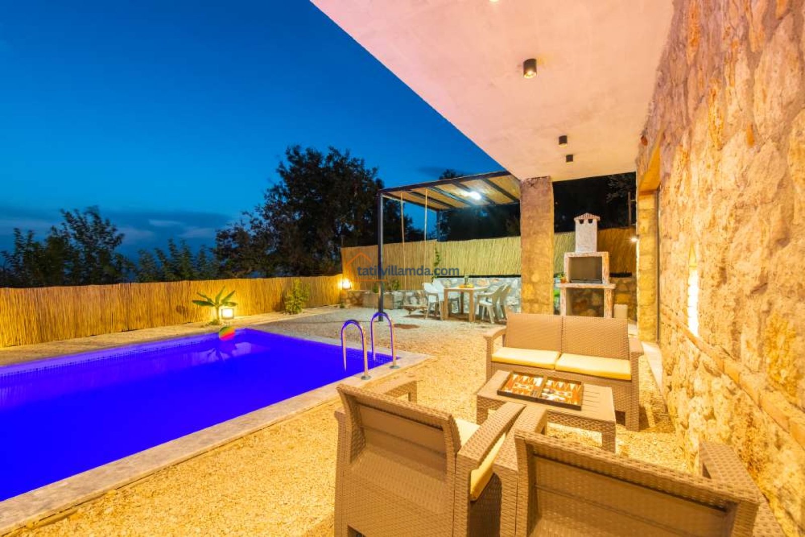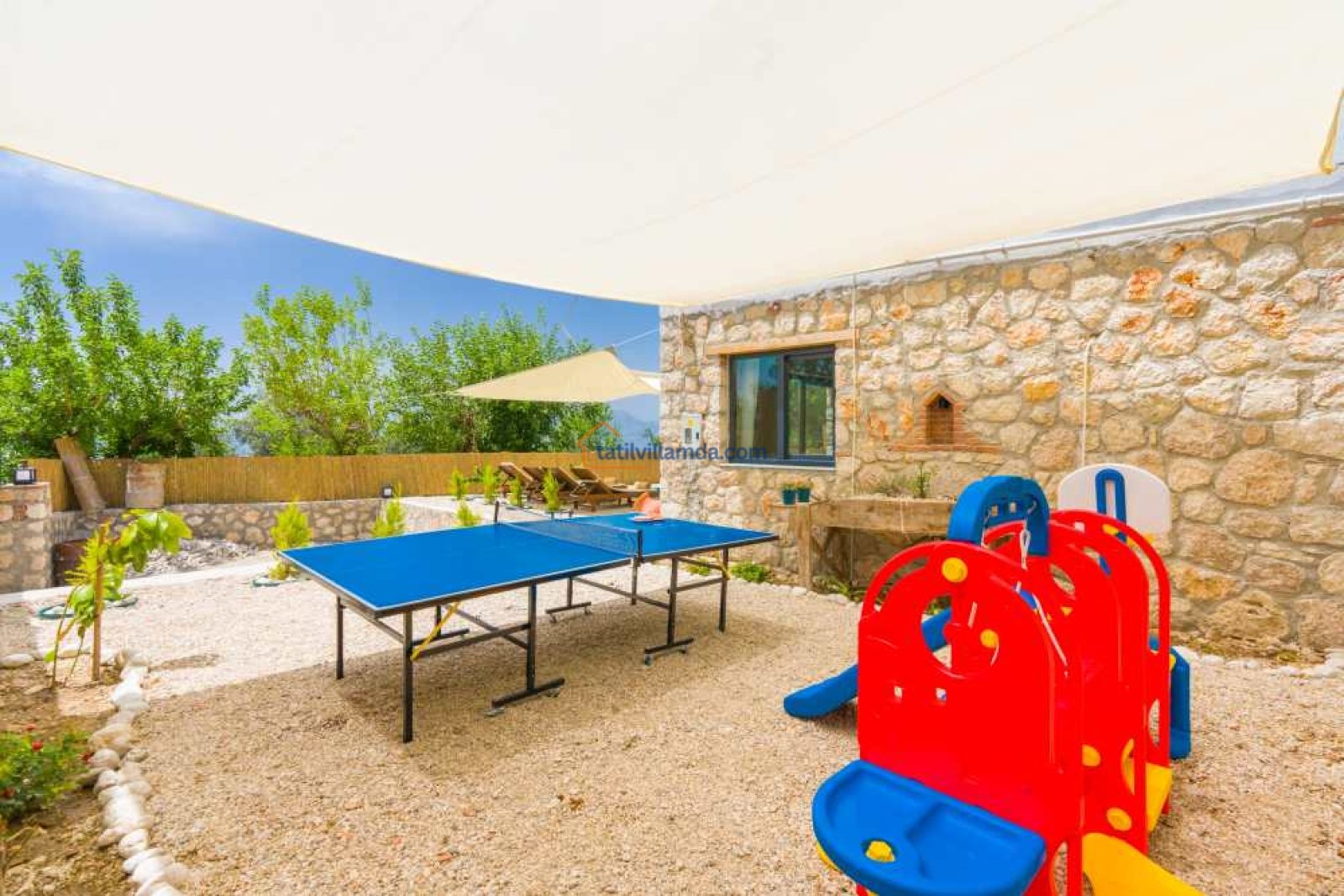 Villanın bahçesinde mini oyun alanı ve masa tenisi bulunuyor, bu da hem çocuklar hem de yetişkinler için eğlenceli vakitler anlamına geliyor. Havuz başında ise konforlu şezlonglar ve bahçe oturma grubu yer almakta; güneşin tadını çıkarırken doğanın sesiyle dinlenebilirsiniz.