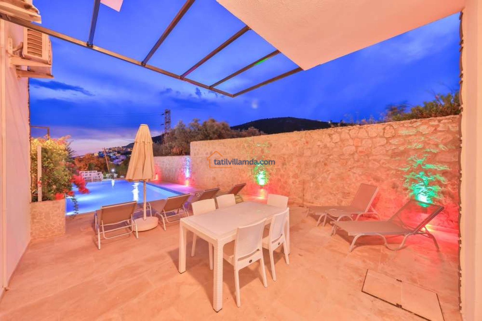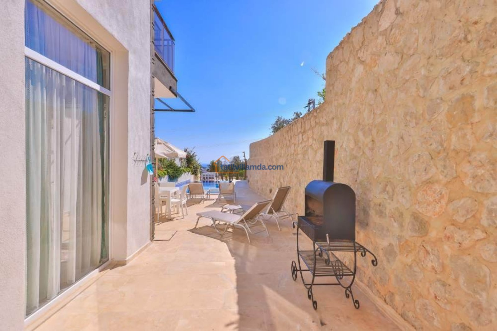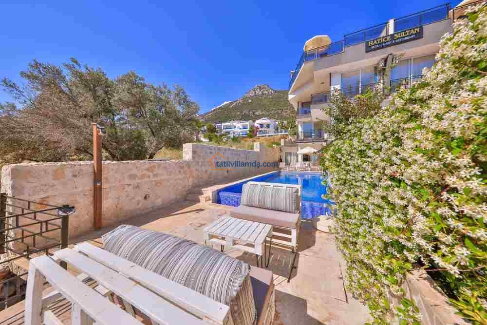 Villanın bahçesinde özel yüzme havuzu, şezlonglar, şemsiye, barbekü ve yemek masası takımı bulunmaktadır. Geniş terası sayesinde gün batımının keyfini çıkarabilir, havuz başında huzurlu anlar yaşayabilirsiniz. Merkezi konumuyla dikkat çeken villa, Kalkan şehir merkezine yalnızca 800 metre, en yakın plaja ise 1.6 km mesafededir. Bu sayede hem doğanın içinde huzurlu bir tatil geçirebilir hem de Kalkan’ın restoranları, kafeleri ve çarşısına kolayca ulaşabilirsiniz.