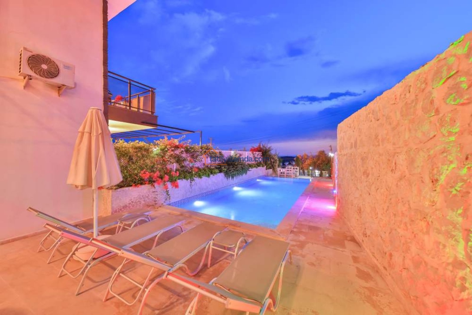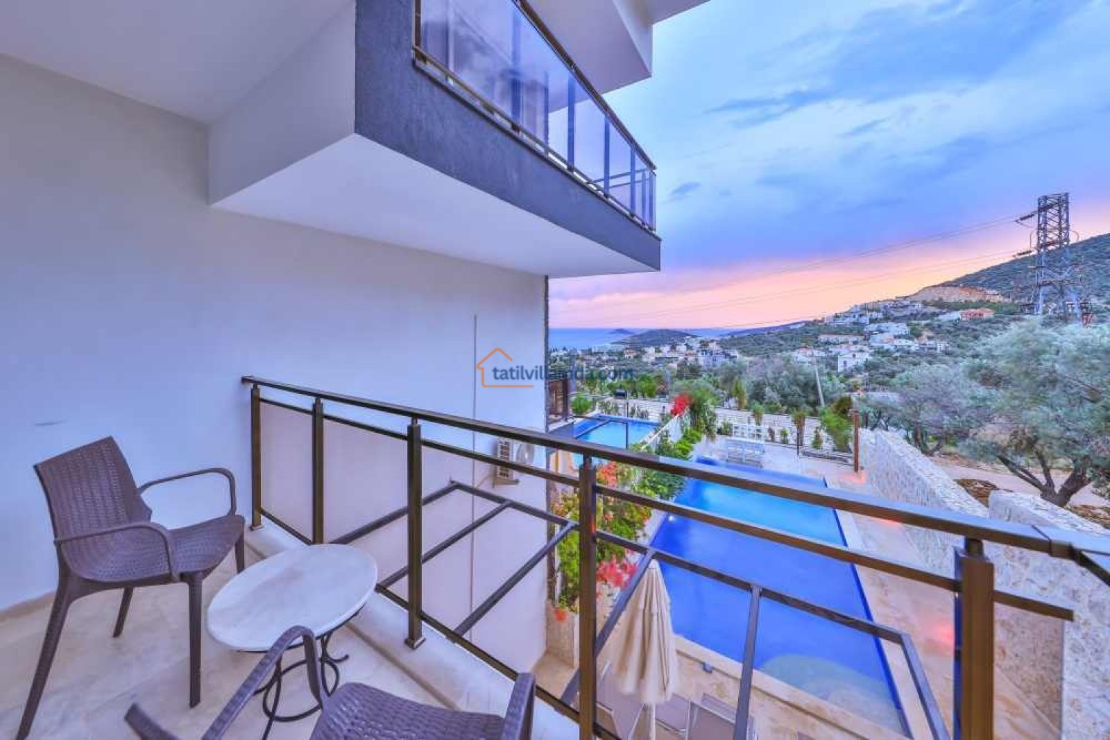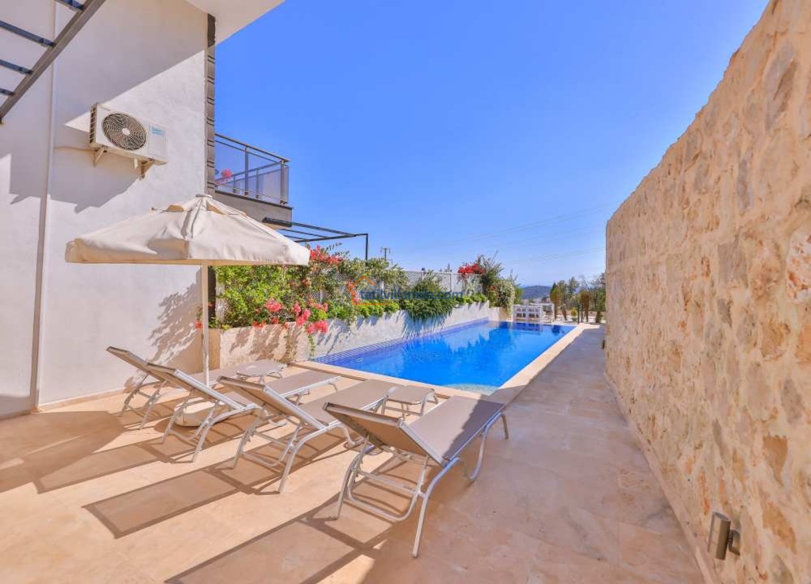 Villanın bahçesinde özel yüzme havuzu, şezlonglar, şemsiye, barbekü ve yemek masası takımı bulunmaktadır. Geniş terası sayesinde gün batımının keyfini çıkarabilir, havuz başında huzurlu anlar yaşayabilirsiniz. Merkezi konumuyla dikkat çeken villa, Kalkan şehir merkezine yalnızca 800 metre, en yakın plaja ise 1.6 km mesafededir. Bu sayede hem doğanın içinde huzurlu bir tatil geçirebilir hem de Kalkan’ın restoranları, kafeleri ve çarşısına kolayca ulaşabilirsiniz.