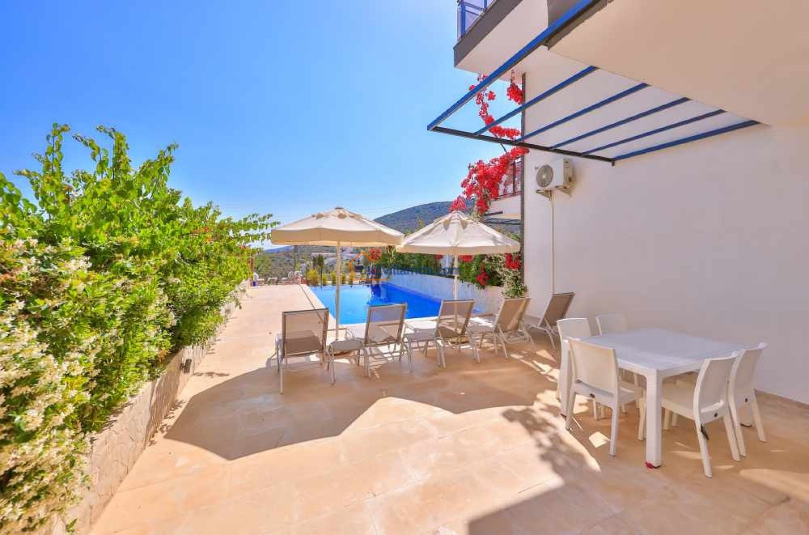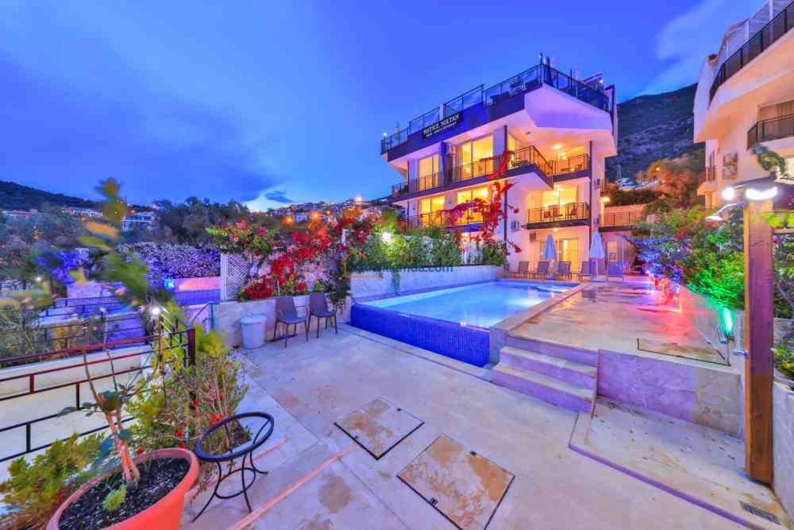 Villanın bahçesinde özel yüzme havuzu, şezlonglar, şemsiye, barbekü ve yemek masası takımı bulunmaktadır. Geniş terası sayesinde gün batımının keyfini çıkarabilir, havuz başında huzurlu anlar yaşayabilirsiniz. Merkezi konumuyla dikkat çeken villa, Kalkan şehir merkezine yalnızca 800 metre, en yakın plaja ise 1.6 km mesafededir. Bu sayede hem doğanın içinde huzurlu bir tatil geçirebilir hem de Kalkan’ın restoranları, kafeleri ve çarşısına kolayca ulaşabilirsiniz.